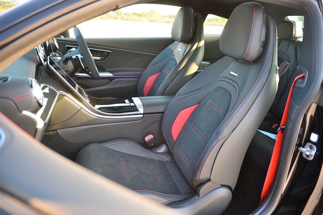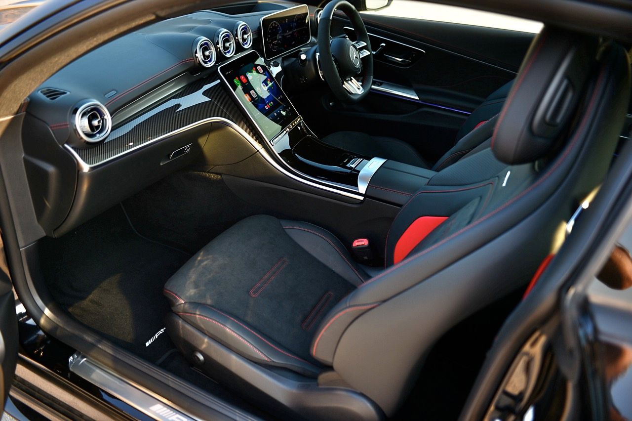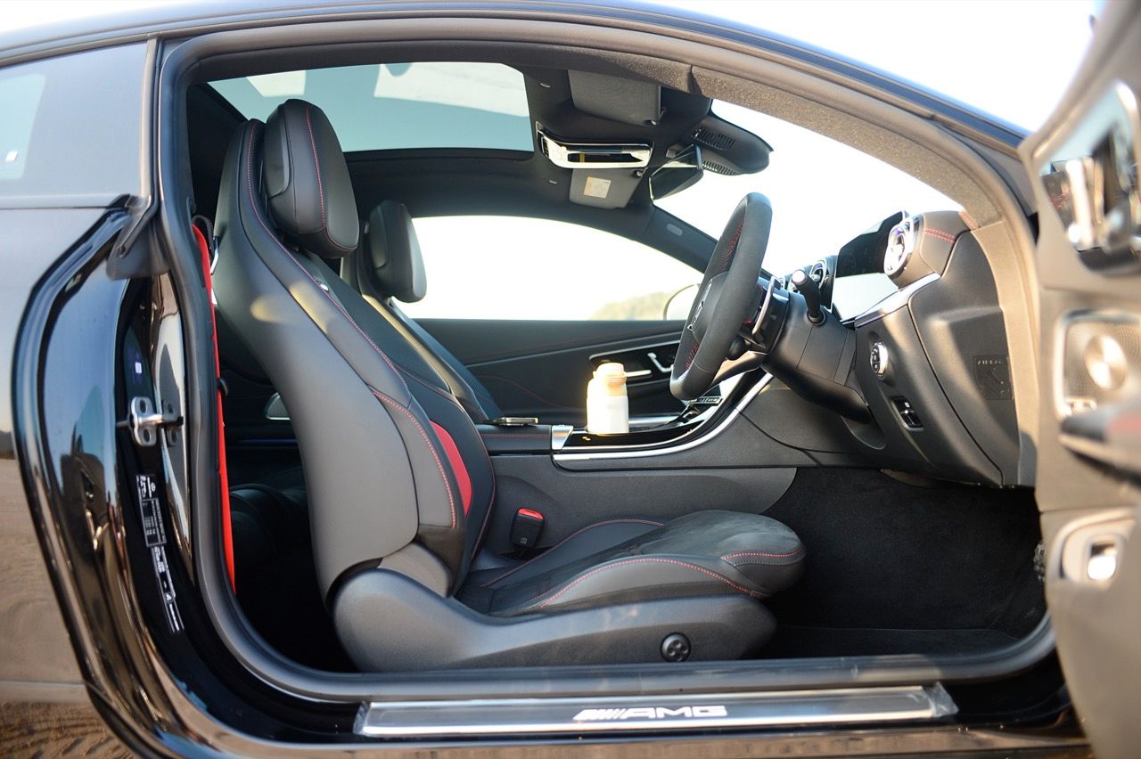 ห้องโดยสารของ Mercedes-AMG CLE 53 4MATIC+ ออกแบบภายใต้คอนเซปต์ Performance Luxury นำความหรูหราจากดีไซน์ของ C-Class และ E-Class ใหม่ มาเติมความดุดันตามสไตล์ AMG เบาะนั่งและพื้นที่โดยสาร (Seating & Space) เบาะหน้า ทรงสปอร์ตหุ้มด้วยหนัง ARTICO / MICROCUT (หรือหนัง Nappa เป็นออปชันเสริม) เดินด้ายสีแดงพร้อมสายเข็มขัดนิรภัยสีแดง ตัวเบาะถูกออกแบบให้มีปีกข้าง (Bolsters) ที่โอบกระชับตัวผู้ขับขี่ในขณะเข้าโค้งแรงๆ พื้นที่เบาะหลัง เนื่องจากเป็นรถคูเป้ 2 ประตู พื้นที่ด้านหลังจะเหมาะสำหรับเด็กหรือผู้ใหญ่รูปร่างสันทัดสำหรับการเดินทางระยะสั้น แต่มีระบบ EASY-ENTRY ที่เบาะหน้าจะเลื่อนไฟฟ้าไปข้างหน้าอัตโนมัติเพื่อให้ขึ้น-ลงได้สะดวกขึ้น ระบบอินโฟเทนเมนท์และหน้าจอ (MBUX Gen 3) ระบบประมวลผลเป็นเวอร์ชันล่าสุดที่ทำงานได้รวดเร็วและรองรับกราฟิก AMG เฉพาะตัว เริ่มจากหน้าจอเรือนไมล์ (Instrument Cluster) ขนาด 12.3 นิ้ว แบบลอยตัว สามารถปรับเปลี่ยนรูปแบบการแสดงผลได้ 3 สไตล์ (Classic, Sport, Supersport) โดยเฉพาะโหมด Supersport วางวัดรอบไว้ตรงกลางพร้อมข้อมูลการขับขี่แบบ Real-time หน้าจอกลาง (Central Display): ขนาด 11.9 นิ้ว ทรงแนวตั้ง (Portrait) เอียงเข้าหาผู้ขับขี่ 6 องศา เพื่อความสะดวกในการใช้งาน รองรับ Wireless Apple CarPlay / Android Auto และมีเมนู AMG TRACK PACE สำหรับบันทึกข้อมูลการขับขี่ในสนาม