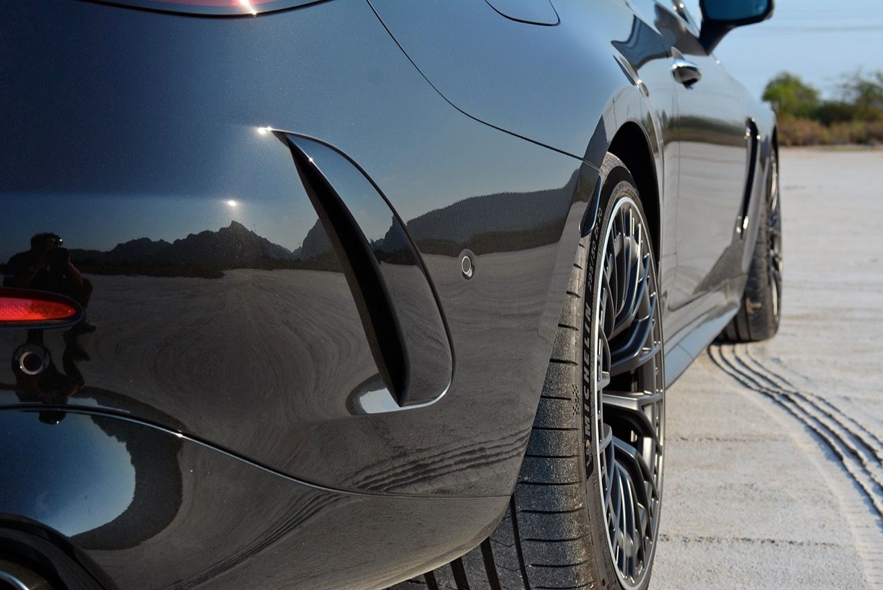 จุดเปลี่ยนสำคัญ ซุ้มล้อหน้าถูกขยายออก 58 มม. ซุ้มล้อหลังขยายออกถึง 75 มม. รองรับฐานล้อที่กว้างขึ้นและการยึดเกาะถนน ของเก่าที่เอามาทำใหม่ คือ Power Domes บนฝากระโปรงหน้ามีเส้นนูน 2 เส้น (Twin Power Domes) เพื่อสื่อถึงพละกำลังของเครื่องยนต์ M256M ที่อยู่ด้านใน บั้นท้ายคือจุดที่มีความสมดุลที่ขัดแย้งกับความไม่สมมาตร ไฟท้าย LED แบบสองตอนเชื่อมต่อกันด้วยแถบสีแดงเข้ม (Dark Red) เสริมด้วยสปอยเลอร์หลังขนาดเล็ก (Lip Spoiler) และปลายท่อไอเสียทรงกลมคู่ 2 ฝั่ง (Quad Exhaust Pipes) มิติตัวถัง (Dimensions) ความยาว 4,851 มม.กว้าง (ไม่รวมกระจกข้าง) 1,935 มม. (+58 มม. จากรุ่นปกติ) สูง 1,428 มม. ความยาวฐานล้อ 2,865 มม. ความกว้างช่วงล้อหน้า (Front Track) 1,661 มม. ความกว้างช่วงล้อหลัง (Rear Track) 1,657 มม. พื้นที่เก็บสัมภาระท้าย 420 ลิตร