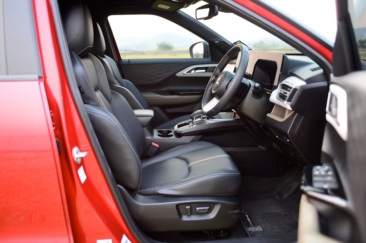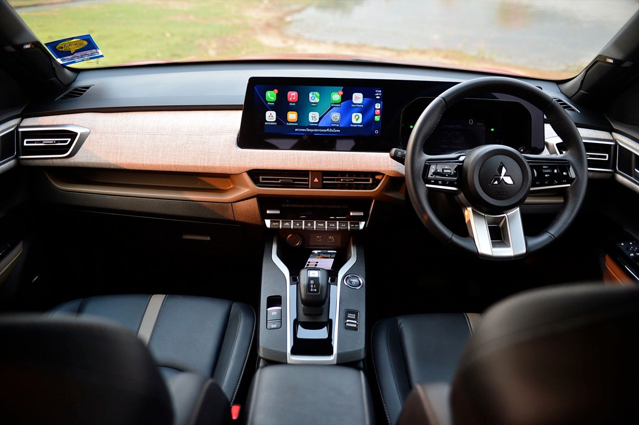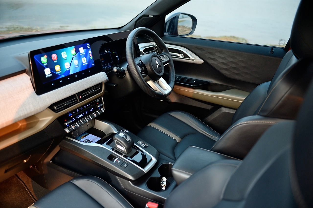 ห้องโดยสารสีทูโทนสว่างตาในส่วนของแดชบอร์ดคอนโซลที่มีการใช้ผ้าสีเทามาหุ้มกับพลาสติกที่มีโทนสีตัดกัน เบาะปรับไฟฟ้าหุ้มหนัง ตัวเบาะนั่งสบายใช้ได้ การปรับเบาะค่อนข้างครอบคลุมต่อสรีระของคนขับ ตำแหน่งการใช้อุปกรณ์ โดยเฉพาะจอภาพมอนิเตอร์กลางกับคันเกียร์ที่จับหรือแตะได้อย่างถนัดมือ พื้นที่ของเบาะคู่หน้ามีพอเพียง รวมถึงเบาะหลังปรับได้แบบ 40:20:40 หรือปรับเอนได้ 8 ระดับเพื่อเอนหลังสบายๆเวลาเดินทางไกล เบาะหลังมีพื้นที่วางเท้ามากพอ การออกแบบแนวของหลังคาและความสูงทำให้นั่งเบาะหลังแล้วไม่อึดอัด แต่นั่งสองคนสบายตัวกว่านั่งเบียดกันไปถึงสามคน Mitsubishi แจ้งว่า หนังสังเคราะห์ที่ใช้หุ้มเบาะเป็นแบบ Heat Guard ช่วยป้องกันและสะท้อนความร้อนจากแสงแดด ไม่มีหลังคาพาโนรามิกไฟฟ้า นั่นตัดปัญหาเรื่องน้ำรั่วเมื่อใช้งานไปนานๆออกไปได้ แต่ก็ไม่ครบเท่าที่ลูกค้าบางคนอยากจะได้ในจุดนี้