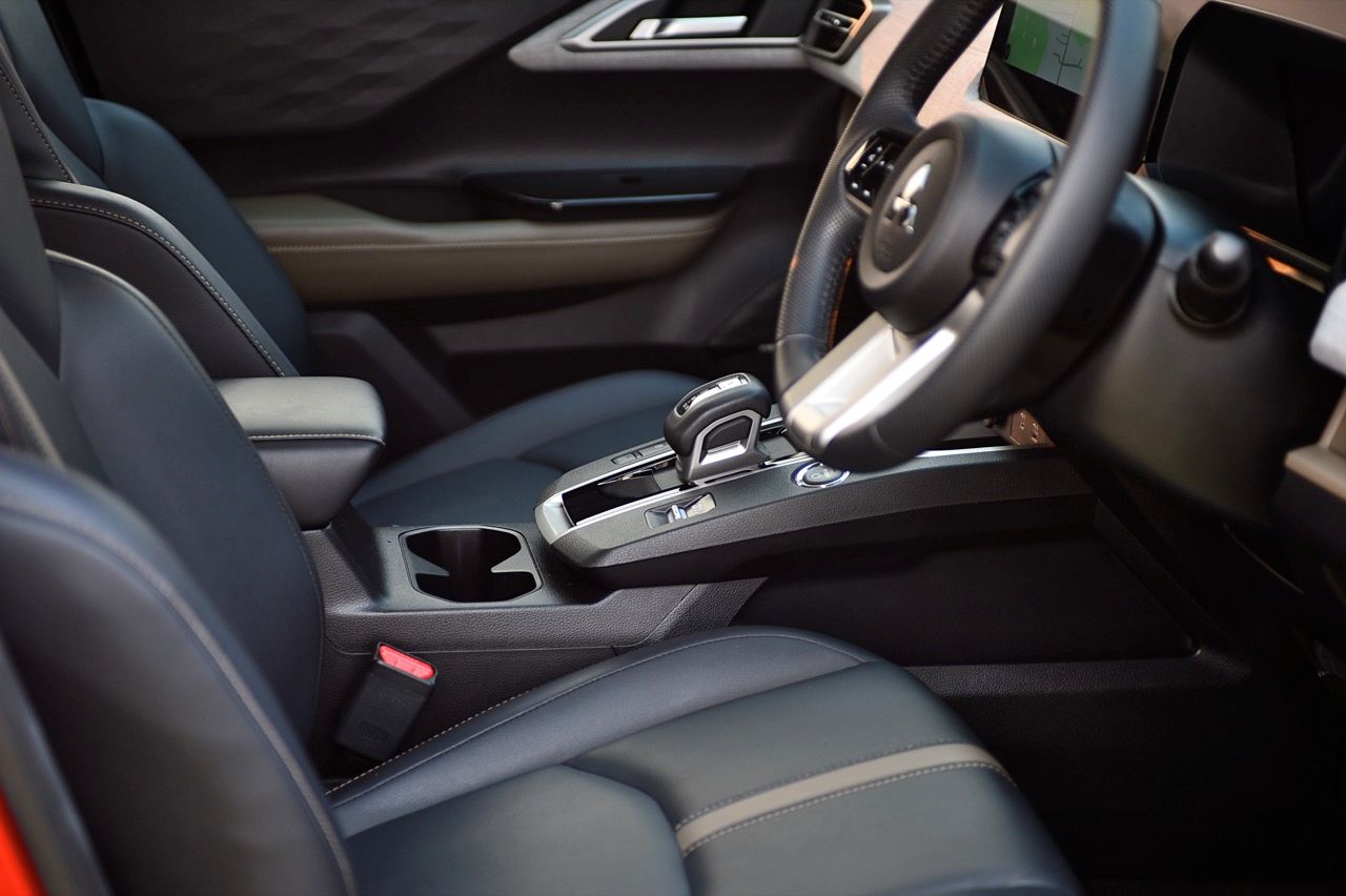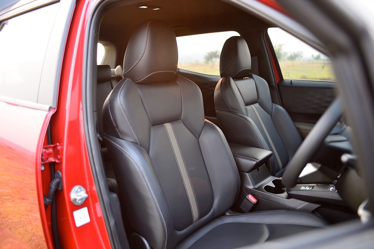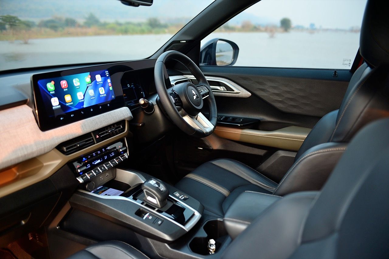 ห้องโดยสารสีทูโทนสว่างตาในส่วนของแดชบอร์ดคอนโซลที่มีการใช้ผ้าสีเทามาหุ้มกับพลาสติกที่มีโทนสีตัดกัน เบาะปรับไฟฟ้าหุ้มหนัง ตัวเบาะนั่งสบายใช้ได้ การปรับเบาะค่อนข้างครอบคลุมต่อสรีระของคนขับ ตำแหน่งการใช้อุปกรณ์ โดยเฉพาะจอภาพมอนิเตอร์กลางกับคันเกียร์ที่จับหรือแตะได้อย่างถนัดมือ พื้นที่ของเบาะคู่หน้ามีพอเพียง รวมถึงเบาะหลังปรับได้แบบ 40:20:40 หรือปรับเอนได้ 8 ระดับเพื่อเอนหลังสบายๆเวลาเดินทางไกล เบาะหลังมีพื้นที่วางเท้ามากพอ การออกแบบแนวของหลังคาและความสูงทำให้นั่งเบาะหลังแล้วไม่อึดอัด แต่นั่งสองคนสบายตัวกว่านั่งเบียดกันไปถึงสามคน Mitsubishi แจ้งว่า หนังสังเคราะห์ที่ใช้หุ้มเบาะเป็นแบบ Heat Guard ช่วยป้องกันและสะท้อนความร้อนจากแสงแดด ไม่มีหลังคาพาโนรามิกไฟฟ้า นั่นตัดปัญหาเรื่องน้ำรั่วเมื่อใช้งานไปนานๆออกไปได้ แต่ก็ไม่ครบเท่าที่ลูกค้าบางคนอยากจะได้ในจุดนี้