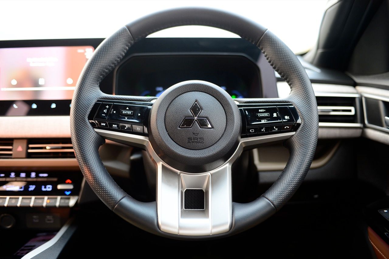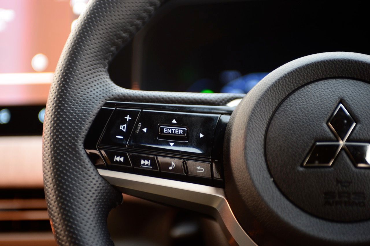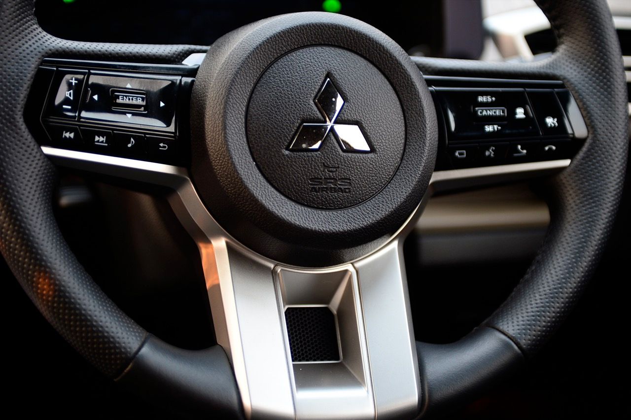 พวงมาลัยทรงสามก้านแบบใหม่ของ Mitsubishi Motor หุ้มหนังรอบวงเพิ่มความกระชับ พวงมาลัยมีขนาดกำลังพอดี มีหน้าตาคล้ายๆกับพวงมาลัยของ Xpender ก้านวง มีสวิชท์สั่งงานต่างๆ ติดตั้งอยู่เต็มไปหมด ก้านวงด้านขวา เป็นสวิชท์สั่งงานของระบบ Adaptive Cruise Control ส่วนด้านซ้ายใช้ควบคุมและปรับตั้งจอภาพมาตรวัด ปุ่มควบคุมระดับเสียงของลำโพง ปุ่มรับหรือวางสายโทรศัพท์ ปุ่มเลือกฟังก์ชันของระบบอินโฟเทนเมนท์