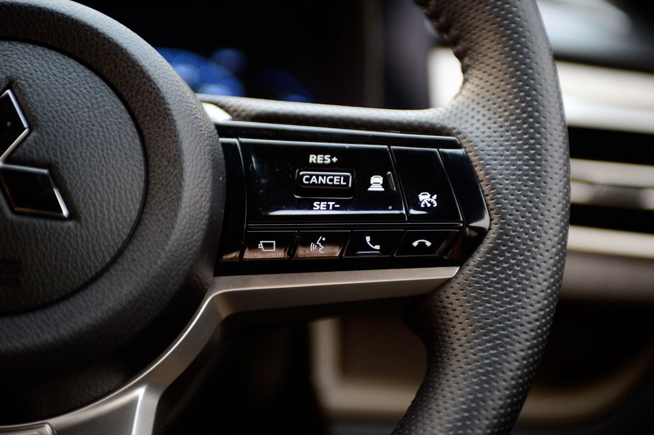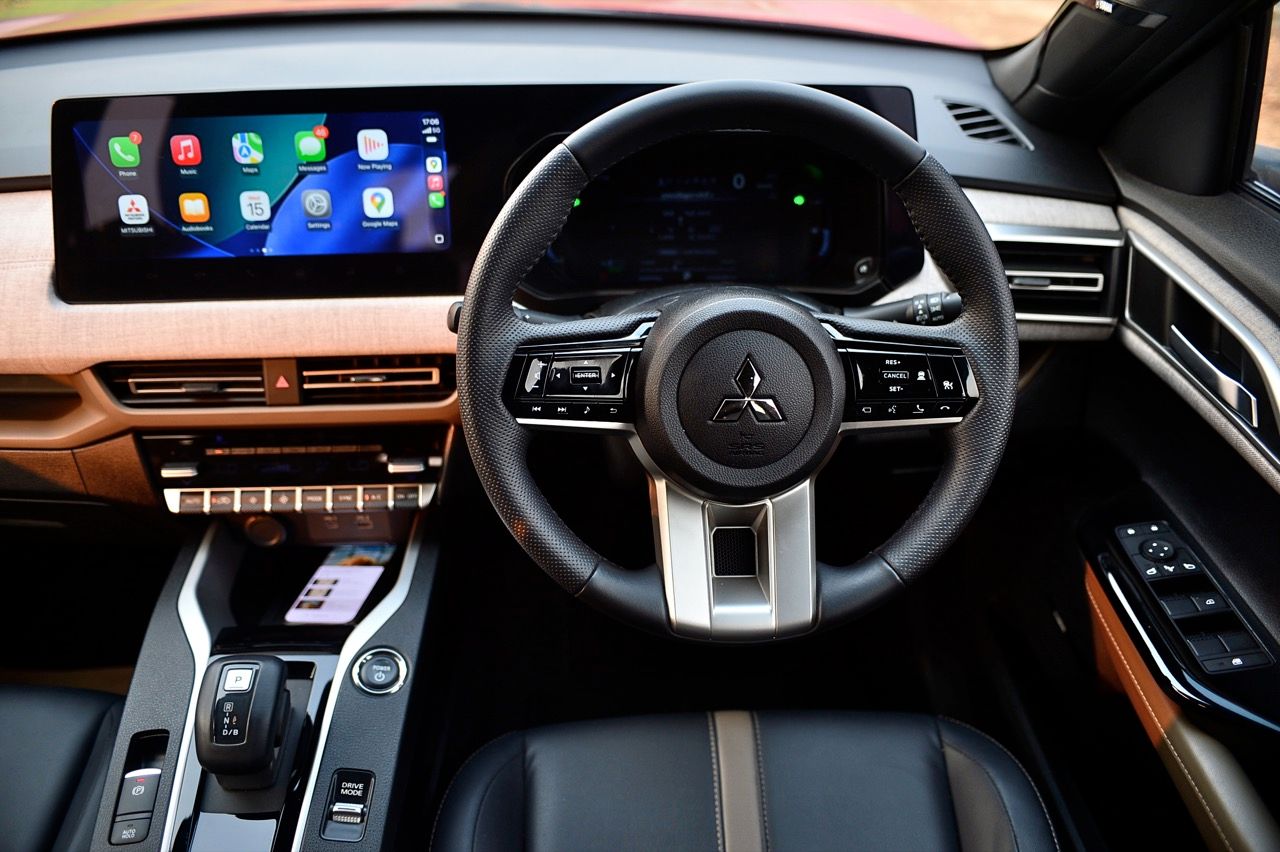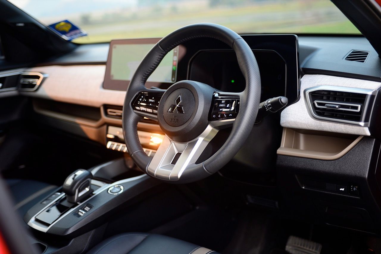 พวงมาลัยทรงสามก้านแบบใหม่ของ Mitsubishi Motor หุ้มหนังรอบวงเพิ่มความกระชับ พวงมาลัยมีขนาดกำลังพอดี มีหน้าตาคล้ายๆกับพวงมาลัยของ Xpender ก้านวง มีสวิชท์สั่งงานต่างๆ ติดตั้งอยู่เต็มไปหมด ก้านวงด้านขวา เป็นสวิชท์สั่งงานของระบบ Adaptive Cruise Control ส่วนด้านซ้ายใช้ควบคุมและปรับตั้งจอภาพมาตรวัด ปุ่มควบคุมระดับเสียงของลำโพง ปุ่มรับหรือวางสายโทรศัพท์ ปุ่มเลือกฟังก์ชันของระบบอินโฟเทนเมนท์