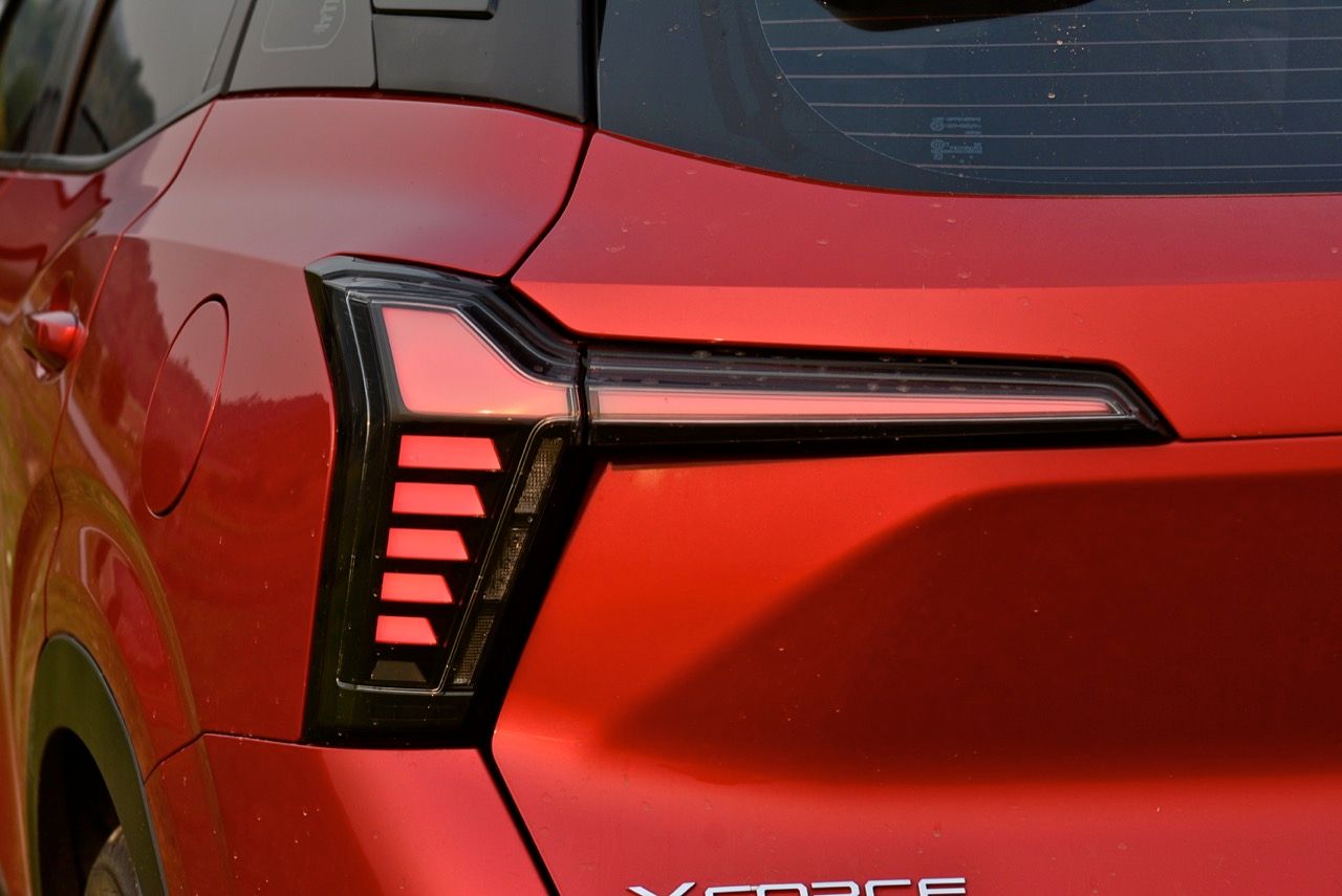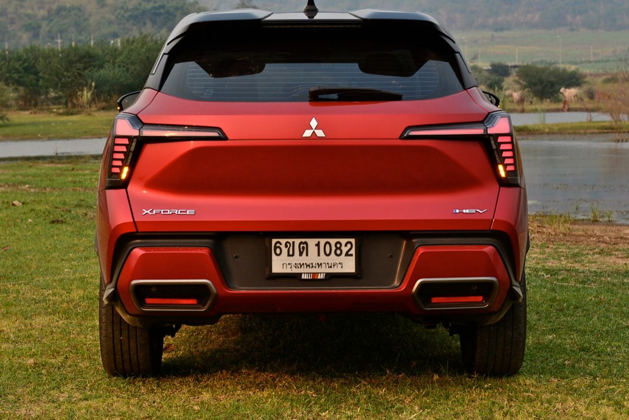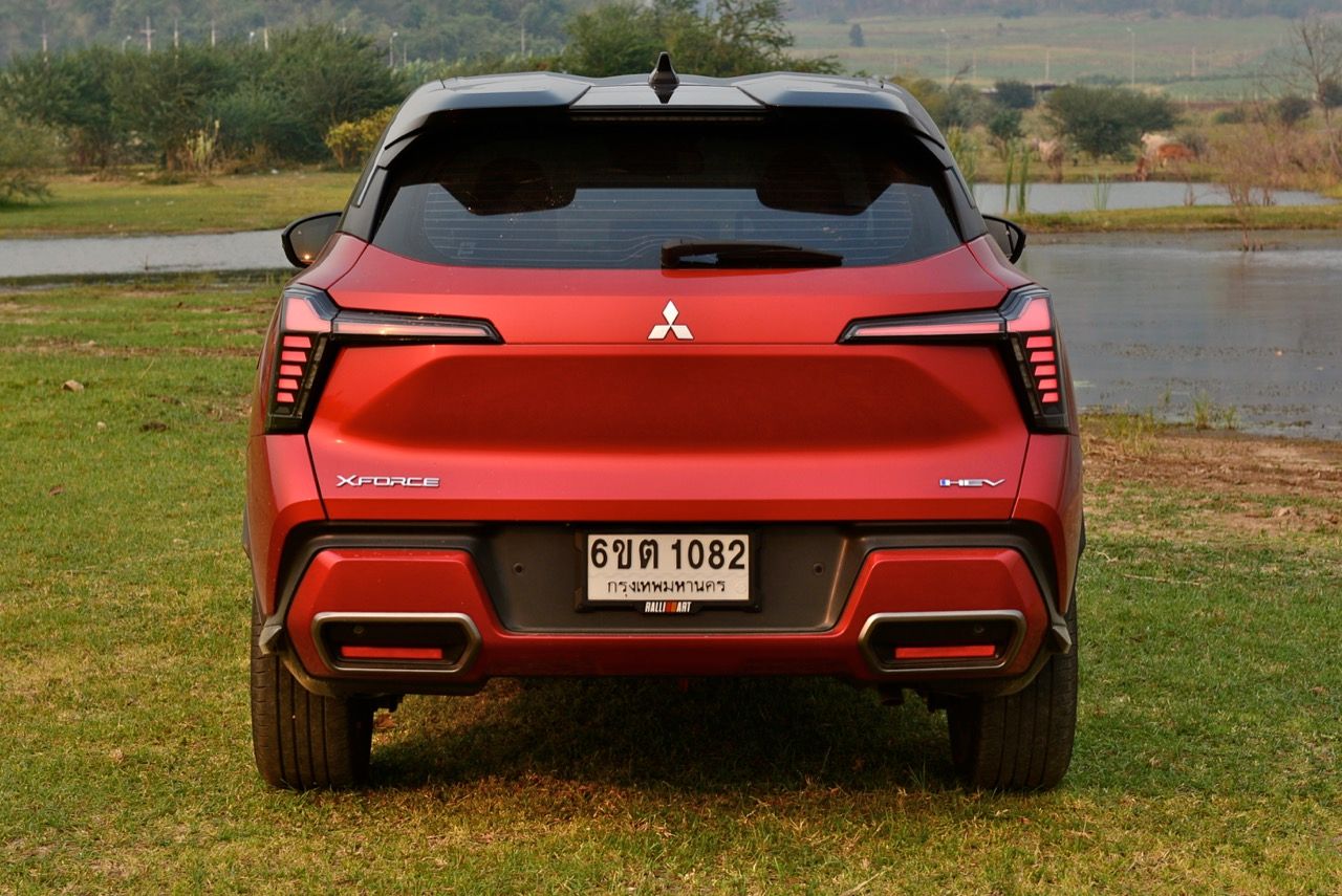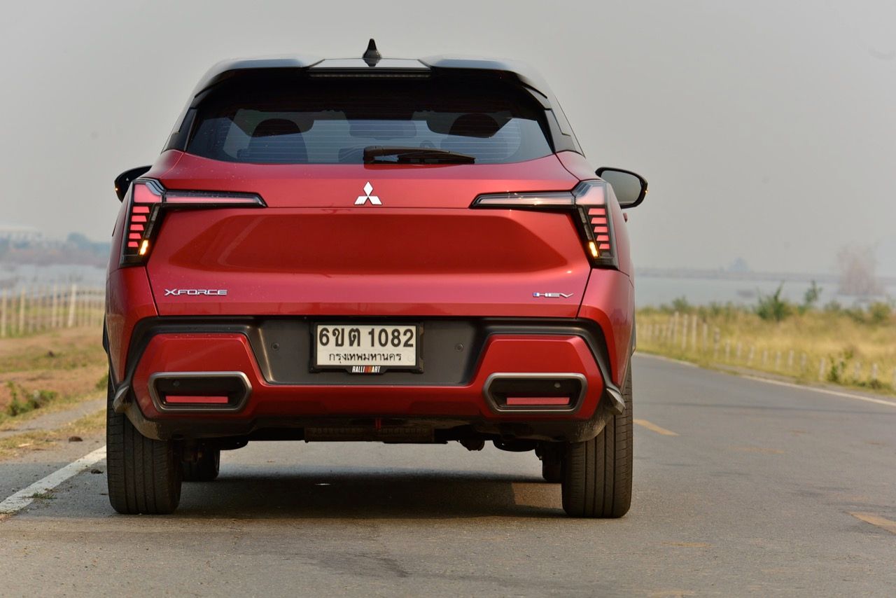 บั้นท้ายใช้ฟท้าย LED มีดีไซน์ขอบตวัดลงด้านล่างที่แปลกตา ฝาท้ายไฟฟ้า พร้อมเซนเซอร์ กันชนหลังออกแบบได้ดีเพื่อเพิ่มมิติความคมชัดและลึกของทั้งฝาท้ายและกันชนที่เชื่อมต่อกัน ไม่มีส่วนไหนที่ดูขาด หรือเกินสำหรับรูปลักษณ์ภายนอกของ Mitsubishi Xforce โดยเฉพาะองศาความลาดเอียงของเสาหน้า กับเสาท้ายขนาดใหญ่บนสีตัวถังแบบทูโทนที่ทำให้รถดูทันสมัยมากยิ่งขึ้น