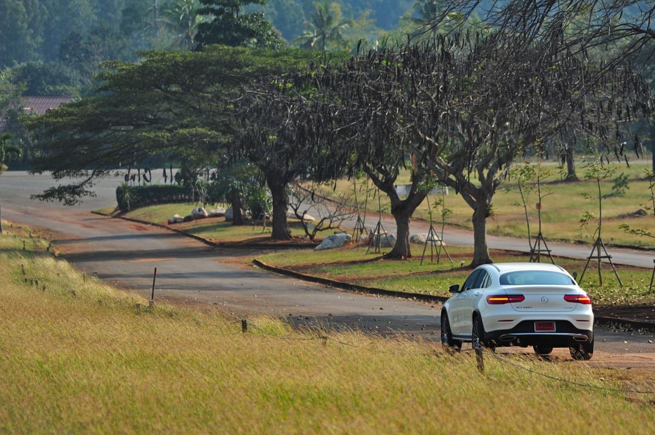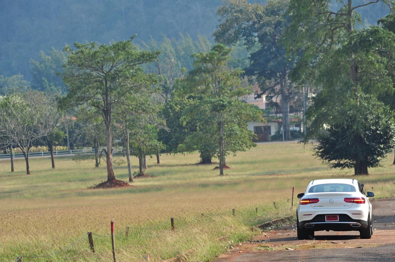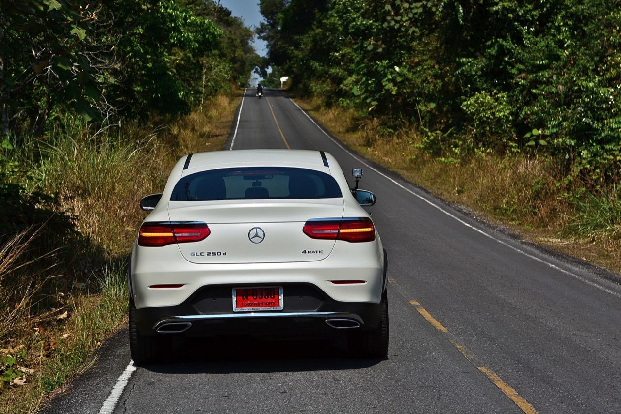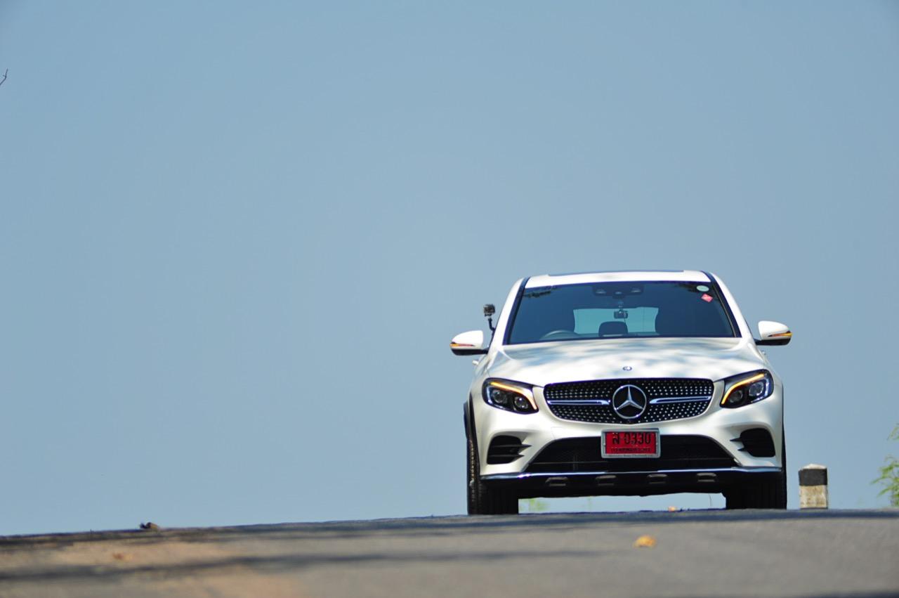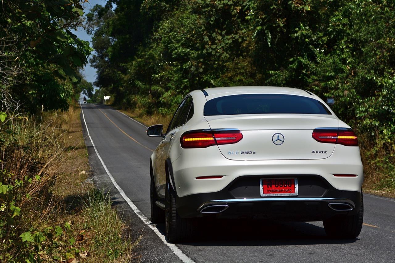 กำลังมหาศาลของเครื่องดีเซลกะทัดรัดส่งถ่ายลงไปยังล้อทั้ง 4 โดยให้ความรู้สึกแบบค่อยเป็นค่อยไป แต่เข็มวัดความเร็วกลับตวัดอย่างรวดเร็ว ขัดแย้งกับความนิ่งของมัน เมื่อผมพยายามผลักดันให้มันทะยานเข้าไปในขีดจำกัดของตัวรถ ความเร็วเพิ่มขึ้นเรื่อยๆ ในลักษณะไหลไม่ใช่กระชากกระชั้นเหมือนรถสปอร์ตคันเล็ก ซึ่งเป็นเรื่องที่ดีที่ Mercedes Benz นั้นใส่ใจในเรื่องของความสบายและความปลอดภัยมากเป็นพิเศษ การวิ่งแบบนิ่งๆ ในย่านความเร็วสูงคือความถนัดของ GLC Coupe ไม่ว่าจะใส่มาหนักขนาดไหนหากผิวถนนเรียบพอ คุณจะรับรู้ได้เลยว่าหมอนี่เกาะถนนมากกว่ารูปแบบ SUV อย่างสิ้นเชิง มันคล้ายกับการวิ่งที่ยอดเยี่ยมของ Porsche Macan คู่แข่งที่วางเครื่องยนต์ V6 เพียงแต่ Porsche นั้นให้ความรู้สึกถึงแรงดึงที่มากกว่า ส่วน GLC 250d Coupe การอัดแบบเต็มเหนี่ยวมาพร้อมกับความเสถียร ซึ่งเกิดขึ้นจากล้อไซส์ยักษ์ขอบ 20 นิ้ว กับยางแก้มเตี้ยประสิทธิภาพดีของมิชลินนั่นเอง