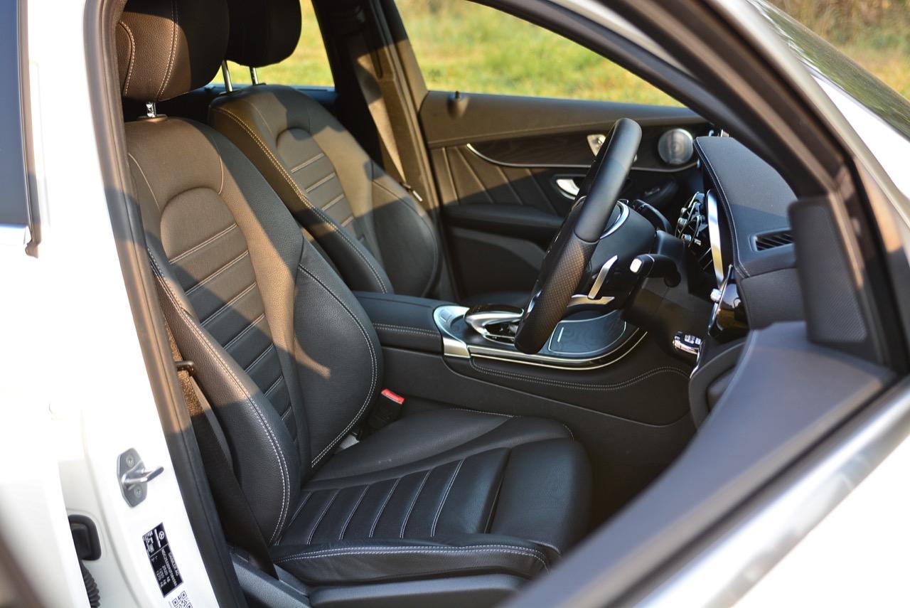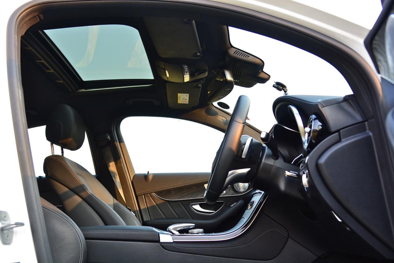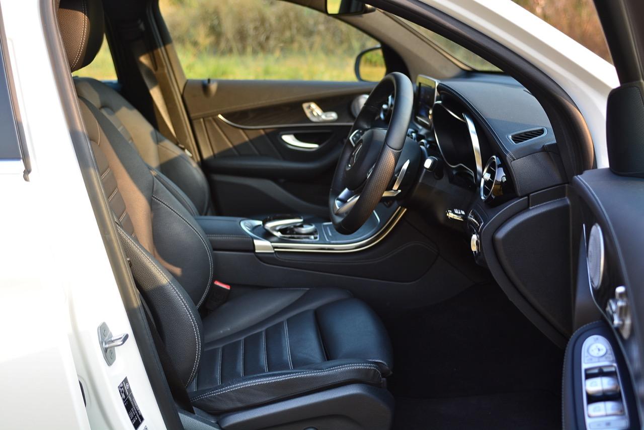 ภายในของ GLC 250d Coupe AMG Dynamic Plus 4MATIC รุ่นแพงสุดของ GLC ที่ขายในประเทศไทยคล้ายกับ New C-Class W205 ไม่ว่าจะเป็นคอนโซล แดชบอร์ดแบบพลาสติกขึ้นรูปหุ้มด้วยงานหนังเย็บเดินตะเข็บด้วยด้ายสีขาว วัสดุหรูหราราคาแพงพวกพลาสติกเกรดสูง อลูมินั่มอัลลอย ลายไม้สีดำด้านคล้ายเอาถ่านไม้ชิ้นโตมาประดับประดาที่บริเวณคอนโซลกลาง เบาะหุ้มหนังแท้ทุกตำแหน่ง เบาะคู่หน้าของคนขับและผู้โดยสารปรับไฟฟ้าพร้อมหน่วยความจำ 3 ตำแหน่ง รูปแบบของตัวเบาะในรถ GLC Coupe แตกต่างจากโมเดลอื่นๆ ของแบรนด์ตราดาว เป็นเบาะทรงสปอร์ตที่สามารถปรับให้ด้านข้างกระชับหรือผ่อนคลายสำหรับการขับที่มีความหลากหลายทั้งขับเร็วๆ หรือขับแบบคลานไปเรื่อยๆ เมื่อต้องลุยทางวิบาก