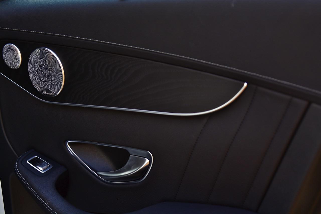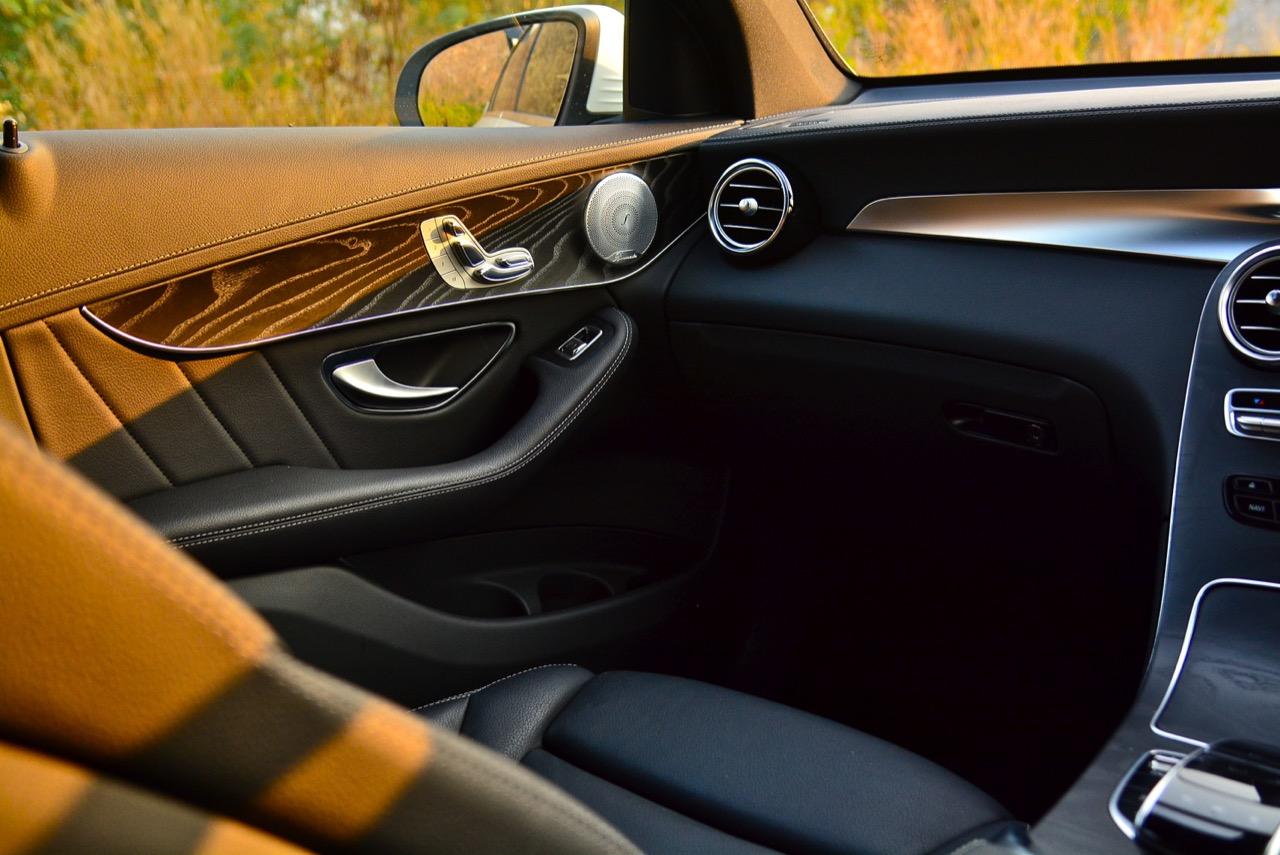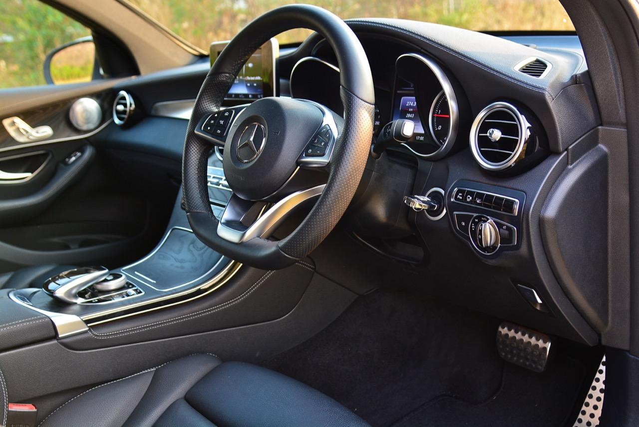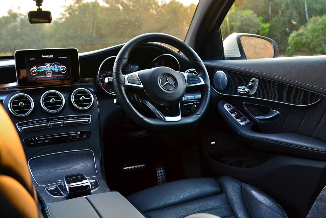 ภายในของ GLC 250d Coupe AMG Dynamic Plus 4MATIC รุ่นแพงสุดของ GLC ที่ขายในประเทศไทยคล้ายกับ New C-Class W205 ไม่ว่าจะเป็นคอนโซล แดชบอร์ดแบบพลาสติกขึ้นรูปหุ้มด้วยงานหนังเย็บเดินตะเข็บด้วยด้ายสีขาว วัสดุหรูหราราคาแพงพวกพลาสติกเกรดสูง อลูมินั่มอัลลอย ลายไม้สีดำด้านคล้ายเอาถ่านไม้ชิ้นโตมาประดับประดาที่บริเวณคอนโซลกลาง เบาะหุ้มหนังแท้ทุกตำแหน่ง เบาะคู่หน้าของคนขับและผู้โดยสารปรับไฟฟ้าพร้อมหน่วยความจำ 3 ตำแหน่ง รูปแบบของตัวเบาะในรถ GLC Coupe แตกต่างจากโมเดลอื่นๆ ของแบรนด์ตราดาว เป็นเบาะทรงสปอร์ตที่สามารถปรับให้ด้านข้างกระชับหรือผ่อนคลายสำหรับการขับที่มีความหลากหลายทั้งขับเร็วๆ หรือขับแบบคลานไปเรื่อยๆ เมื่อต้องลุยทางวิบาก