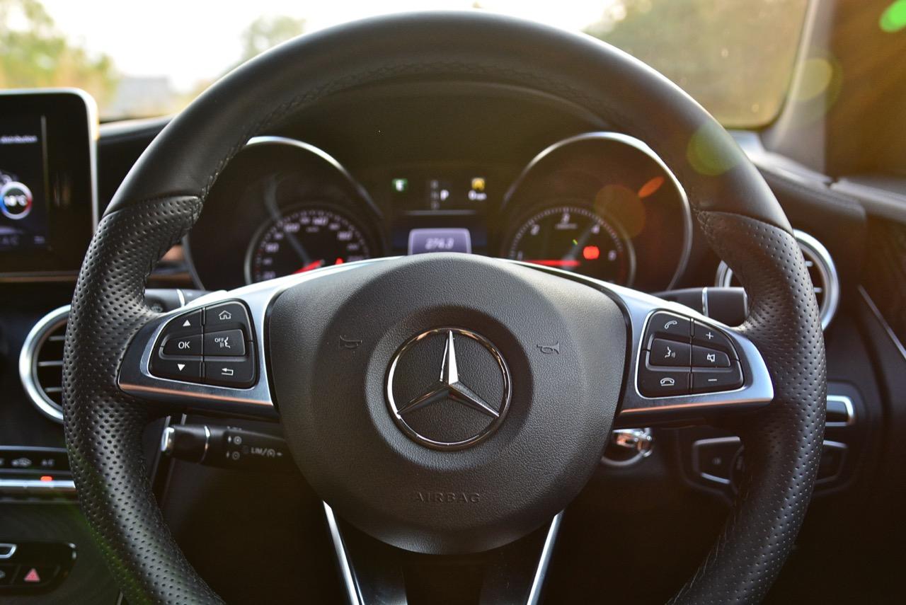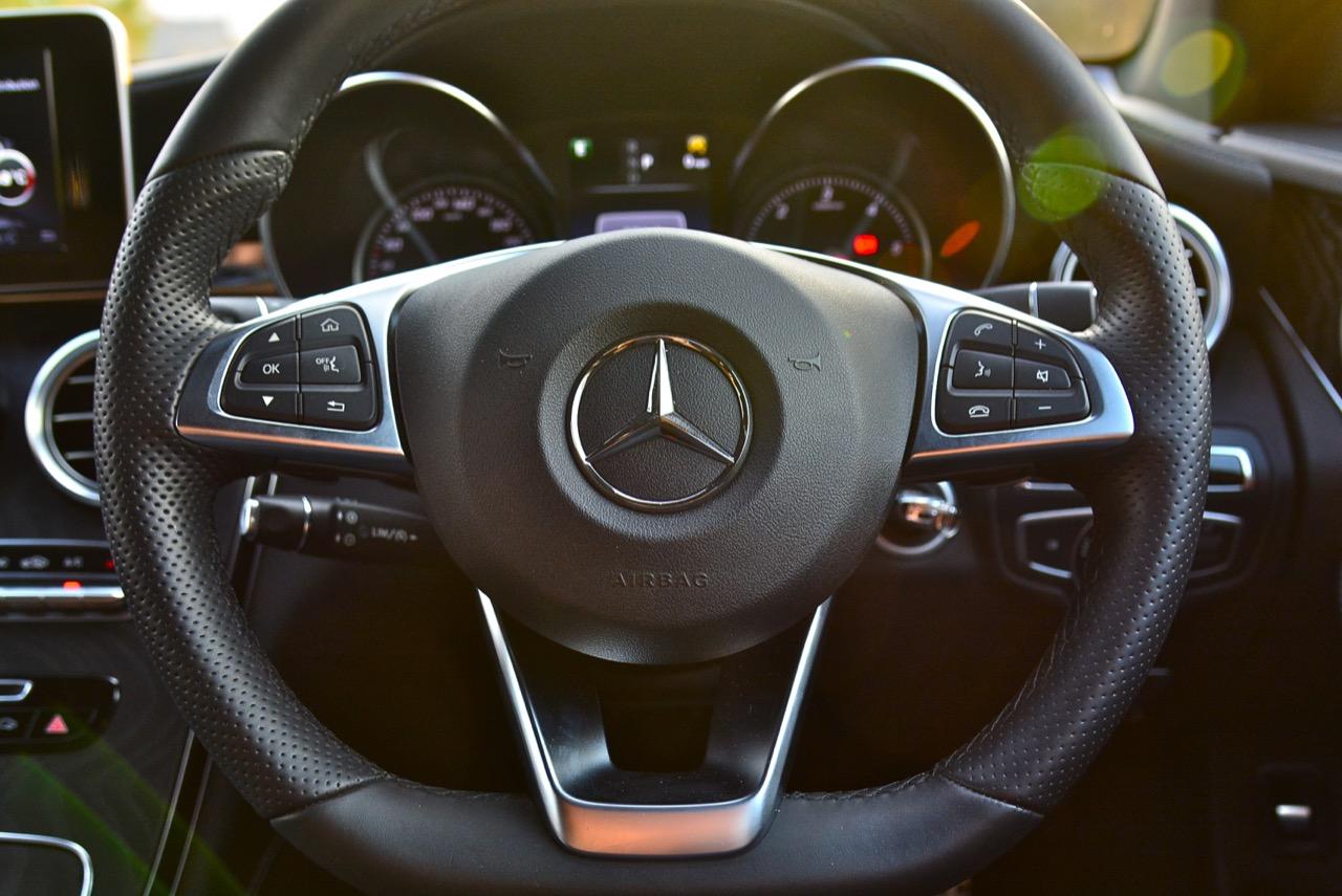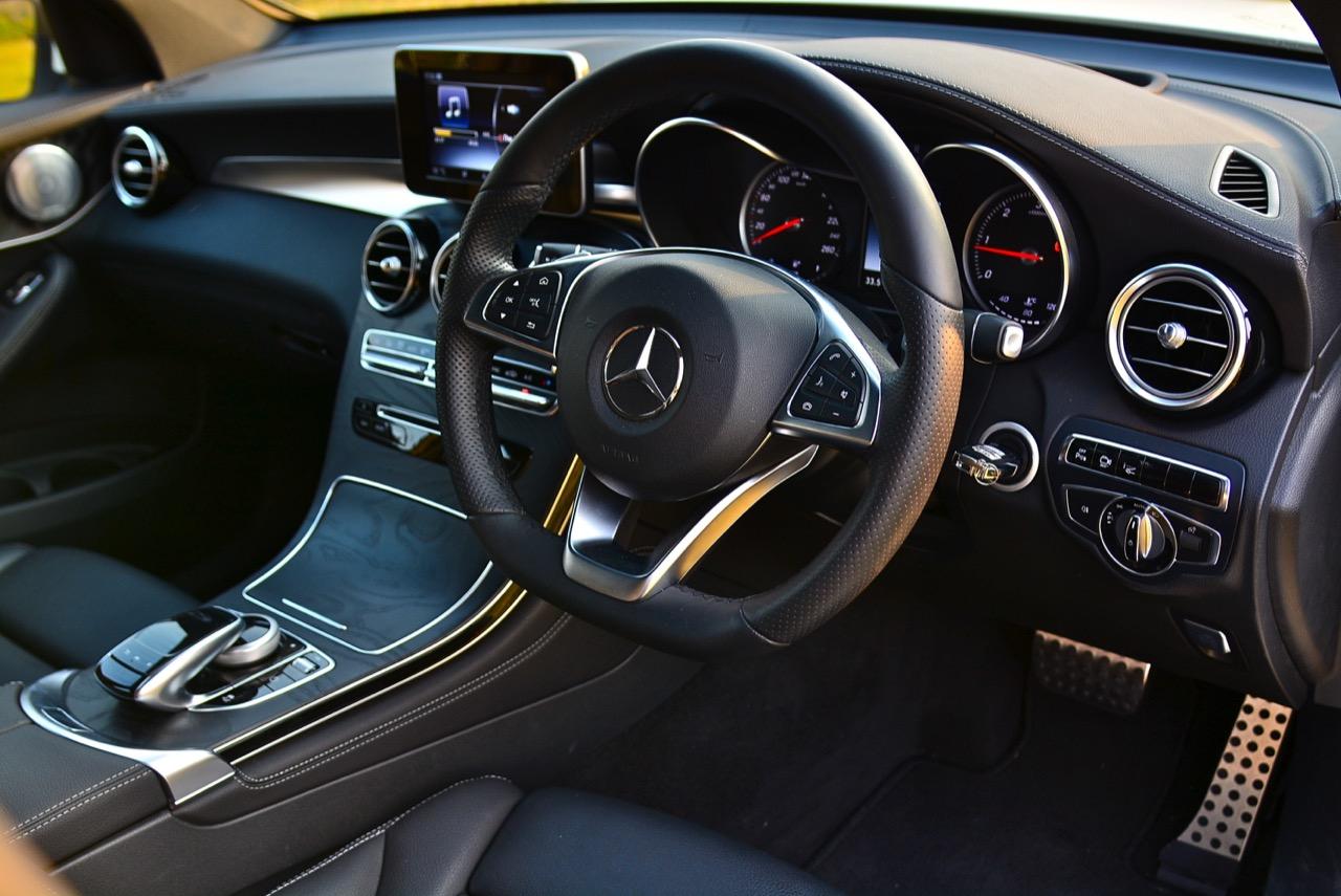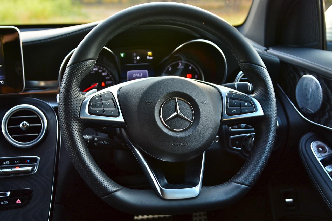 พวงมาลัยแบบสปอร์ต 3 ก้าน ทำจากอัลลอย หนังและพลาสติก เป็นพวงมาลัยทรงฐานตัดของ AMG ที่สวยงามออกแนวสปอร์ต หุ้มรอบวงด้วยหนังแท้พร้อมร่องกริ้บที่ช่วยให้กระชับ พวงมาลัยของ GLC Coupe ยังมีสวิตช์มัลติฟังก์ชั่นสำหรับการรับสายหรือวางโทรศัพท์มือถือ ก้านสวิตช์ของระบบปรับตั้งความเร็วอัตโนมัติ Cruise Control ก้านเปลี่ยนตำแหน่งเกียร์ที่ด้านขวาของพวงมาลัย กับแป้นชิฟเกียร์ Paddle Shift ขนาดเล็กที่หลังพวงมาลัย