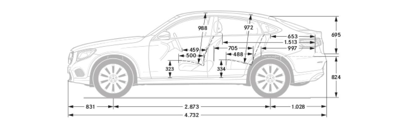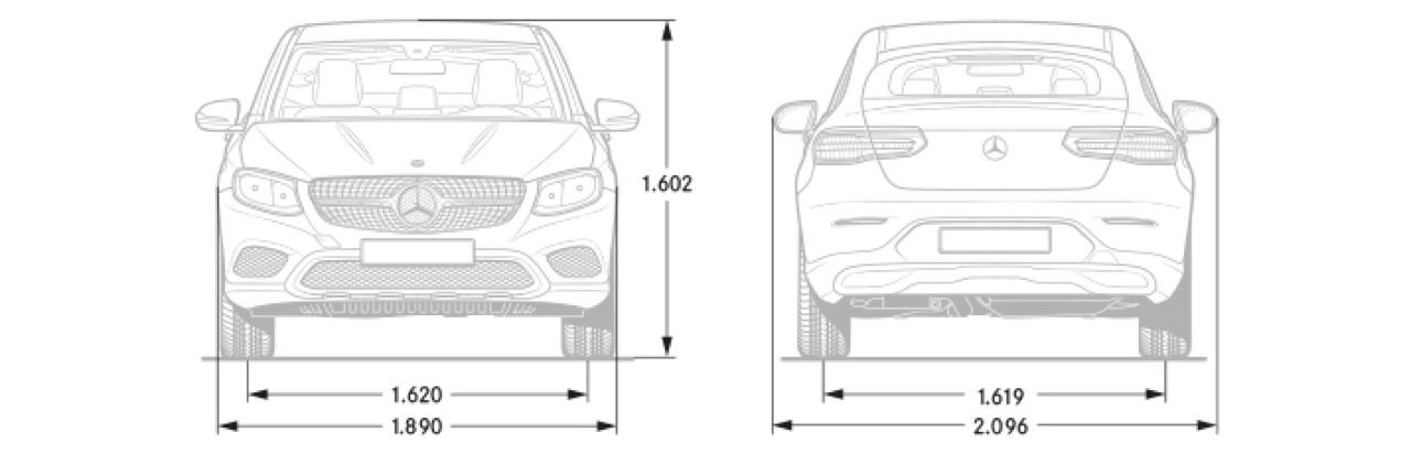 การควบรวมกันของรถ SUV รุ่น GLC มีตัวถัง 2 แบบให้ลูกค้าเลือก รุ่นมาตรฐานที่ออกขายก่อนหน้านี้คือคู่ต่อสู้โดยตรงของ BMW X3 สำหรับ GLC Coupe รุ่นท้ายลาดคันรีวิวที่กลายเป็นคู่แข่งของ BMW X4 มีความยาวด้านนอกของ 4,732 มิลลิเมตร กว้าง 1,890 มิลลิเมตร สูง 1,602 มิลลิเมตร ระยะฐานล้อ 2,873 มิลลิเมตร ระยะห่างล้อคู่หน้า 1,620 มิลลิเมตร ระยะห่างล้อคู่หลัง 1,619 มิลลิเมตร น้ำหนัก 1,845 กิโลกรัม เปรียบเทียบกับ BMW X4 ที่มีขนาดความยาว 4,671 มิลลิเมตร กว้าง 1,881 มิลลิเมตร และสูง 1,624 มิลลิเมตร ฐานล้อของ X4 ยาว 2,810 มิลลิเมตร ระยะห่างล้อคู่หน้า 1,616 มิลลิเมตร ระยะห่างล้อคู่หลัง 1,632 มิลลิเมตร หนัก 1,825 กิโลกรัม จะเห็นได้อย่างชัดเจนว่า GLC Coupe นั้นมีความยาวและความกว้างมากกว่าเล็กน้อย ส่วนความสูงนั้น GLC Coupe เตี้ยกว่า X4 แค่ 22 มิลลิเมตร รถทั้งสองรุ่นสองยี่ห้อจึงมีความใกล้เคียงกันมากทั้งเรือนร่างและประสิทธิภาพของการขับขี่