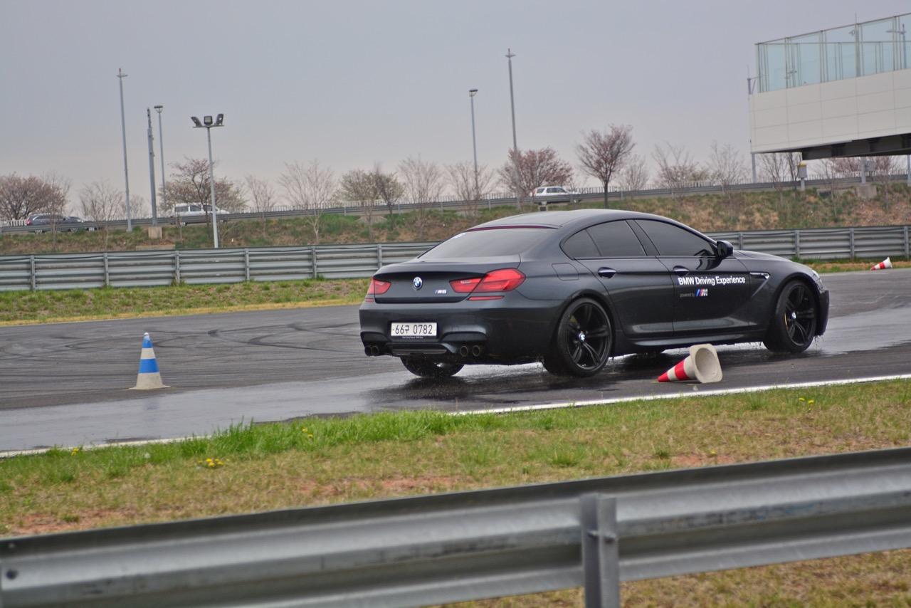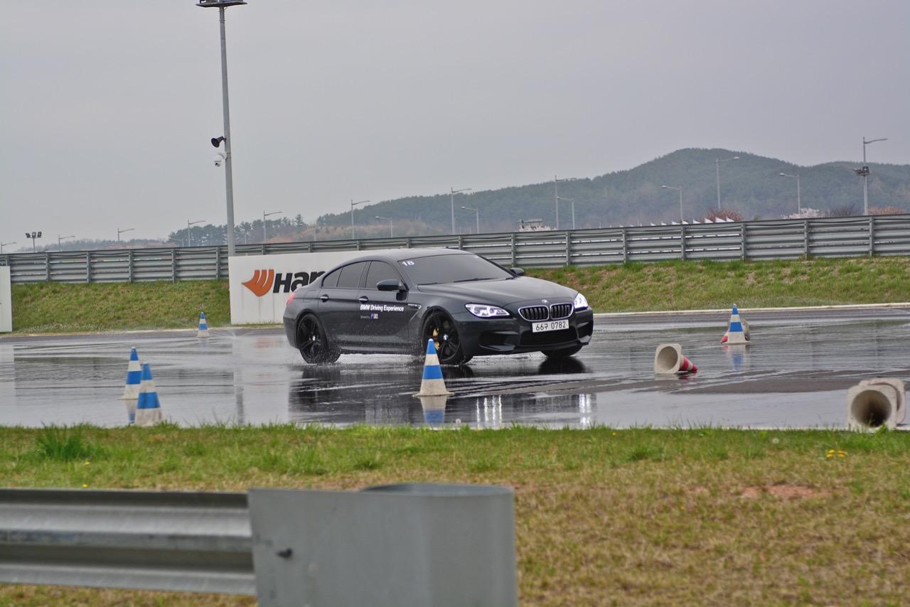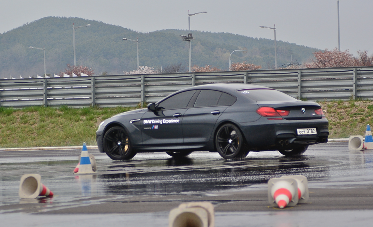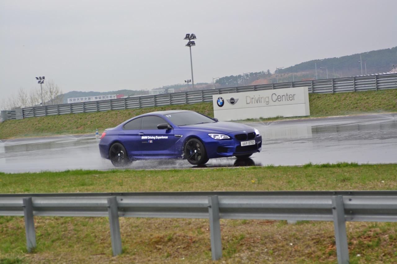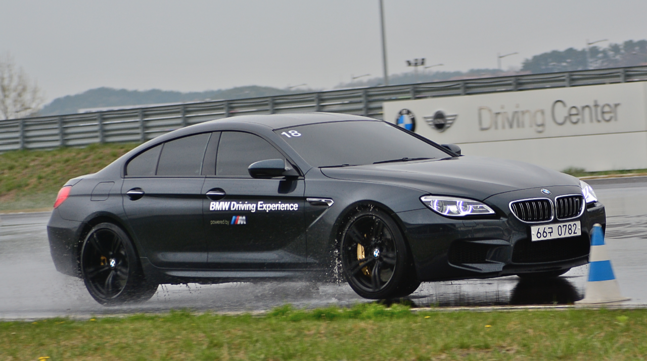 BMW M6 F13 มีความยาวเท่าๆ กับ BMW M5 F10 แต่แบนและเตี้ยมากกว่าด้วยการทำตัวเป็นรถสปอร์ตแนว GT ฐานล้อของมันยังสั้นกว่า M5 ถึง 133 มิลลิเมตร ให้การเลี้ยวที่ฉับไวกว่าเดิมก็จริงแต่ก็ยังไม่เท่ากับการเลี้ยวมุมแคบของ M2 เจ้า M6 เลี้ยวจิกโค้งแฉะๆ ที่เจิ่งนองไปด้วยน้ำในสนามทดสอบของ BMW ได้อย่างมั่นคง แค่ไม่ได้ปราดเปรียวเท่ากับ M ที่มีเรือนร่างเล็กกว่า การเร่งความเร็วออกจากโค้งรูปตัวยูบริเวณปลายโค้ง ทำได้แน่นอน แต่ระวังอาการท้ายปัดเมื่อแรงบิดทั้งหมดถูกเทลงไปที่ล้อคู่หลังซึ่งกำลังบดลงไปบนผิวถนนที่เปียกลื่น ครูฝึกชาวเยอรมันจาก BMW M ชี้ให้เห็นถึงอันตรายหากสภาพผิวถนนอยู่ในลักษณะที่เปียกชื้นมีฝนตก การควบคุมรถสปอร์ตกำลัง 560 แรงม้าให้อยู่กับร่องกับรอยไม่มีควาจำเป็นอะไรที่จะต้องขับให้เร็วจี๋ท่ามกลางตัวแปรที่ไม่เป็นใจ แม้ระบบช่วยทรงตัวจะทำงานตามหน้าที่ได้รับมอบหมาย แต่ก็มีขีดข้อจำกัดที่ขึ้นตรงกับความเร็ว ยิ่งเร็วเท่าไรโอกาสที่จะเกิดความผิดพลาดก็ยิ่งมากขึ้นเท่านั้น