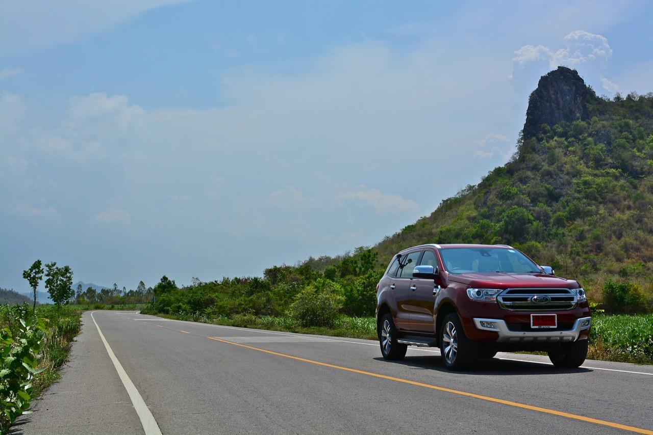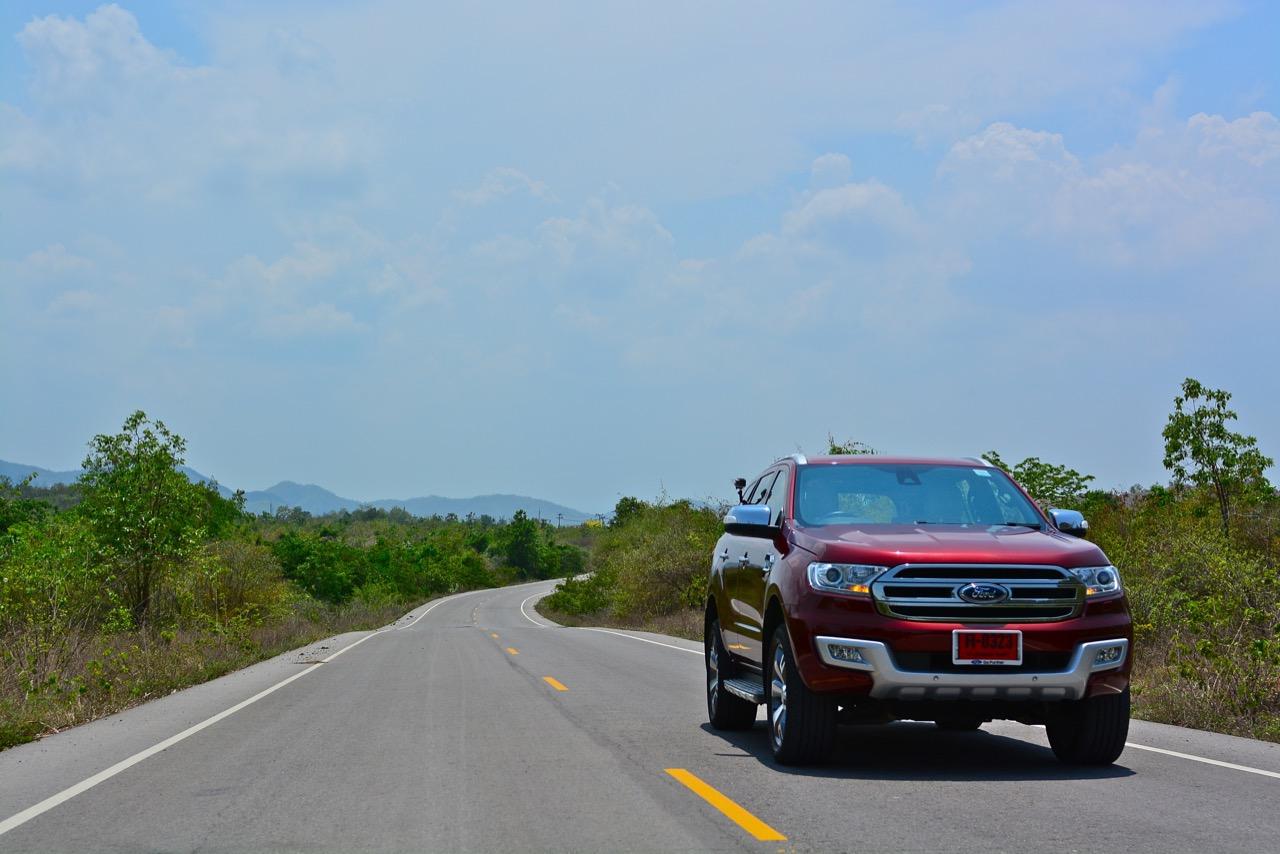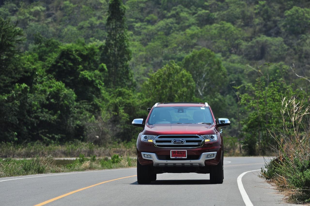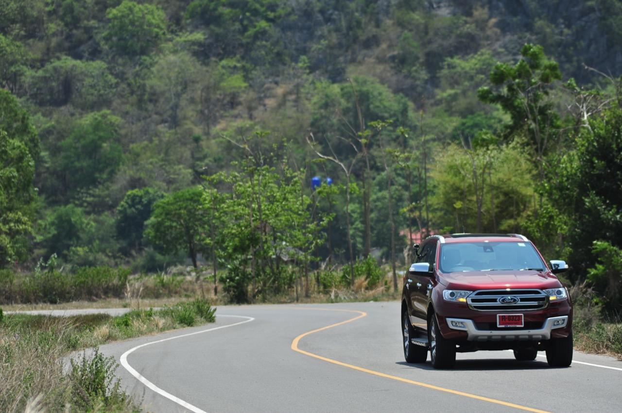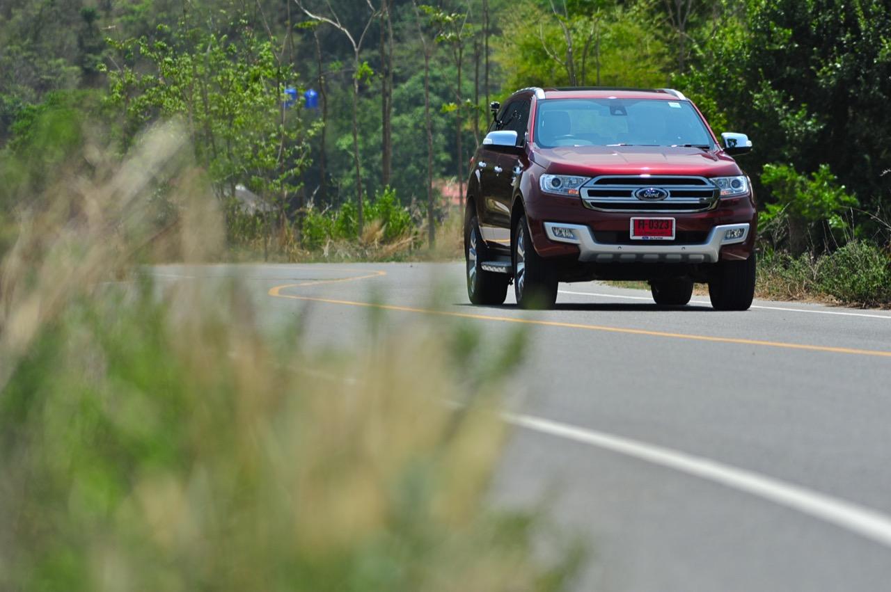 บนไฮเวย์แถบแยกวังมะนาวไปจนถึงเขตอำเภอปราณบุรี Everest 3.2L Titanium วิ่งใจขาดไม่มีคำว่าชักช้าไม่ทันการ การวิ่งในย่านความเร็วเดินทางที่ 110-120 กิโลเมตรต่อชั่วโมงที่ความเร็วรอบ 2,000 รอบต่อนาที เกิดจากการปรุงแต่งอัตราทดที่ลงตัวของเกียร์ 6 ช่วยทำให้คุณประหยัดเชื้อเพลิงทั้งๆ ที่ตัวหนักและใช้เครื่องยนต์ที่โตกว่ารุ่น 2.2 ลิตรก็ไม่กินสิ้นเปลืองราวกับการจิบเชื้อเพลิงของเครื่องตัวเล็กๆ มากกว่าจะเป็นตัวเลขอัตราสิ้นเปลืองของ SUV ไซส์ยักษ์แบบนี้ เครื่องยนต์และเกียร์ในโหมด Full Auto เร่งแซงได้แบบไม่หวาดเสียวแค่กะระยะให้มีความปลอดภัยเอาไว้ก่อนเป็นพอ ส่วนพวงมาลัยก็แปรน้ำหนักในย่านความเร็วสูงให้พอดิบพอดีกับความเร็วท่ีใช้ ระยะฟรีตรงกลางของพวงมาลัยไฟฟ้าใน Ford Everest มีน้อย ทำให้เกิดความมั่นคงแม่นยำ ข้อห้ามก็คือไม่ควรกระตุกพวงมาลัยแรงๆ ในย่านความเร็วสูง ระลึกไว้เสมอๆว่า SUV นั้นมีสัดส่วนของความสูงมากกว่ารถเก๋ง การหักพวงมาลัยเร็วๆ เพื่อเปลี่ยนทิศทางในย่านความเร็วสูงแนวซิ่งจะตามมาด้วยอาการเสียหลัก หลังจากนั้นก็แก้อาการกันเอาเอง ควรจะขับแบบระมัดระวัง รู้จักรูปแบบของรถออฟโรดและขีดจำกัดของมันคุณจะใช้งานได้อย่างปลอดภัย