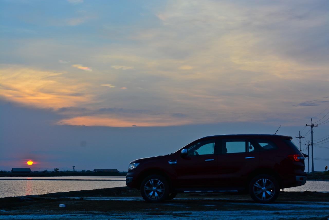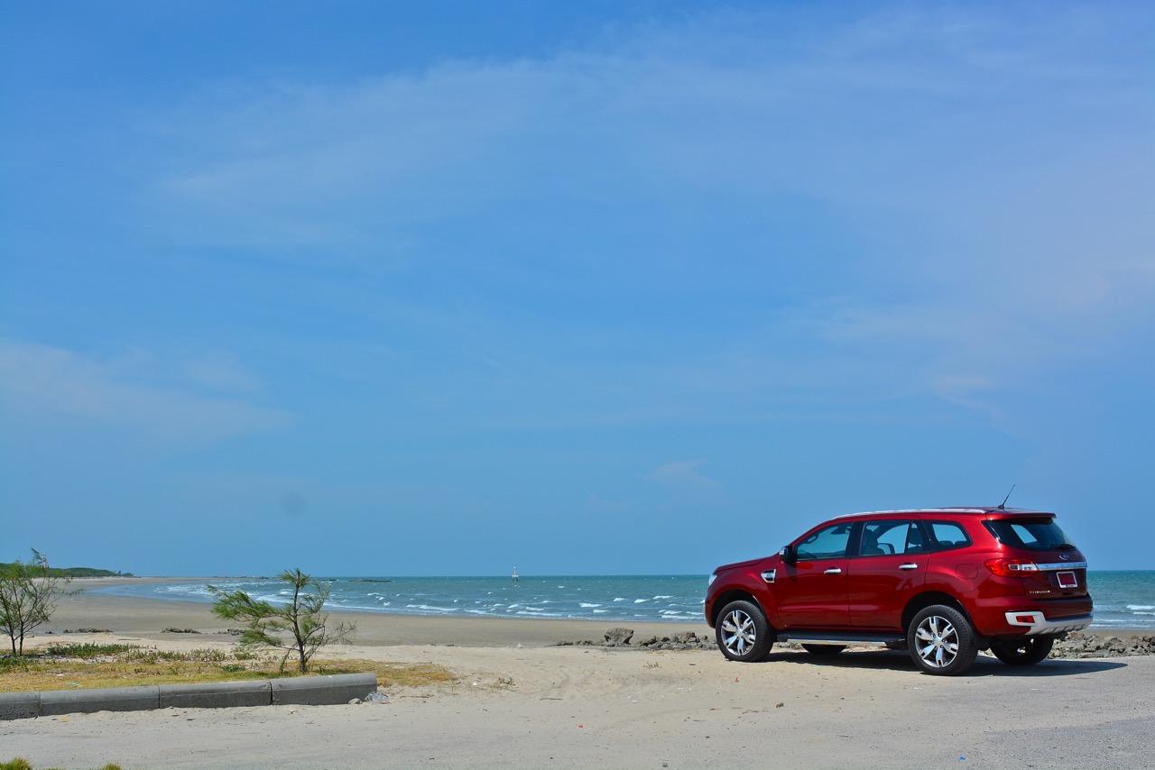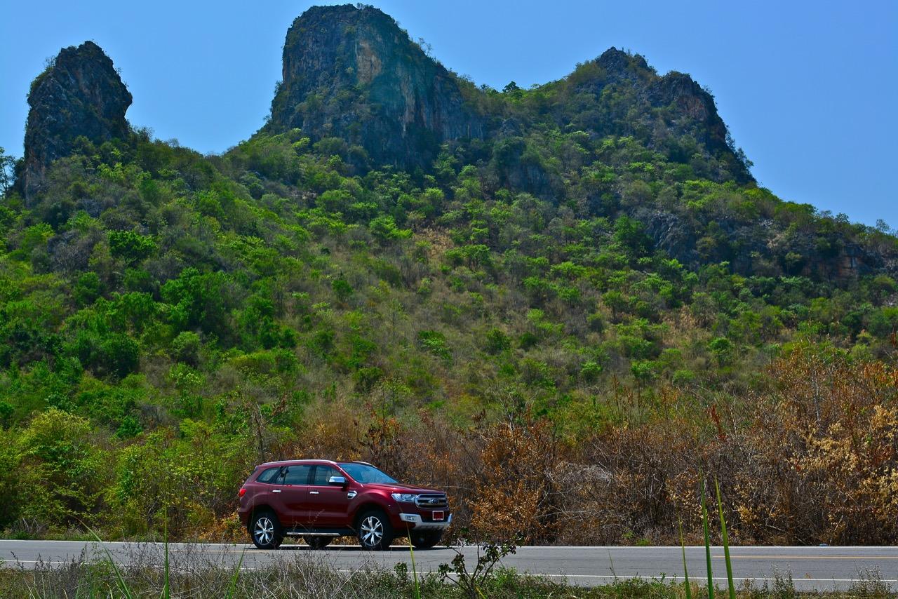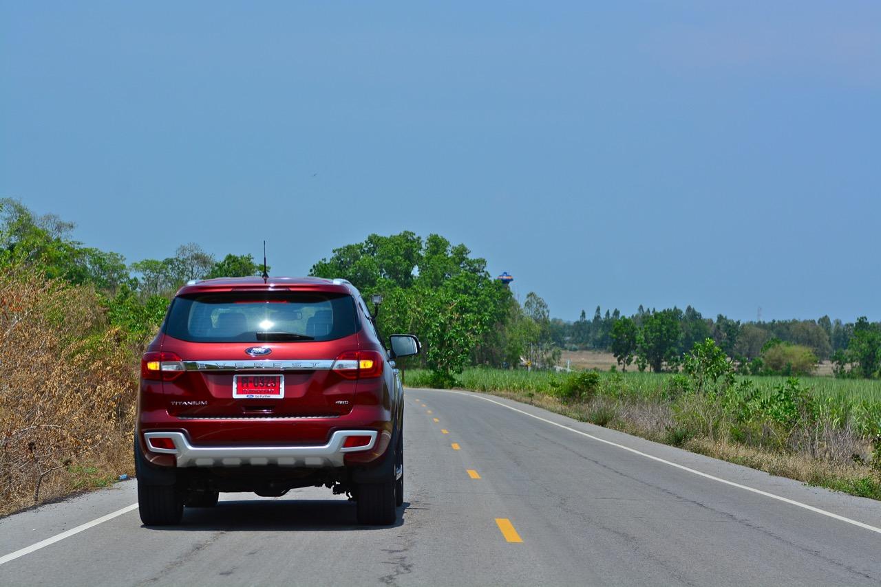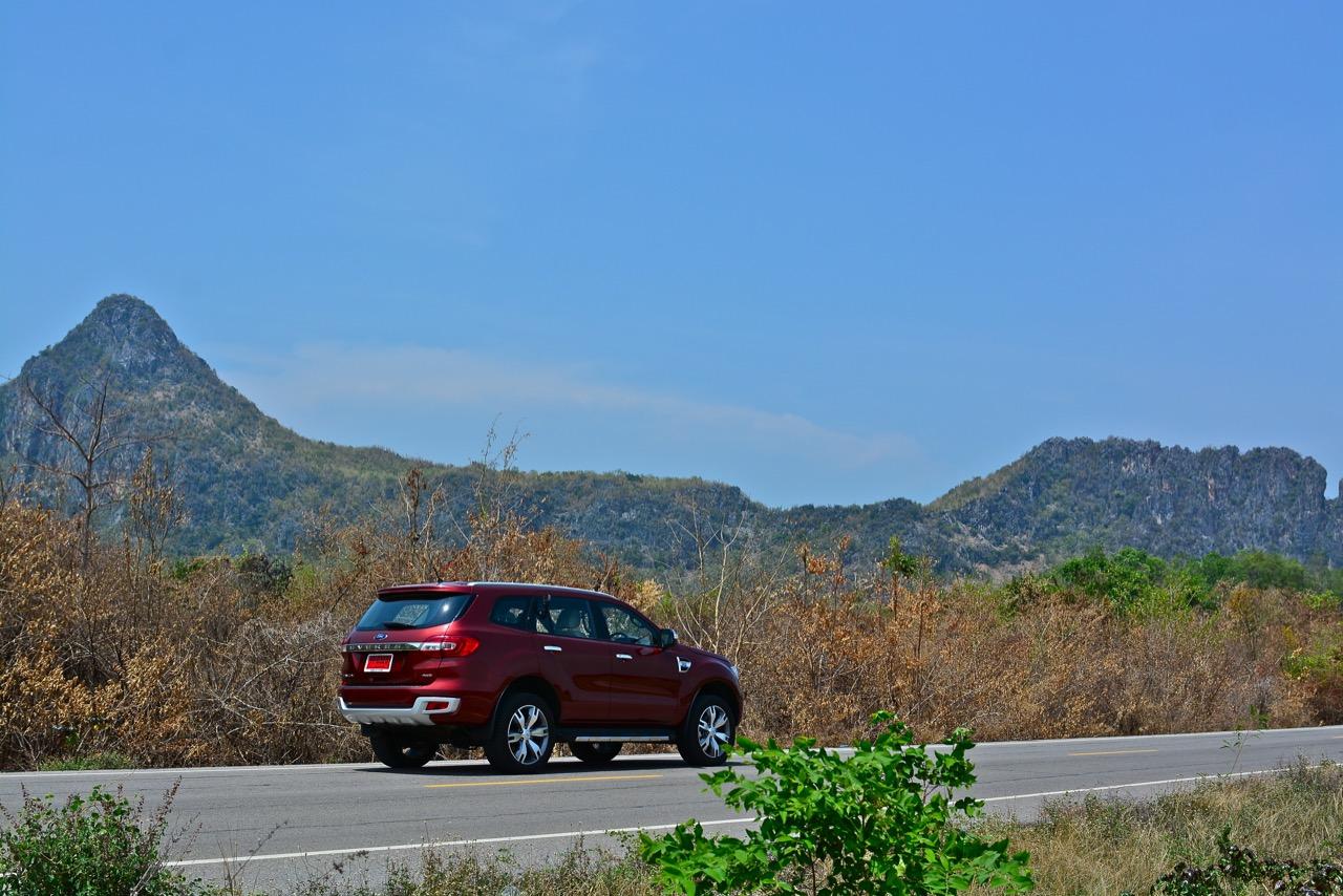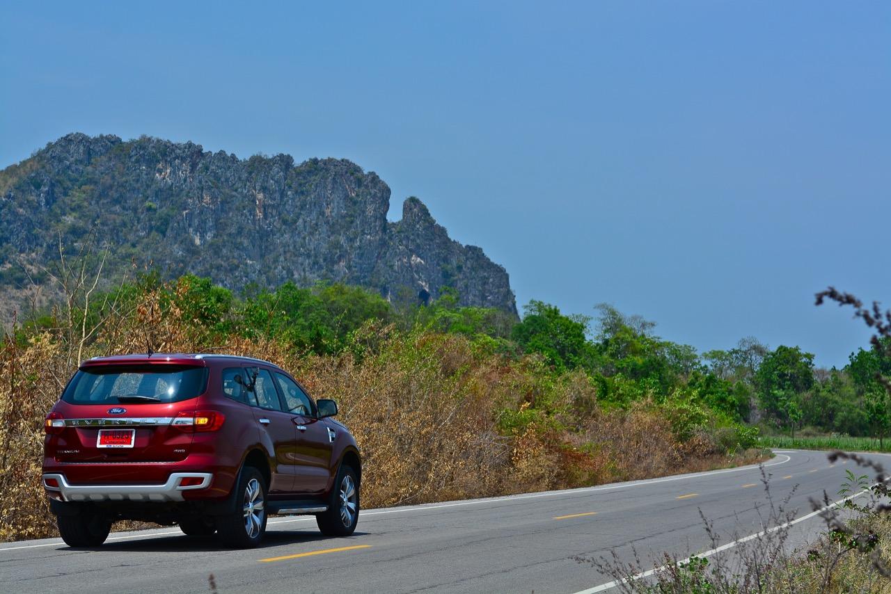 บนไฮเวย์แถบแยกวังมะนาวไปจนถึงเขตอำเภอปราณบุรี Everest 3.2L Titanium วิ่งใจขาดไม่มีคำว่าชักช้าไม่ทันการ การวิ่งในย่านความเร็วเดินทางที่ 110-120 กิโลเมตรต่อชั่วโมงที่ความเร็วรอบ 2,000 รอบต่อนาที เกิดจากการปรุงแต่งอัตราทดที่ลงตัวของเกียร์ 6 ช่วยทำให้คุณประหยัดเชื้อเพลิงทั้งๆ ที่ตัวหนักและใช้เครื่องยนต์ที่โตกว่ารุ่น 2.2 ลิตรก็ไม่กินสิ้นเปลืองราวกับการจิบเชื้อเพลิงของเครื่องตัวเล็กๆ มากกว่าจะเป็นตัวเลขอัตราสิ้นเปลืองของ SUV ไซส์ยักษ์แบบนี้ เครื่องยนต์และเกียร์ในโหมด Full Auto เร่งแซงได้แบบไม่หวาดเสียวแค่กะระยะให้มีความปลอดภัยเอาไว้ก่อนเป็นพอ ส่วนพวงมาลัยก็แปรน้ำหนักในย่านความเร็วสูงให้พอดิบพอดีกับความเร็วท่ีใช้ ระยะฟรีตรงกลางของพวงมาลัยไฟฟ้าใน Ford Everest มีน้อย ทำให้เกิดความมั่นคงแม่นยำ ข้อห้ามก็คือไม่ควรกระตุกพวงมาลัยแรงๆ ในย่านความเร็วสูง ระลึกไว้เสมอๆว่า SUV นั้นมีสัดส่วนของความสูงมากกว่ารถเก๋ง การหักพวงมาลัยเร็วๆ เพื่อเปลี่ยนทิศทางในย่านความเร็วสูงแนวซิ่งจะตามมาด้วยอาการเสียหลัก หลังจากนั้นก็แก้อาการกันเอาเอง ควรจะขับแบบระมัดระวัง รู้จักรูปแบบของรถออฟโรดและขีดจำกัดของมันคุณจะใช้งานได้อย่างปลอดภัย