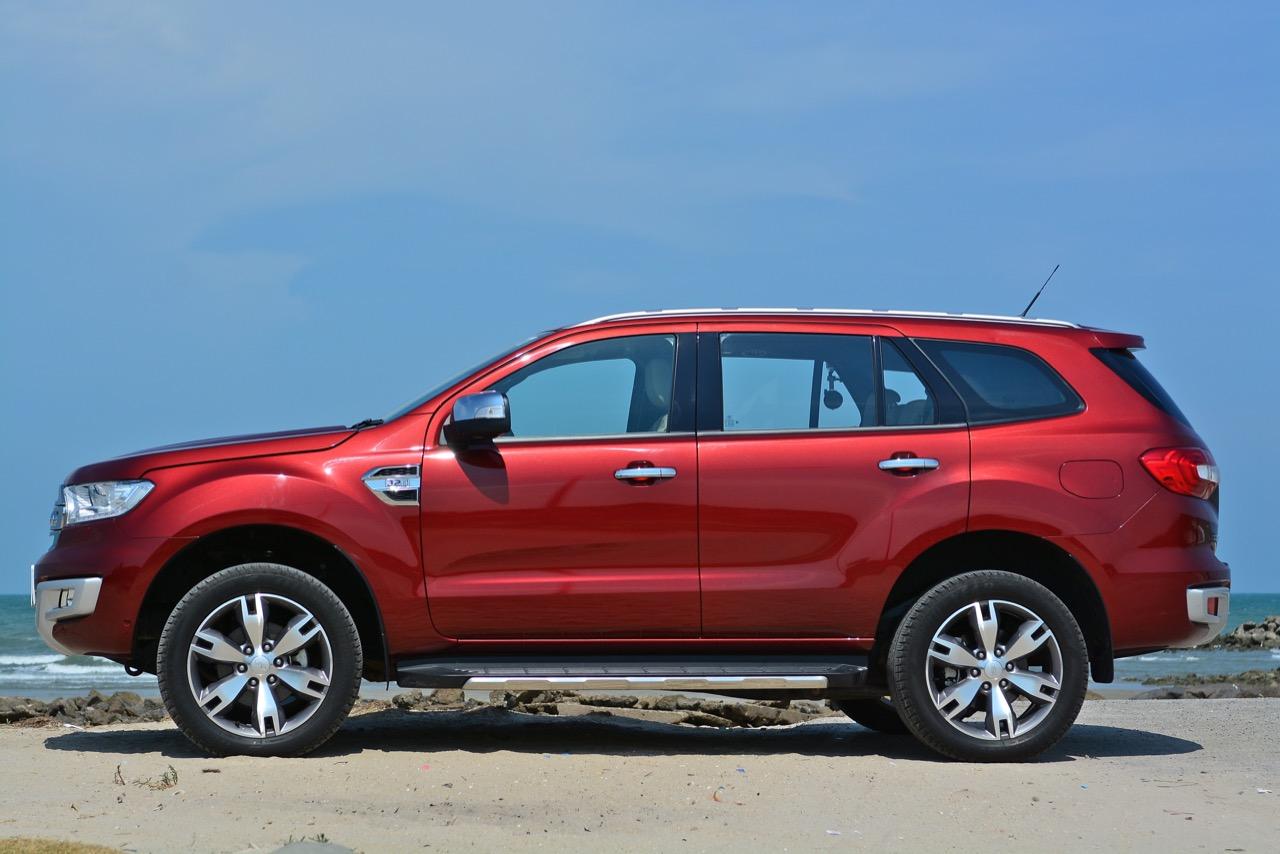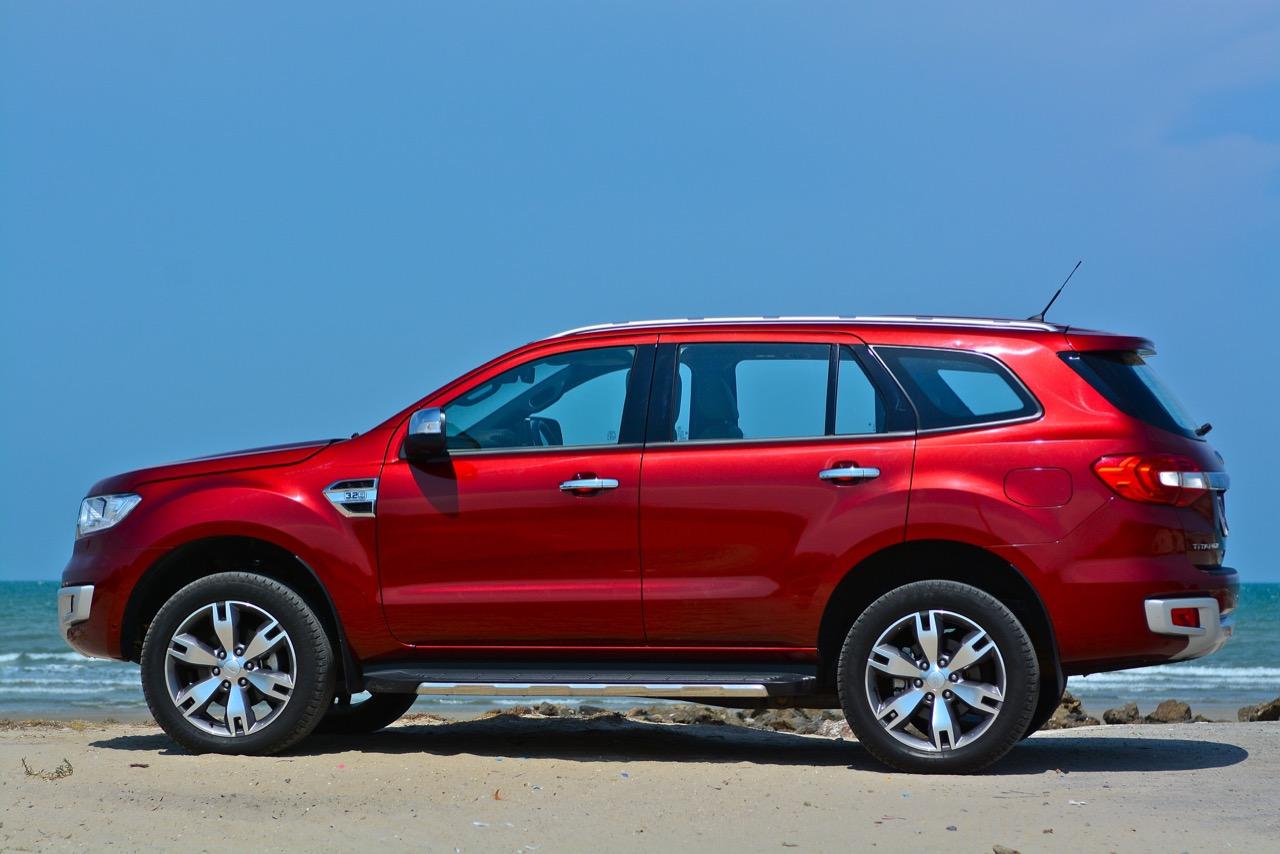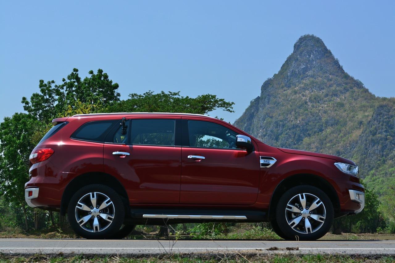 รูปทรงด้านข้างของ Ford Everest 3.2 เน้นความบึกบึนมากเป็นพิเศษ ไม่หวานแหววไหลลื่นเหมือนกับออฟโรดคู่แข่งอย่าง Mitsubishi Pajero Sport หรือ Toyota New Fortuner สัดส่วนความยาว 4,893 มิลลิเมตร และสูงถึง 1,836 มิลลิเมตร ทำให้การก้าวเข้าไปในห้องโดยสารต้องใช้คำว่าตะกายถึงจะถูกจากความสูงน้องๆ ช้างยักษ์ตัวบิ๊กบึ้ม เสาหน้ามีองศาของความเอนลาดที่ลงตัวไล่ผืนหลังคาค่อยๆ ลดระดับลงไปยังส่วนท้ายเล็กน้อยพร้อมกับเสาท้ายที่สอดรับกับแนวหลังคา แรคหลังคาที่ติดตั้งมาให้เพื่อความสะดวกในการขนสัมภาระเมื่อเบาะแถวที่สามมีผู้โดยสารนั่งกันอยู่เต็มรถก็ต้องย้ายสัมภาระชิ้นโตๆ พวกกระเป๋าเดินทางยกขึ้นไปมัดกับแรคหลังคา กระจกบังลมบานหน้าและบานข้างมีขนาดใหญ่ กรอบกระจกมองข้างติดตั้งเลนส์ไฟเลี้ยวเพื่อเพิ่มความปลอดภัย มุมด้านบนของแก้มข้างติดตั้งแถบพลาสติกสีเงินบ่งบอกถึงรุ่นและเกียร์ออโต 6 สปีดแปะติดอยู่กับแก้มด้านข้าง ซุ้มล้อทั้งหน้าและหลังมีโป่งล้อขนาดมหึมาที่เหมาะสมกับรูปแบบลุยแหลกของมัน บานประตูทั้งสี่ใหญ่โตทำให้การเข้าออกจากห้องโดยสารมีความสะดวกใช้ได้ กาบข้างติดตั้งที่เหยียบเพื่อก้าวเข้าไปในห้องโดยสารทำจากพลาสติกที่มีความแข็งแรงทนทาน จุดที่ทำให้รถออฟโรดคันนี้ดูดีขึ้นมากก็คือล้ออัลลอยลายสวยแนวแกร่งของ Everest 3.2 4x4 เป็นล้อขอบ 18 นิ้วที่สวยงามใช้ได้และผลิตขึ้นรูปจากอะลูมินั่มอัลลอย ล้อขนาดเส้นผ่าศูนย์กลาง 18 นิ้วห่อรัดด้วยยางกึ่งออฟโรดของ Goodyear รุ่น Excellence grip ไซส์ 265/60R18 เท่าๆ กันทั้งสี่ล้อ เสาอากาศในภาครับวิทยุ AM-FM ใช้เสารูปทรงเรียวเล็กทำจากยางสีดำติดอยู่ตรงกลางระหว่างกระจกบานฝาท้าย