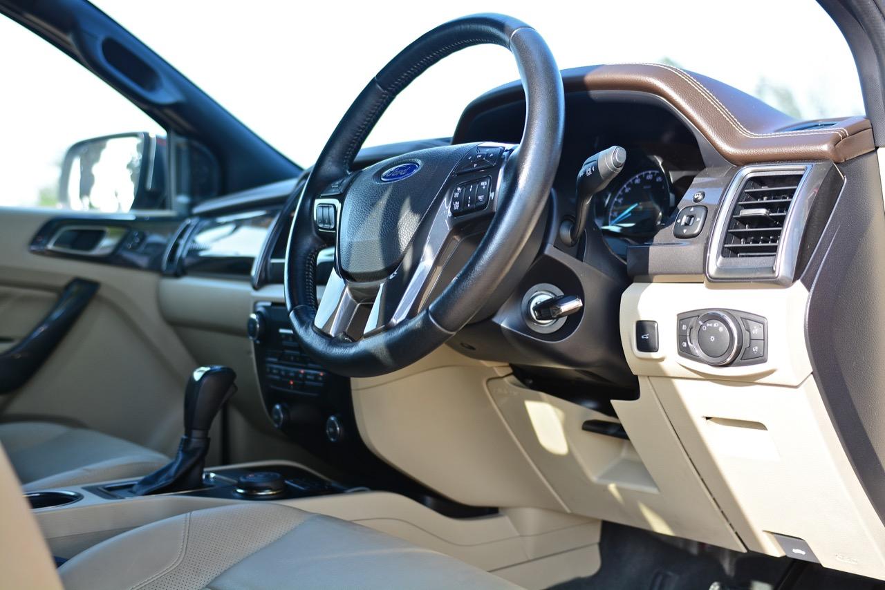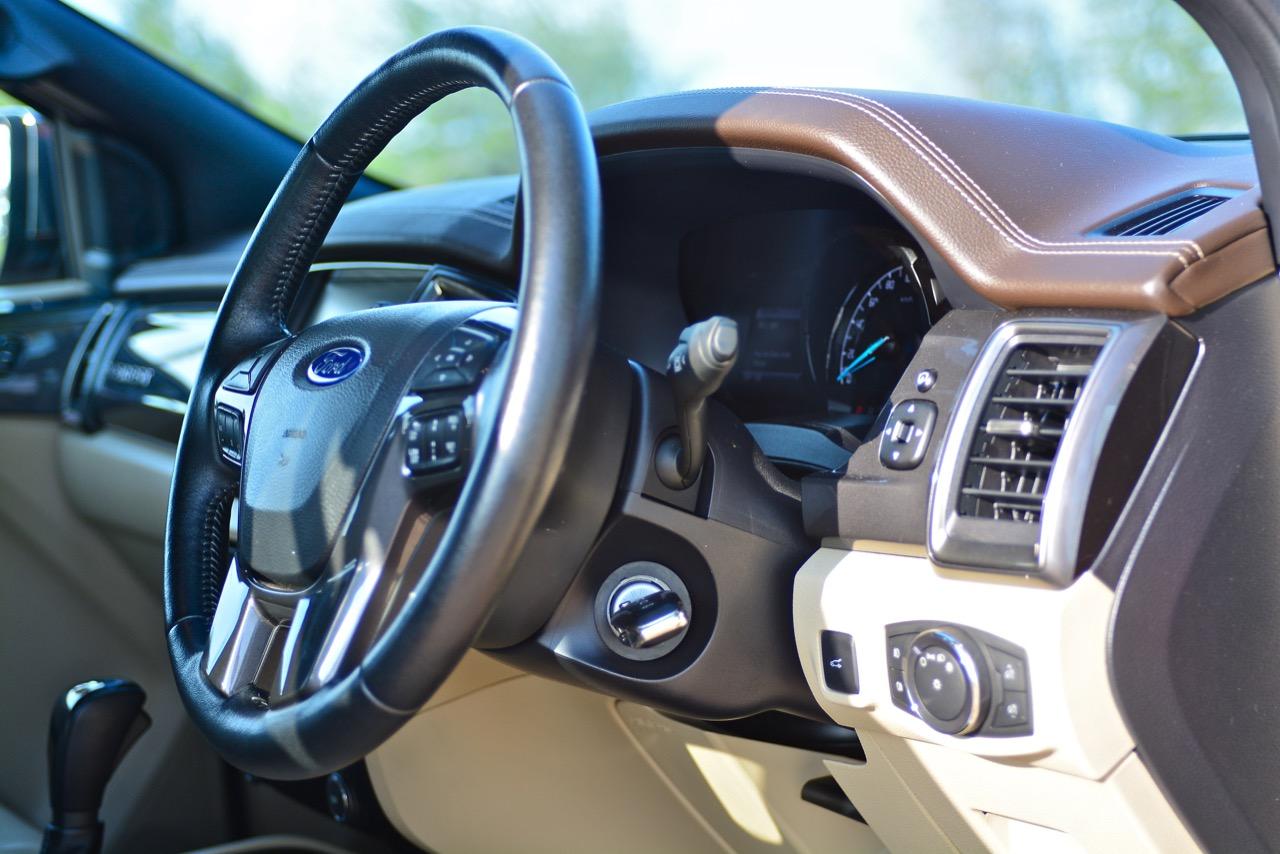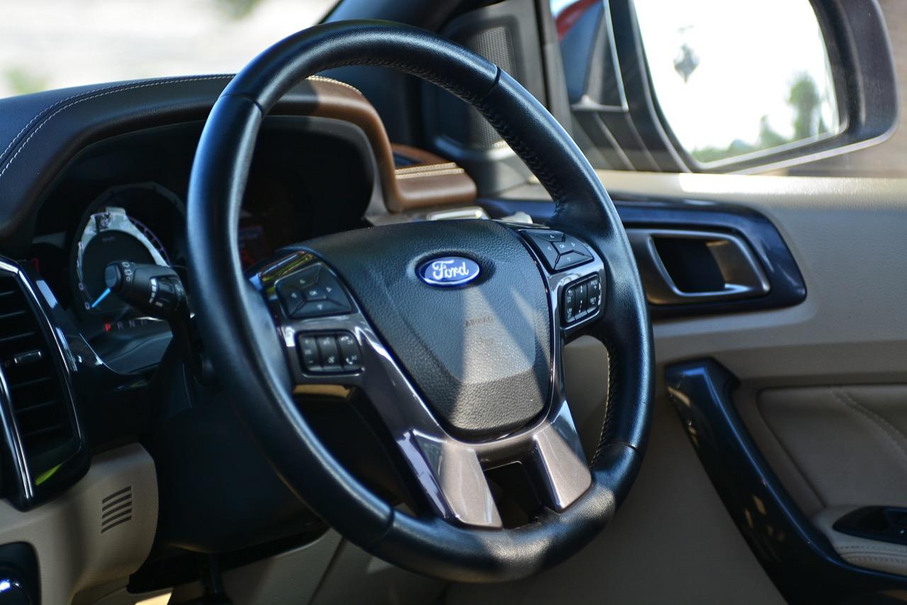 พวงมาลัยแบบ 4 ก้านหุ้มหนังแท้มีขนาดที่กำลังพอดีไม่ใหญ่หรือเล็กจนเกินไป พวงมาลัยออกแบบให้จับได้อย่างถนัดมือ ปรับตั้งได้ 4 ทิศทางทั้งใกล้-ไกลและสูง-ต่ำ ก้านพวงมาลัยใน Ford Everest 3.2 Titanium มีสวิตช์มัลติฟังก์ชันใช้สำหรับการปรับตั้งค่าต่างๆ เช่น ระบบปรับตั้งความเร็วอัตโนมัติ Cruise control สวิตช์เลือกดูข้อมูลการขับขี่ผ่านจอ Multi information display ที่ด้านขวาและซ้าย ปรับความดังของลำโพง ปุ่มรับหรือวางสายโทรศัพท์ในระบบบลูทูธ ปุ่มระบบสั่งงานด้วยเสียง