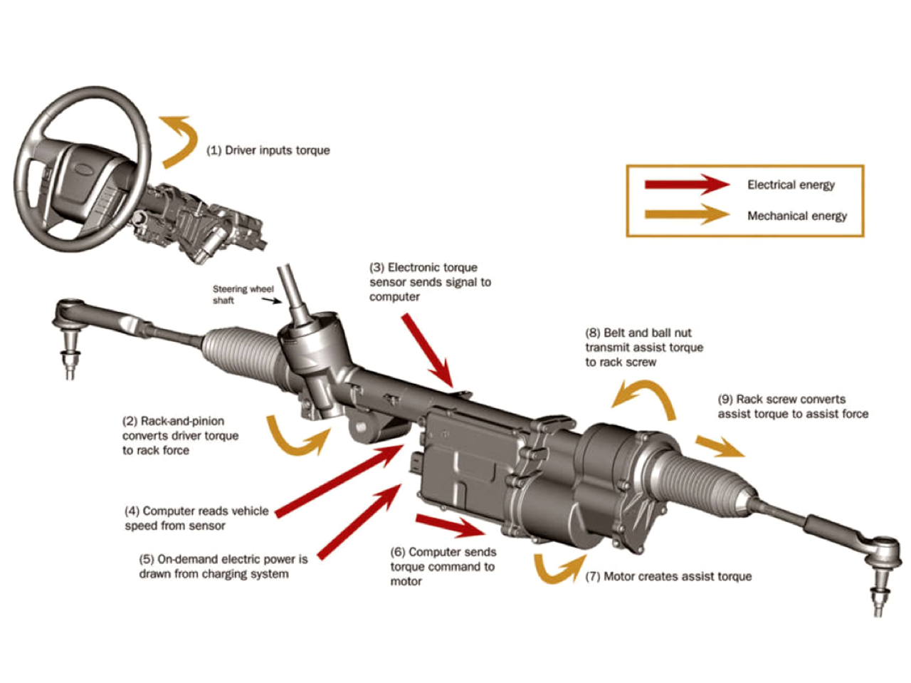 ชุดบังคับเลี้ยวหรือระบบพวงมาลัยของ Everest เป็นพวงมาลัยแรคแอนพีเนียนพร้อมมอเตอร์ไฟฟ้าผ่อนแรงหมุน แปรผันน้ำหนักไปตามความเร็ว หรือ Electric Power Assisted Steering - EPAS นับเป็นครั้งแรกในรถยนต์อเนกประสงค์ขาลุยที่กล้าหาญชาญชัยนำเอาพวงมาลัยไฟฟ้าที่มีการปรับตั้งให้ส่งถ่ายความแม่นยำพร้อมน้ำหนักที่เหมาะสมกับสปีดความเร็วโดยควบคุมผ่าน ECU หรือ electronic control unit คอยควบคุมจัดการกับการปรับน้ำหนักของพวงมาลัยแบบอัตโนมัติ