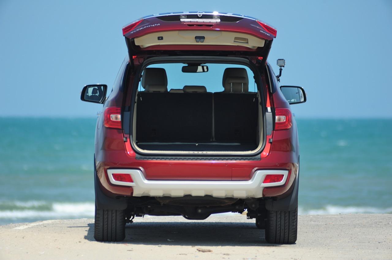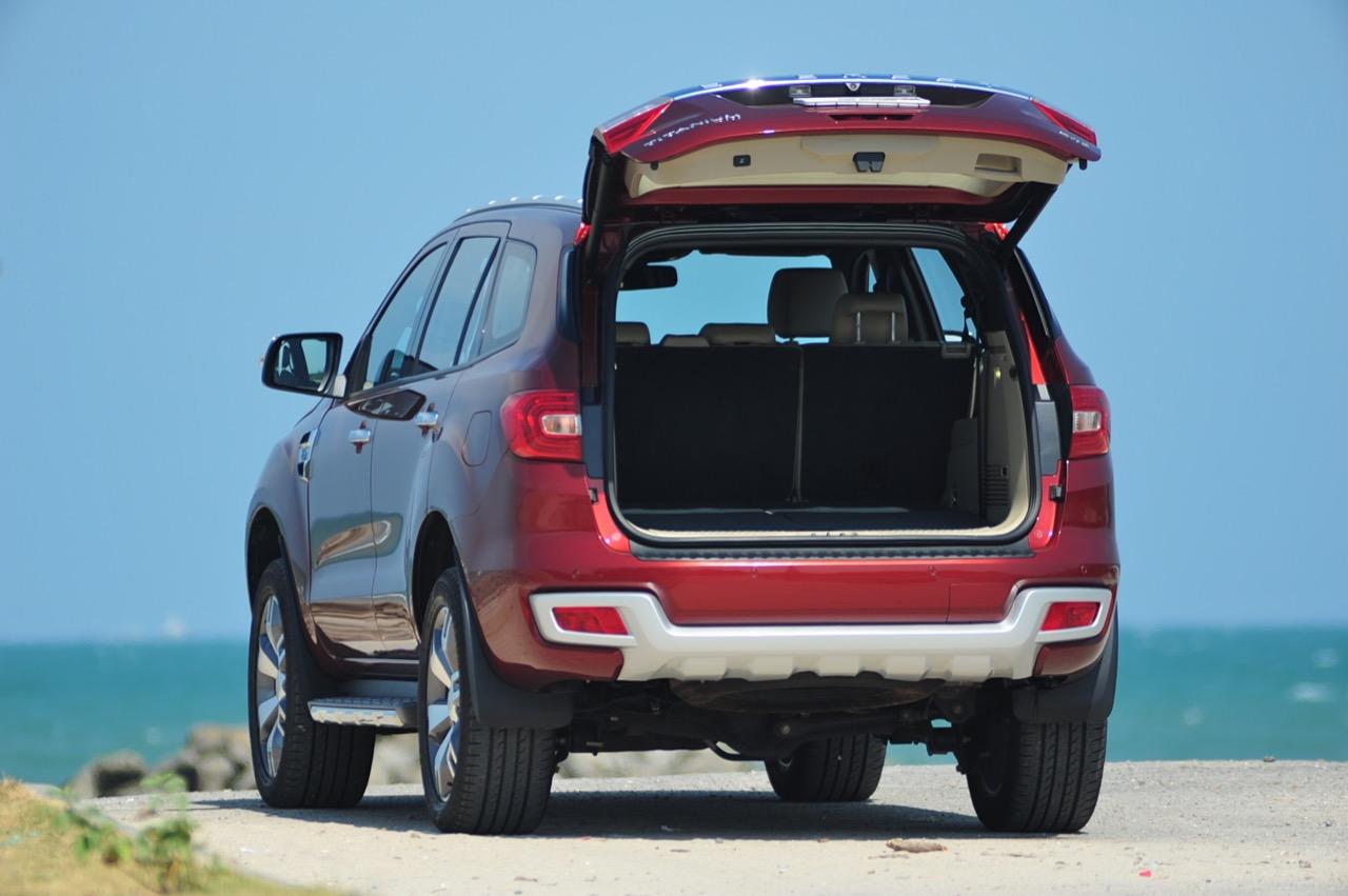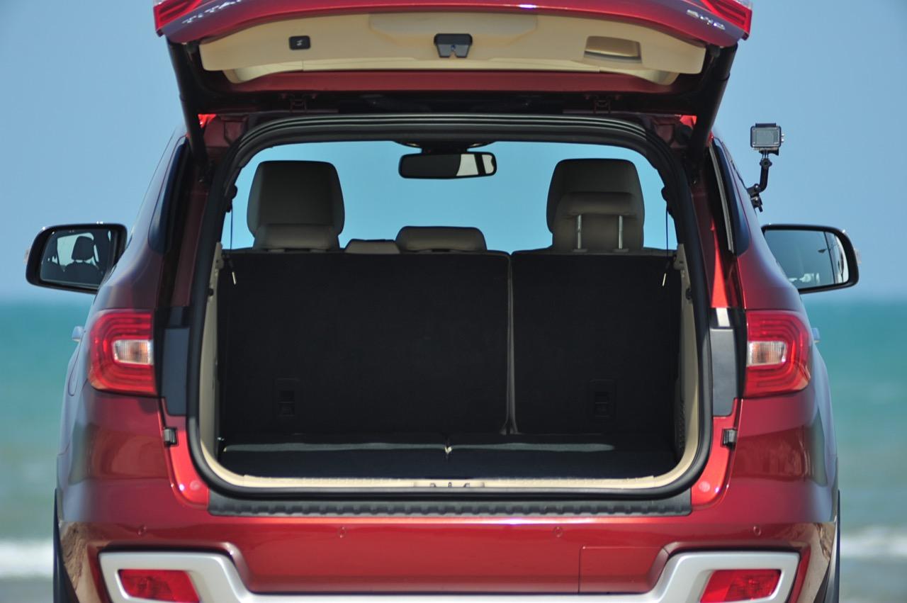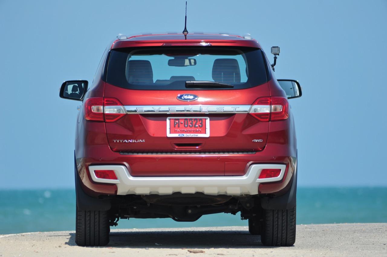 บั้นท้ายของ Everest 3.2 Titanium 4x2 6A/T สูงโด่งโจ้งแต่มีรูปทรงที่สมส่วนลงตัวจากงานออกแบบที่เข้มข้น ฝาท้ายขนาดใหญ่เปิดออกได้กว้างขวางพร้อมกลไกเปิด-ปิดฝาท้ายแบบอัตโนมัติ เป็นฝาท้ายแบบไฟฟ้าของรุ่นสูงสุดซึ่งเหนือกว่า Everest รุ่น 2.2L ที่ใช้การเปิด-ปิดฝาท้ายด้วยมือ กึ่งกลางของฝาท้ายมีชิ้นงานพลาสติกโครเมียมสีเงินคาดปิดพร้อมสัญลักษณ์ Everest คอยบอกผู้คนที่พบเห็นว่านี่คือตัวลุยเวอร์ชั่นล่าสุดจากแบรนด์ Ford ไฟท้ายทรงรีเข้ากับสัดส่วนบั้นท้ายด้วยการออกแบบที่ดีและเชื่อมโยงมุมมองส่วนท้ายให้มีความลงตัว ไฟท้ายของ Everest รุ่นใหม่ใช้หลอดไฟแบบผสมซึ่งมีทั้งหลอดไฟท้ายแบบ LED และหลอดไฟแบบธรรมดาอยู่ภายใน สปอยเลอร์หลังมีพลาสติกกันกระแทกสีดำคอยป้องกันริ้วรอยเมื่อต้องยกสัมภาระเข้าออกจากห้องเก็บของส่วนท้าย สปอยเลอร์หลังมีการดีไซน์แบบสองชิ้นเหมือนกันกับสปอยเลอร์หน้า พร้อมพลาสติกกันกระแทกสีเงินที่คล้ายกับด้านหน้าและแผ่นพลาสติกสะท้อนแสงสำหรับความปลอดภัยเมื่อจอดรถในที่มืด รุ่น 3.2 มีกล้องมองหลังติดมาให้พร้อมติดตั้งเซนเซอร์ถอยหลังแจ้งเตือนด้วยสัญญาณเสียงเมื่อถอยเข้าไปใกล้กับวัตถุกีดขวาง ด้านบนของฝาท้ายบริเวณกึ่งกลางกระจกบานฝาท้ายเป็นที่อยู่ของไฟเบรกดวงที่ 3 ซึ่งติดตั้งเอาไว้ซะสูงโด่งเพื่อทำให้มองเห็นไฟเบรกกันอย่างจะแจ้ง กระจกบังลมบานฝาท้ายยังมีใบปัดน้ำฝนมาให้เพื่อความสะดวกและมุมมองที่ดีเมื่อขับผ่านฝนฟ้าคะนอง