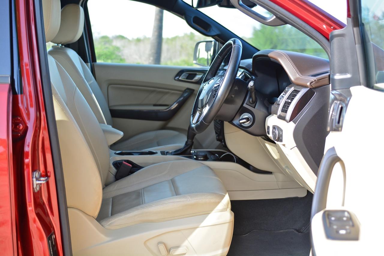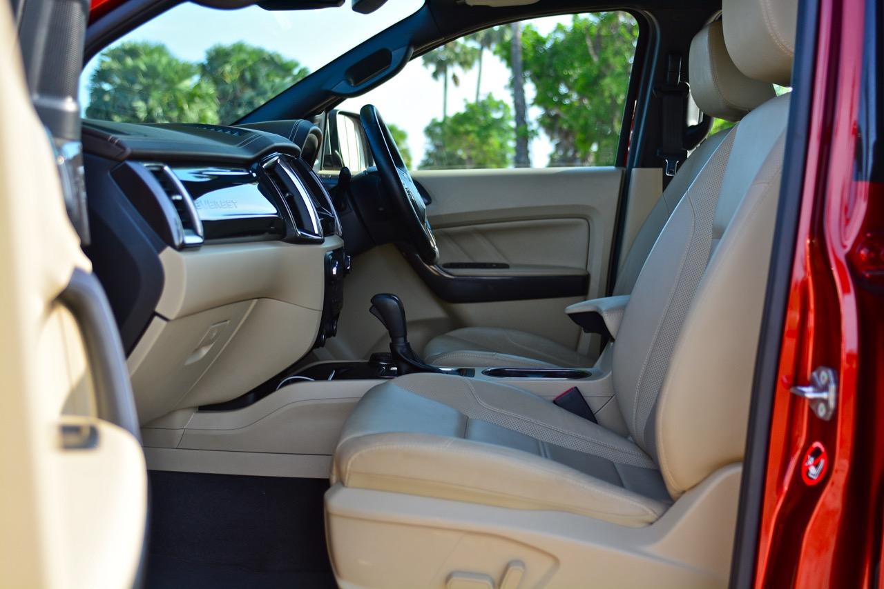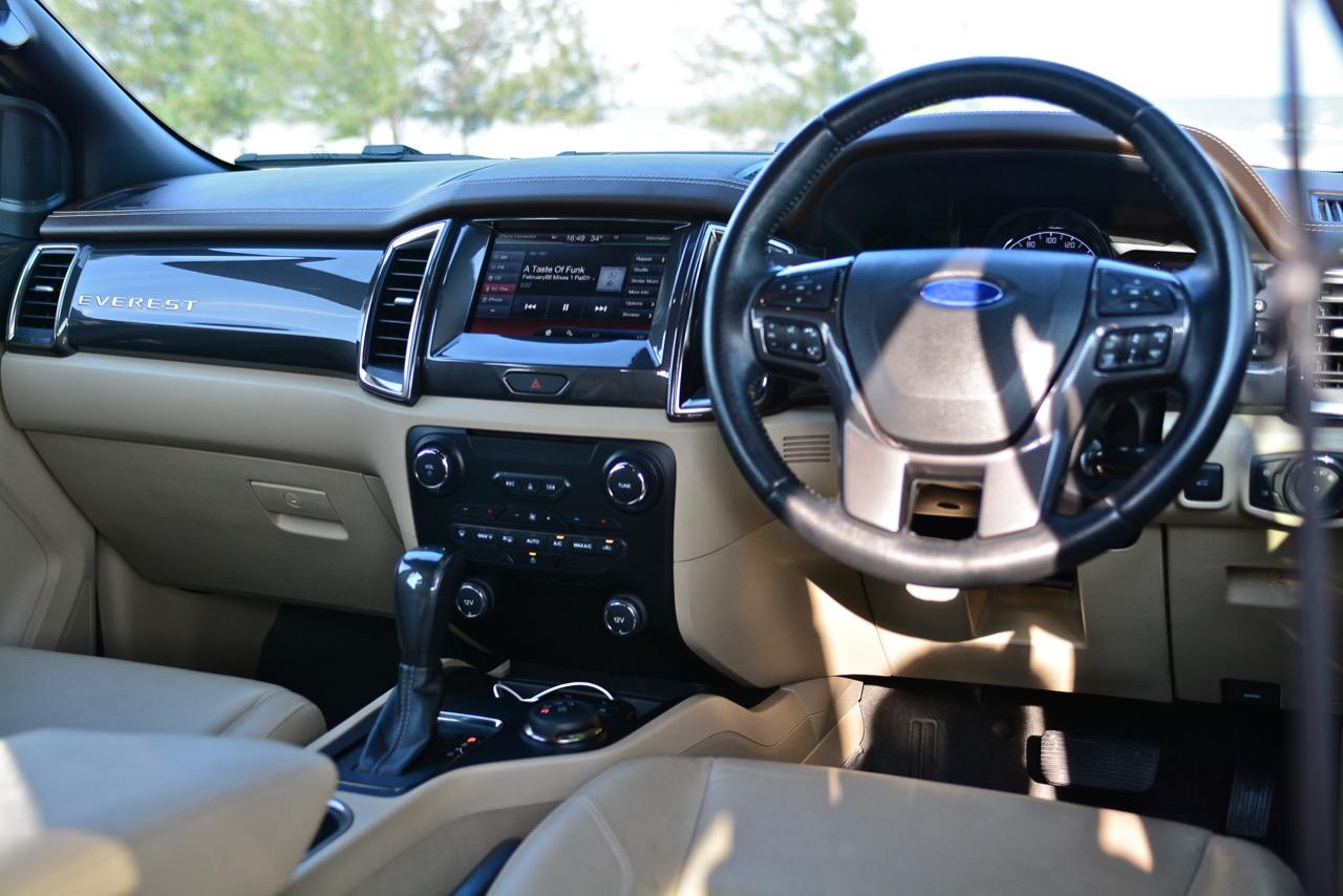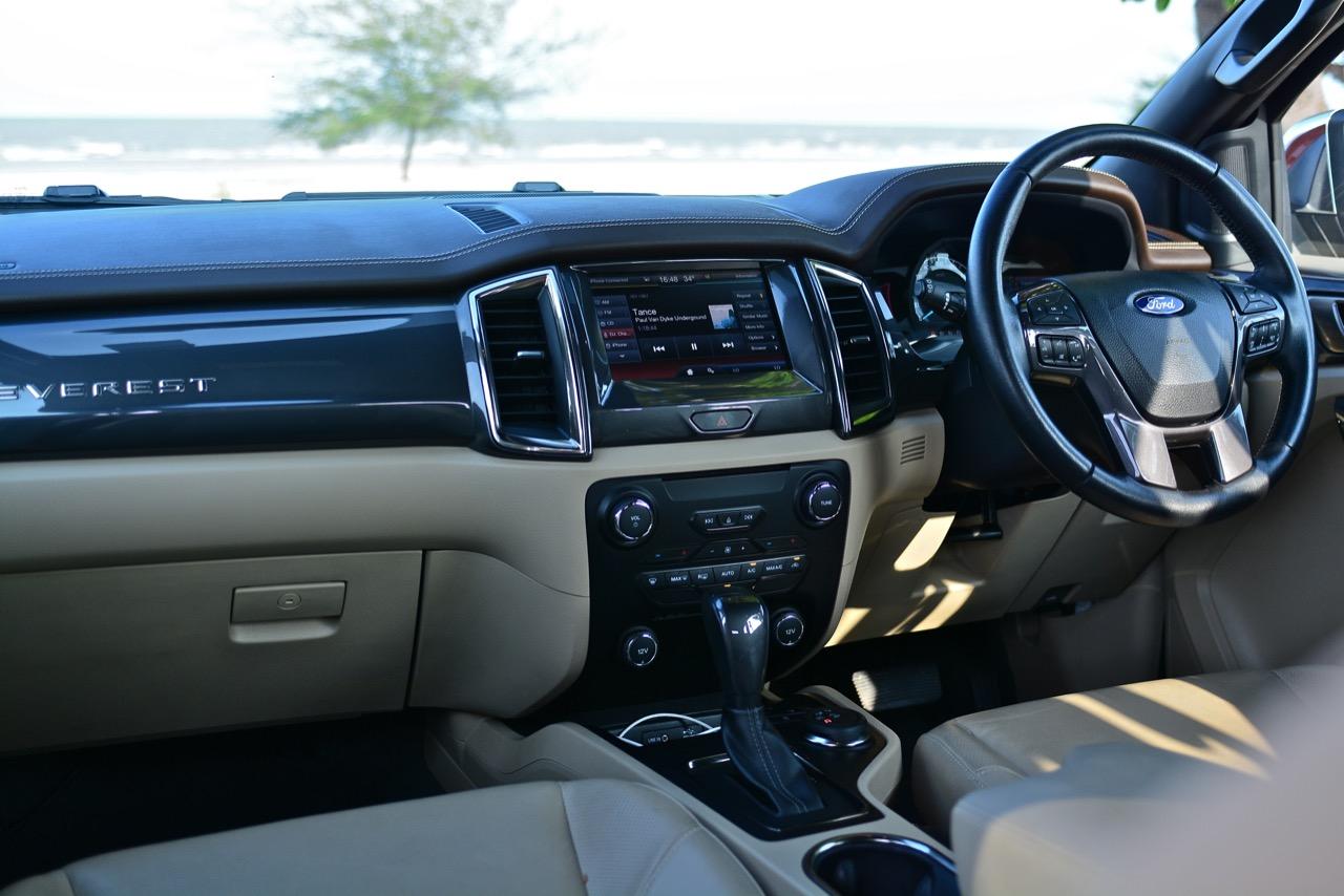 รถออฟโรดอย่าง Ford ตระกูล F250 นั้นเป็นฮีโร่ทั้งในอดีตและปัจจุบัน แถมยังสร้างภาพลักษณ์ให้กับ Ford ในฐานะที่เป็นรถลุยไซส์ยักษ์และเป็นรถที่ทำเงินให้กับบริษัท Ford สำหรับรถพีพีวี-เอสยูวีอย่าง Everest ซึ่งขายในบ้านเราและมีพื้นฐานมาจากรถปิกอัพบนแนวทางของ PPV ซึ่งมีแค่ไทยประเทศเดียวเท่านั้นที่เรียกรถกระบะดัดแปลงจนชาวบ้านเค้าออกอาการงงงวย ต้องใช้คำว่าโหนขึ้นรถสำหรับความสูงของเจ้า Everest ที่มีเรือนร่างราวกับยักษ์ปักหลั่น ความสูง 1,836 มิลลิเมตร ทำให้คุณมองได้ไกลข้ามหลังคารถเก๋งไปสุดลูกหูลูกตา การมองเห็นไกลกว่าปกติช่วยทำให้การตัดสินใจเร็วและทันต่อสถานการณ์ข้างหน้า ตำแหน่งท่านั่งของคนขับจัดท่าทางในขั้นตอนของการพัฒนาจนทำให้ท่านั่งขับของ Everest ใกล้เคียงกับ Forester ทั้งตำแหน่งของเบาะแต่ความสูงนั้นมากกว่าเยอะ การปรับด้วยไฟฟ้าและมุมของการเห็นที่มองได้ตลอดทั่วทั้งคัน เบาะไฟฟ้าทำให้ใช้งานได้สะดวกมากยิ่งขึ้น เบาะคนนั่งที่ปรับไฟฟ้าในรุ่นสูงสุดก็ควรจะใส่มาให้ในรุ่นที่มีราคาต่ำกว่าอย่างรุ่น 2.2