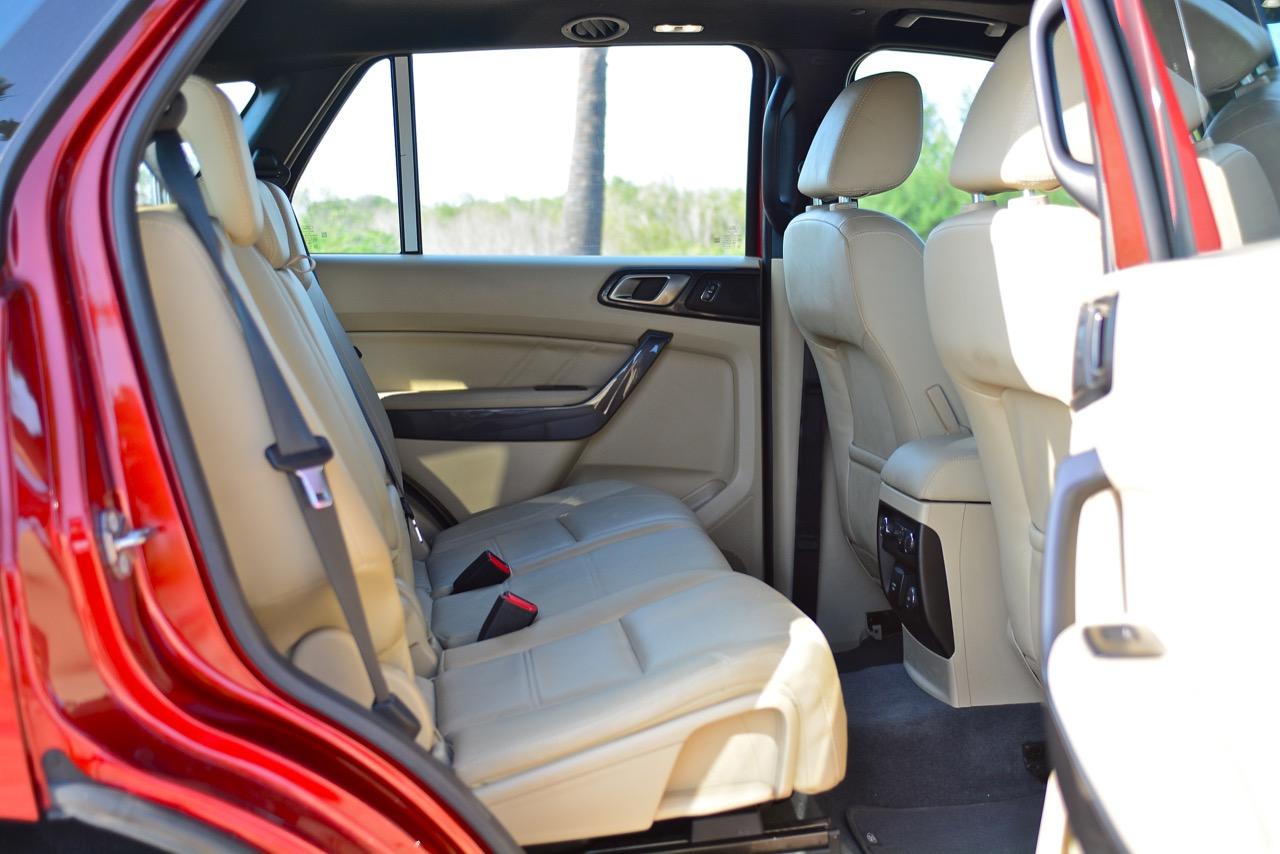 ห้องโดยสารของ Ford Everest 3.2 Titanium นั้นพยายามทำตัวให้หรูหราเข้าไว้เพื่อซื้อใจลูกค้าที่ชอบรถลุย 7 ที่นั่ง ภายในที่กว้างขวางอุดมไปด้วยพลาสติกที่มีผิวสัมผัสและรายละเอียดของชิ้นงานแตกต่างกันออกไปตามแนวทางของงานตกแต่งภายในยุคใหม่ ห้องโดยสารเน้นสีทูโทน แดชบอร์ดมีขนาดใหญ่ทำจากพลาสติกสีทูโทนด้านบนสีเทาดำด้านล่างสีเบสเพื่อเป็นการยกระดับของความหรูไม่ให้น้อยหน้ารถญี่ปุ่น คอนโซลกลางตกแต่งด้วยพลาสติกปั๊มขึ้นรูปโดยใช้รูปทรงที่เต็มไปด้วยเหลี่ยมมุมเพื่อเน้นความแข็งแกร่งที่เชื่อมโยงสอดรับกันทั่วทั้งคัน คอนโซลกลางแบ่งออกเป็นสองชิ้น ส่วนบนที่ต้องกระทบกับแสงจากภายนอกใช้พลาสติกสีเทา-ดำเพื่อลดการสะท้อนแสง เบาะหุ้มหนังสีเบสทุกตำแหน่ง โดยเฉพาะเบาะคนขับปรับด้วยไฟฟ้า 8 ตำแหน่งครอบคลุมทุกสรีระของคนขับไม่ว่าจะเตี้ยต่ำหรือสูงโย่งเป็นเสาไฟฟ้าก็สามารถปรับเบาะให้เข้ากับรูปร่างได้เป็นอย่างดี ส่วนเบาะคนนั่งยังคงใช้วิธีการปรับด้วยมือเหมือนเดิม เบาะผู้โดยสารตอนกลางแบบ 3 ที่นั่งออกแบบให้มีพื้นที่ของการนั่งยาวๆ ด้วยพื้นที่ของการวางเท้าและพื้นที่เหนือศีรษะที่ให้ความรู้สึกโปร่งโล่งไม่อึดอัด ซึ่งเป็นสไตล์การออกแบบภายในที่มีความถนัดไม้ถนัดมือของนักออกแบบจาก Ford เบาะแถวกลางยังสามารถเลื่อนหรือพับได้เพื่อเปิดพื้นที่ให้กับผู้โดยสารด้านหลังสุดซึ่งมีเบาะอีก 2 ที่นั่งเผื่อมาไว้ให้สำหรับครอบครัวที่มีคนเยอะ เบาะแถวสุดท้ายมีพื้นที่ไม่มากนักสำหรับการวางเท้า คนที่มีรูปร่างสูงโย่งจึงไม่เหมาะที่จะนั่งโดยสารในตำแหน่งแถวหลังสุด เบาะแถวหลังจึงเหมาะกับเด็กๆ ที่มีรูปร่างเล็กมากกว่าจะให้คนที่มีเรือนร่างอวบอ้วนสูงโย่งเข้าไปนั่งโดยสารบนระยะทางยาวๆ เบาะแถวหลังสุดหรือแถวที่ 3 ยังสามารถปรับพับให้ราบลงกับพื้นเพื่อเปิดพื้นที่ของการเก็บสัมภาระได้อย่างจุใจอีกด้วย การเข้าออกเบาะแถวที่ 3 นั้นทำออกมาได้ไม่ค่อยจะดีนักจากพื้นที่ที่คับแคบและด้อยที่สุดในบรรดา PPV-SUV คู่แข่ง จากตัวเบาะที่ไม่สามารถพับตลบลงมาได้อีกทบ เพื่อเปิดพื้นที่ให้สามารถเข้าออกได้อย่างสะดวกมากยิ่งขึ้น การเข้าหรือออกจากเบาะแถวที่ 3 ทำได้เพียงแค่เลื่อนไปด้านหน้าจนสุดแล้วปรับพนักพิงให้เอนลง 45 องศา