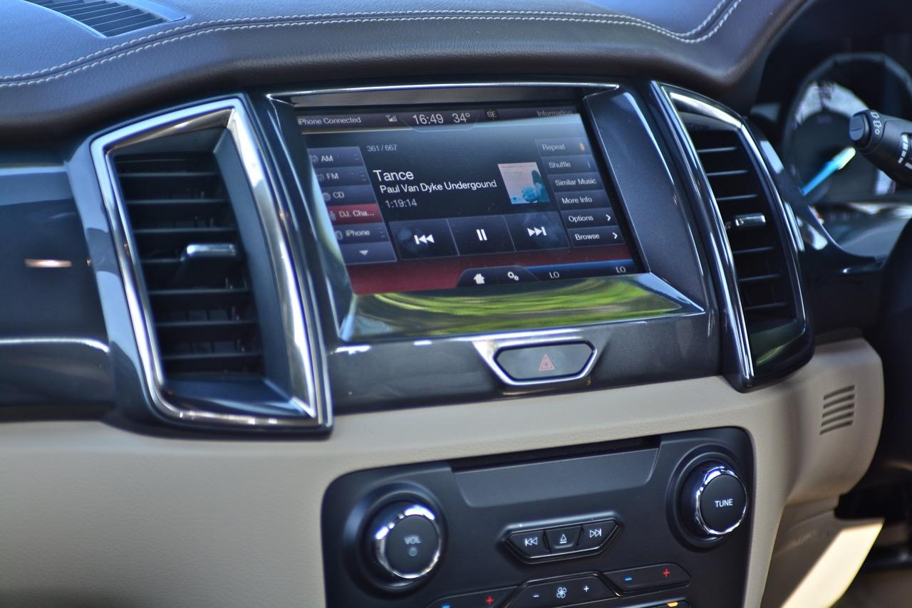 ชิ้นงานพลาสติกแดชบอร์ดคอนโซลมีการปรับรายละเอียดในด้านของสีสันและผิวสัมผัสที่ให้ความแตกต่างกันในแต่ละโซน โดยเพิ่มความหรูหรามีระดับอย่างที่ลูกค้าต้องการ ช่องแอร์ทรงเหลี่ยมกรุด้วยชิ้นงานโลหะเพื่อยกระดับความหรูและทำออกมาได้ดีสมราคาคุย จอแสดงผลส่วนกลางขนาดความกว้าง 8 นิ้วสั่งงานด้วยระบบสัมผัสที่หน้าจอหรือ touch screen สามารถสั่งการด้วยเสียง SYNC3 เป็นระบบสั่งงานรุ่นใหม่ล่าสุดโดยออกแบบให้ทำงานได้ง่ายและรวดเร็วในการเลือกใช้โปรแกรมการปรับตั้ง เช่น การเลือกเพลง หรือสั่งงานเสียงในระบบปรับอากาศก็ยังทำได้อีกด้วย จอแสดงผลกลางขนาด 8 นิ้ว เปรียบเหมือน Center Control ของการควบคุมระบบต่างๆ ในรถ เช่น แอร์ด้านหน้าและด้านหลัง ก็ยังแสดงผลในรูปแบบดิจิตอลและสามารถควบคุมผ่านหน้าจอ 8 นิ้ว การสั่งงานด้วยระบบสัมผัสมีความเร็วแค่ใช้นิ้วแตะไปที่หน้าจอเพื่อสั่งงาน SYNC 3 สามารถเชื่อมต่อกับโทรศัพท์มือถือทุกรุ่นที่มีระบบบลูทูธได้อย่างรวดเร็ว SYNC 3 ยังมาพร้อมกับระบบนำทางด้วยดาวเทียมหรือเนวิเกเตอร์ ส่วนระบบเครื่องเสียงจัดมาให้ชนิดเต็มสูบ โดยมาพร้อมกับการติดตั้งลำโพงมากถึง 10 ตำแหน่ง 10 ทิศทาง คอยสร้างความกระหึ่มขณะเล่นเพลงผ่านอุปกรณ์ i-Pod / USB / AUX ซับวูฟเฟอร์ 1 ตำแหน่งคอยสร้างพลังเสียงเบสที่หนักแน่นใช้ได้ ส่วนคุณภาพเสียงที่ขับออกมาจากลำโพงทั้ง 10 ตำแหน่งก็อยู่ในเกณฑ์ดี เมื่อลองเปิดเครื่องเสียงของ Ford Everest 3.2 Titanium แล้วเล่นเพลงผ่าน CD / MP3 ที่มีการบันทึกรายละเอียดที่คมชัดก็ยังถือว่าคุณภาพของเสียงเพลงที่ขับผ่านลำโพงออกมานั้นเป็นที่น่าพอใจในคาบที่ดีไม่ต้องไปดิ้นรนขวนขวายเสียเงินติดตั้งชุดเครื่องเสียงราคาแพงแต่อย่างใด เจ้า Everest 3.2 Titanium ยังมีช่องเชื่อมต่อ AUX และ USB มาให้ถึง 2 ช่อง พร้อมกล้องมองหลังขณะถอยจอด ระบบนำทางผ่านดาวเทียมหรือ GPS ที่ติดตั้งมาให้นั้นมีความละเอียดคมชัดใช้งานได้ดี