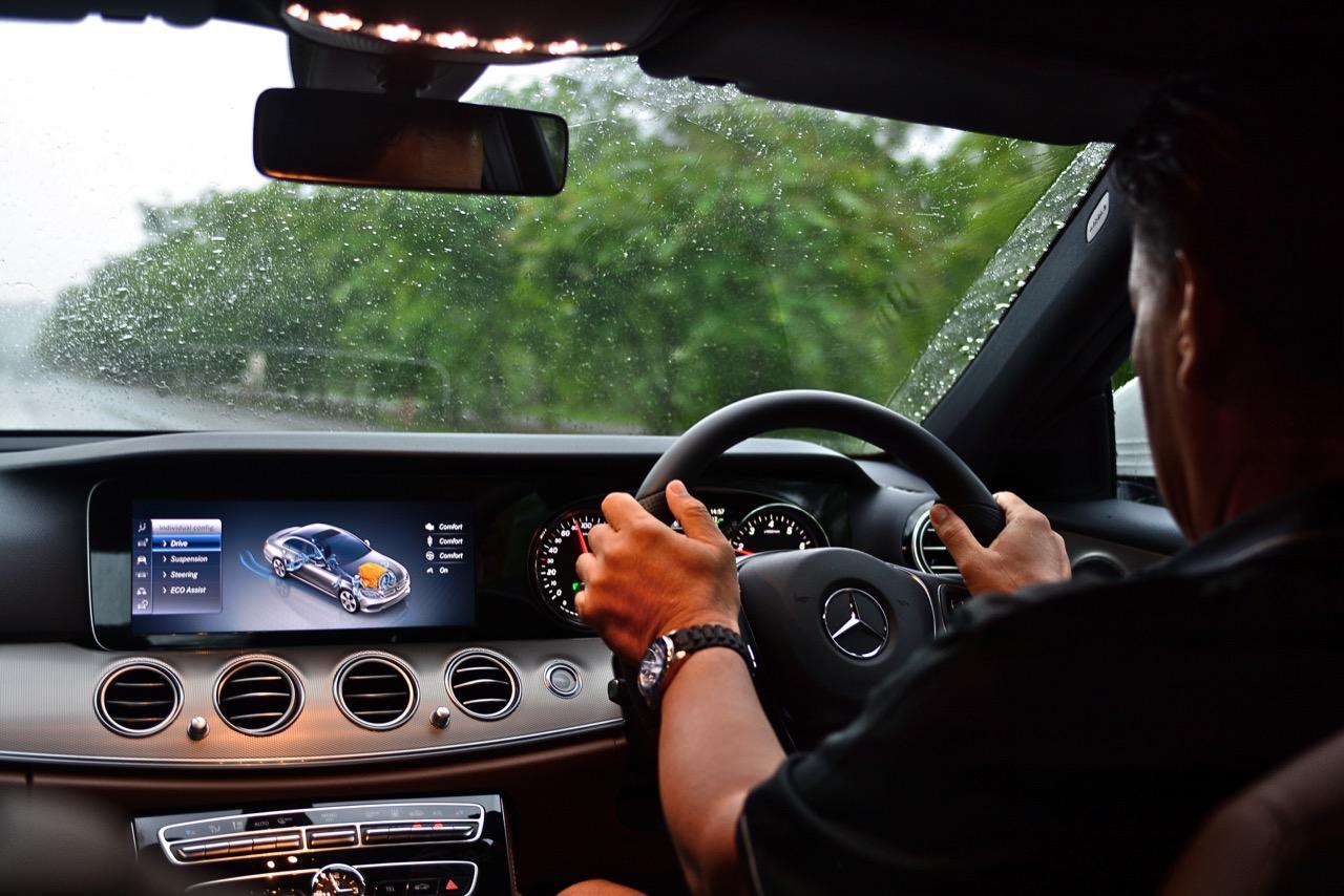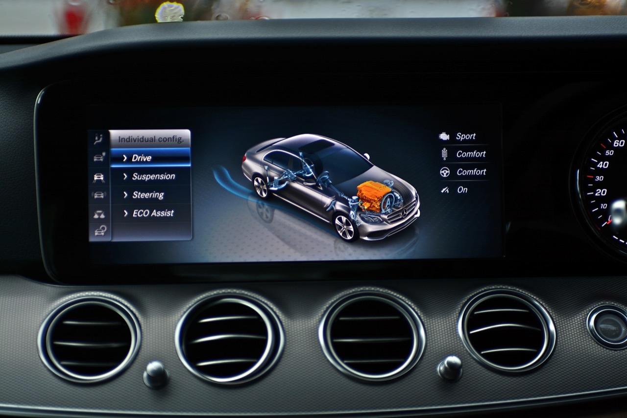 ระบบกันสะเทือนแบบถุงลม AIR-MATIC พร้อมระบบควมคุมอัตโนมัติให้ประสิทธิภาพดีกว่าโช้คอัพแบบปกติที่ปรับไม่ได้ ทำให้ E350e เหมาะกับการขับทางใกล้ในเมืองและทางไกลข้ามจังหวัดแบบที่สื่อมวลชนกำลังขับอยู่ในขณะนี้ โหมด EV วิ่งด้วยมอเตอร์เพียวๆ โดยไม่ติดเครื่องยนต์นั้นเหมาะสมกับการใช้งานในเมืองที่มีการจราจรหนาแน่น Mercedes Benz เคลมว่า ด้วยการชาร์จไฟทิ้งไว้ทั้งคืน คุณสามารถขับ E350e ได้ไกล 33 กิโลเมตร โดยที่เครื่องยนต์ไม่ทำงาน พอเอาเข้าจริงๆ เมื่อเริ่มต้นการขับทดสอบ หลังจากขับออกจากร้านอาหารในจังหวัดชุมพรได้ไม่นานนักด้วยกระแสไฟฟ้าที่เต็มแบตเตอรี่ มันวิ่งได้ระยะทางประมาณ 24 กิโลเมตร ด้วยความเร็วเดินทางประมาณ 100-110 กิโลเมตรต่อชั่วโมง เครื่องยนต์เบนซิน 2 ลิตร 211 แรงม้า สตาร์ตตัวเองขึ้นมาอย่างนิ่มนวลเมื่อระบบ HYBRID ตรวจพบว่าแบตเตอรี่ลิเธียม-ไอออนมีกระแสไฟน้อยลงจนเกือบจะหมด เครื่องยนต์ที่ติดขึ้นมา เข้ามารับหน้าที่ในการขับเคลื่อน ผสานกับมอเตอร์ทันทีที่คันเร่งถูกกดลงลึกเพื่อการเร่งแซง