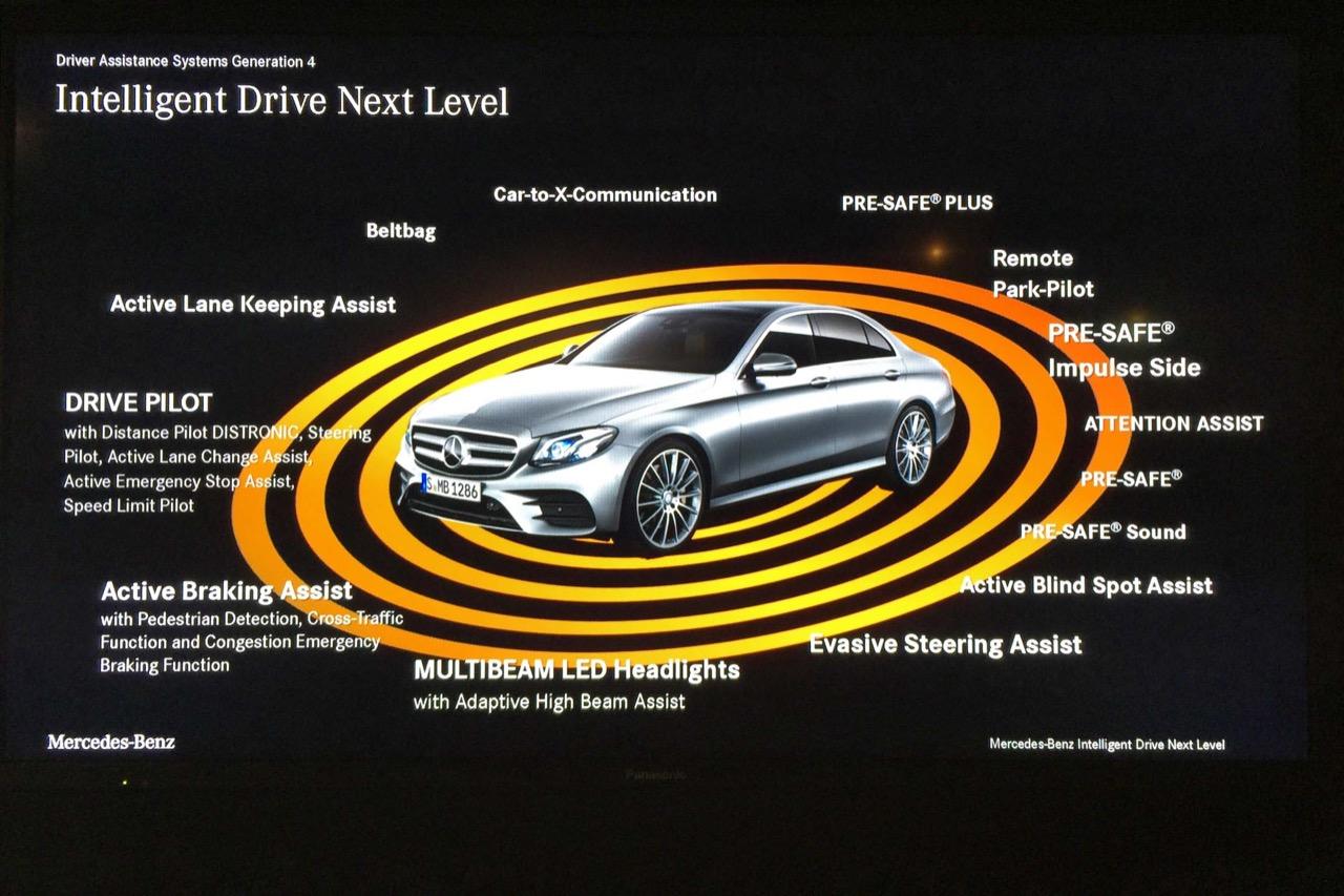E350e มาพร้อมกับระบบ “Mercedes-Benz Intelligent Drive” เพื่อให้ผู้ขับขี่ และผู้โดยสารได้รับความปลอดภัยสูงสุด ด้วยระบบการช่วยเหลือและระบบความปลอดภัยที่มีประสิทธิภาพ โดยระบบดังกล่าวมีพื้นฐานมาจากแนวคิดการปกป้องก่อนเกิดเหตุและหลังเกิดเหตุเข้าไว้ด้วยกันภายใต้ระบบควบคุมอัจฉริยะเพียงหนึ่งเดียวที่ทำงานสอดประสานกัน ไม่ว่าจะเป็น ระบบช่วยการนำรถเข้าจอดอัตโนมัติ (Parking Pilot including Active Parking Assist) ระบบชาร์จโทรศัพท์มือถือแบบไร้สาย (Wireless charging for mobile phone) โดย E350e Avantgarde จะมาพร้อมกับกล้องแสดงภาพด้านหลังขณะถอยรถ ในขณะที่ E350e Exclusive และ E350e AMG Dynamic มาพร้อมกับกล้องแสดงภาพรอบทิศทาง รวมถึงระบบช่วยรักษาระยะห่างจากรถที่อยู่ด้านหน้า (Distance Pilot DISTRONIC) และระบบช่วยเตือนเมื่อมีรถอยู่ในจุดอับสายตา (Blind Spot Assist) ที่ติดตั้งขึ้นเป็นครั้งแรกในรถยนต์รุ่นนี้