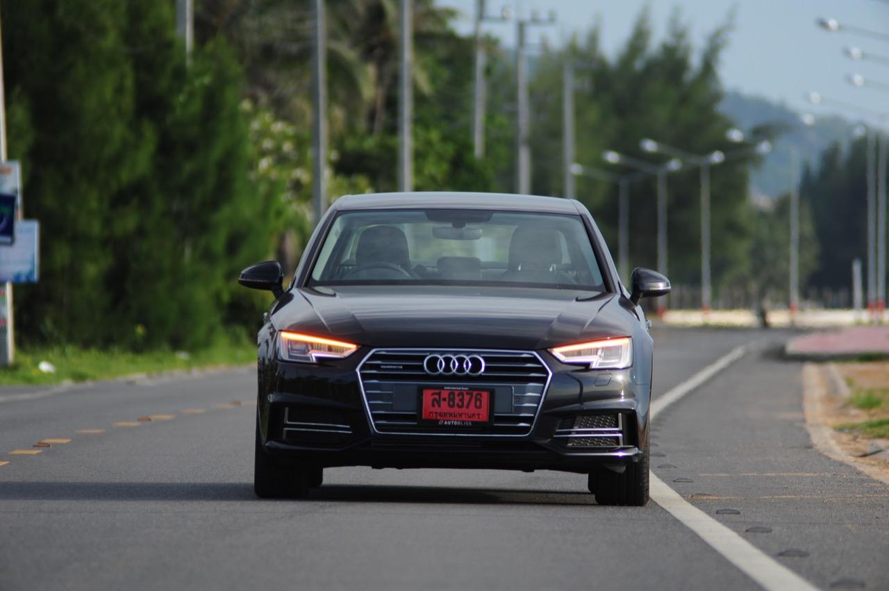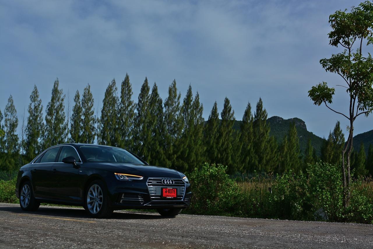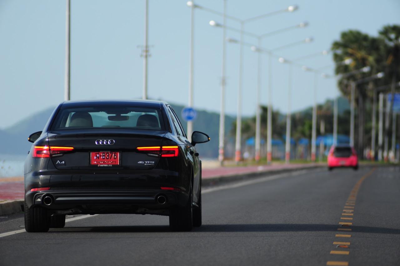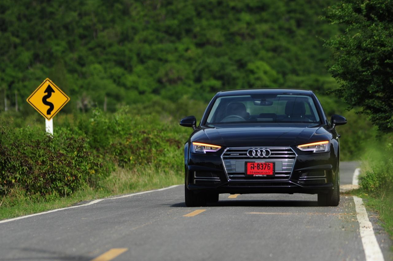 วิศวกรของ Audi ทำงานอย่างหนักเพื่อสร้างเครื่องยนต์ที่มีประสิทธิภาพมากพอสำหรับ Audi A4 โดยเฉพาะรุ่น 45 TFSI นั้น มีแรงดึงที่ดีเยี่ยมเกือบจะทุกย่านของรอบเครื่องยนต์กันเลยทีเดียว แรงดึงส่งให้รถพุ่งทะยานลิ่วๆ ไปข้างหน้าราวกับก้อนหินที่ถูกดีดออกจากหนังสติ๊ก เผลอแผล็บเดียวหากไม่มองมาตรวัดแล้วยังกดคันเร่งลงลึกอย่างต่อเนื่อง มีหวังได้โดนใบสั่งข้อหาใช้ความเร็วเกินกำหนดอย่างแน่นอน แรงบิด 370 นิวตันเมตร ที่ทะลักออกมากลับไม่ทำให้เจ้าหมอนี่กินเชื้อเพลิงมากอย่างที่คิดไว้แต่แรก เมื่อลองดูตัวเลขอัตราสิ้นเปลืองที่หน้าจอ MID ก็อยู่ที่ 9.6 กิโลเมตรต่อลิตร ทั้งๆ ที่ลากยาวอัดหนักมาตั้งแต่เส้นบายพาส ส่วนช่วงล่างก็ให้รสชาติเหมือนกับรถเยอรมันทั่วไป นั่นก็คือความหนึบแน่น ออกจะโดดเด่นกว่ารถคู่แข่งตรงที่ระบบขับเคลื่อนทุกล้อซึ่งทำให้มันเกาะจิกโค้งราวกับตีนตุ๊กแกคล้ายๆ กับ Audi A5 Coupe โดยมีกลิ่นของ BMW โผล่ออกมาบ้างเมื่อห้อเต็มสูบบนทางตรงยาว!