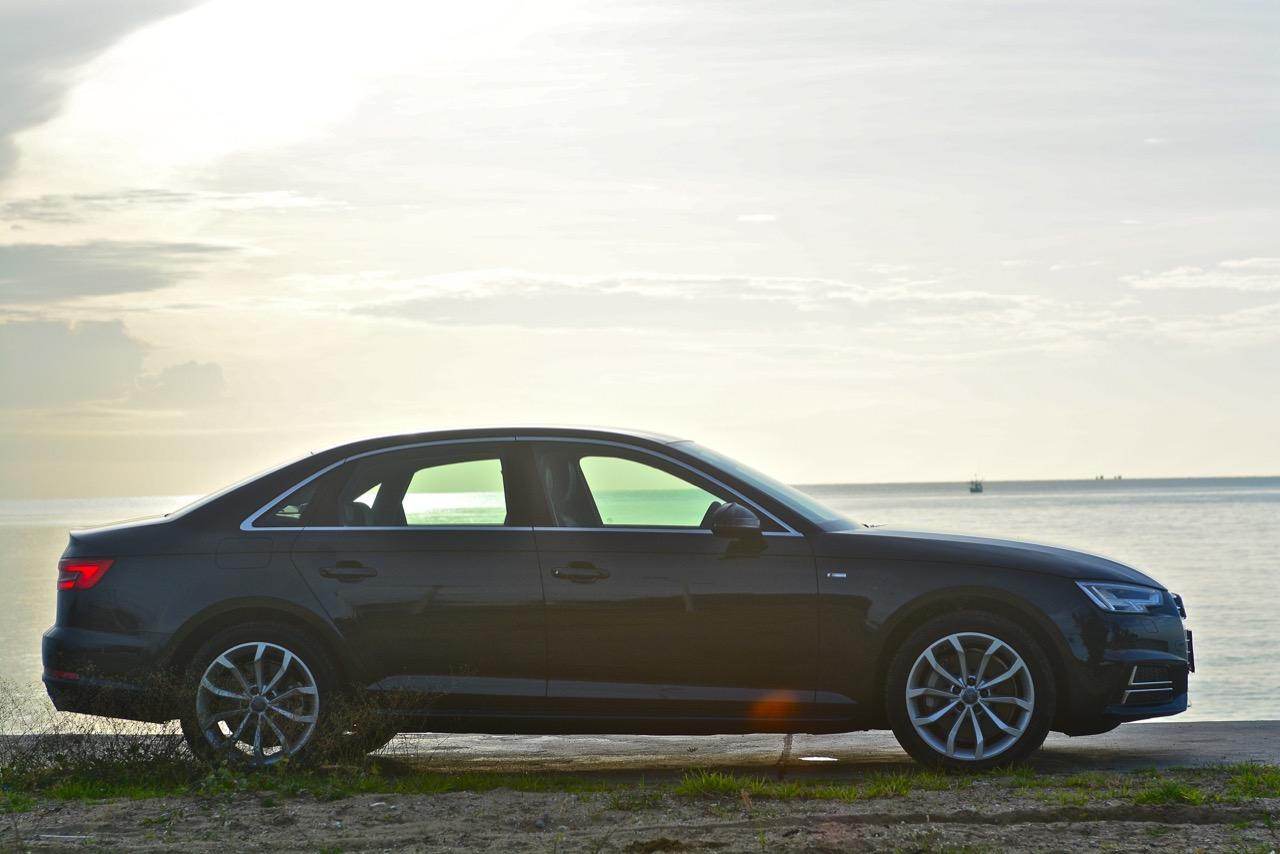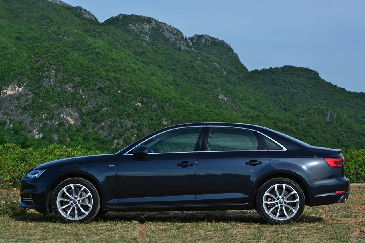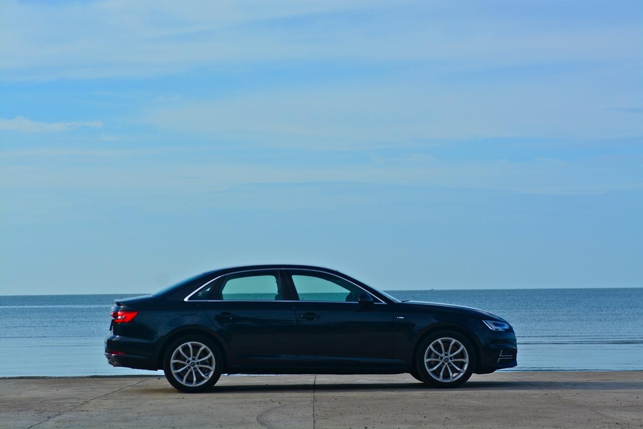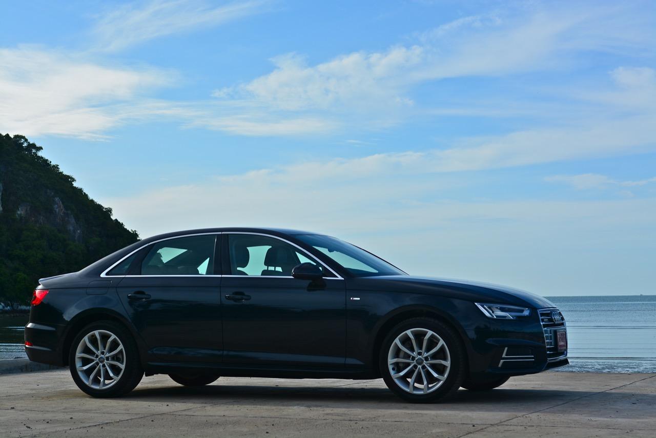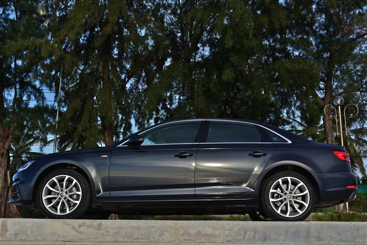 ด้านข้างของ A4 ไหลลื่นด้วยเส้นข้างลำตัวลากจากมุมไฟหน้าผ่านบานประตูไปจนถึงมุมของไฟท้าย เสาหน้ามีขนาดค่อนข้างใหญ่ รวมถึงเสาท้ายก็ยังใหญ่ตามไปด้วยแบบช่วยไม่ได้ บานประตูทั้งสี่บริเวณขอบกระจกกรุทับด้วยงานอัลลอยสีเงินเพื่อยกระดับความหรูดูแล้วสบายตา ล้ออัลลอยขอบ 18 นิ้ว ห่อรัดเอาไว้ด้วยยางเกาหลียี่ห้อ Hankook รุ่น ventus s1 evo2 ไซส์ 245/40 R18 เท่ากันทั้ง 4 ล้อ เนื่องจากเป็นรถขับเคลื่อนทุกล้อจึงมีความจำเป็นที่จะต้องยัดยางให้เท่ากันทั้งหมด ไฟท้ายหลอด LED มีดีไซน์ที่คมกริบราวกับมีดโกนและเชื่อมโยงเหลี่ยมมุมของตัวรถ A4 ได้อย่างกลมกลืน