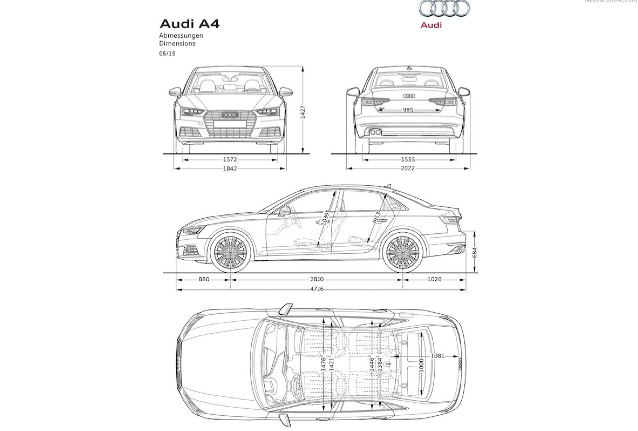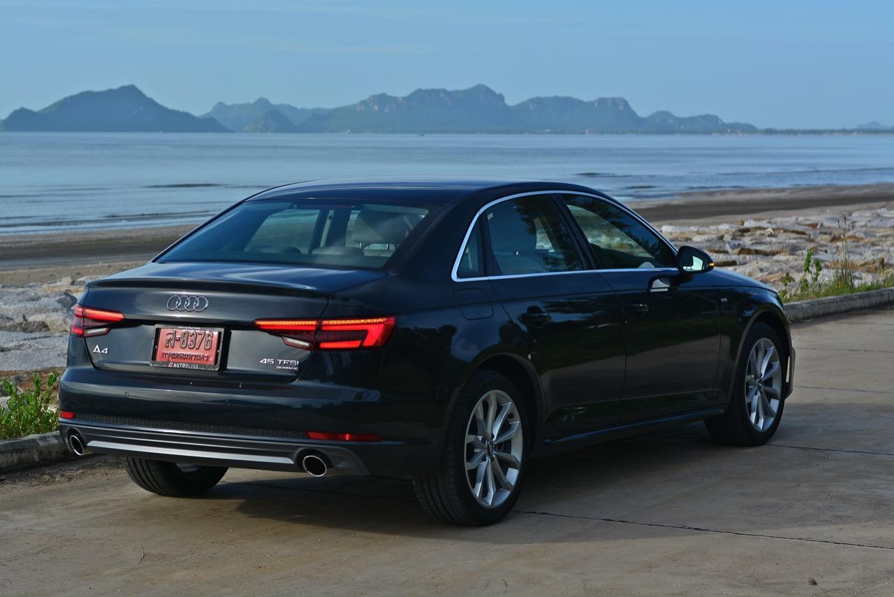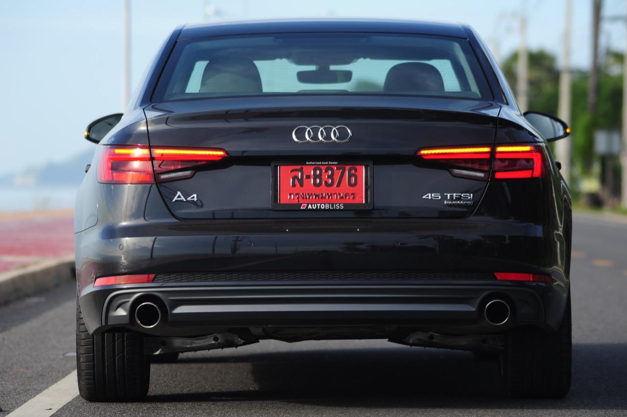 Audi New A4 รุ่น 45 TFSI Quattro S-Line เวอร์ชั่น 2017 ราคา 3,149,000 บาท มาพร้อมกับเรือนร่างที่ใหญ่โตขึ้นเมื่อเทียบกับ A4 รุ่นเก่า มิติตัวถังมีความกว้าง 1,842 มิลลิเมตร ยาว 4,726 มิลลิเมตร สูง 1,427 มิลลิเมตร ความกว้างฐานล้อ วัดจากดุมหน้าไปหลัง 2,820 มิลลิเมตร ความกว้างฐานล้อหน้า 1,572 มิลลิเมตร ส่วนความกว้างฐานล้อหลังอยู่ที่ 1,555 มิลลิเมตร น้ำหนัก 1,510 กิโลกรัม ขนาดของตัวรถพอฟัดพอเหวี่ยงสูสีกับ BMW Series-3 และ Mercedes Benz C-Class สำหรับ A4 รุ่น 45 TFSI ติดตั้งระบบขับเคลื่อนแบบ 4 ล้อตลอดเวลา Quattro เสริมความคมเข้มด้านมุมมองด้วยอุปกรณ์ตกแต่งของ S-Line ไล่เรียงจากสปอยเลอร์หน้า-หลัง ล้ออัลลอยขอบ 18 นิ้ว กาบบันได ไฟหน้าที่มีความเฉียบคมของงานดีไซน์ กระจังหน้าทรงเหลี่ยม สัญลักษณ์ของ Audi รุ่นใหม่ และความสามารถในการขับเคลื่อนจากเครื่องยนต์เบนซิน 2 ลิตรอัดอากาศด้วยเทอร์โบ