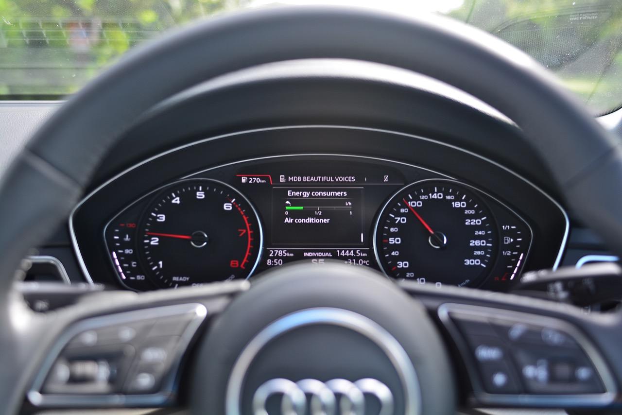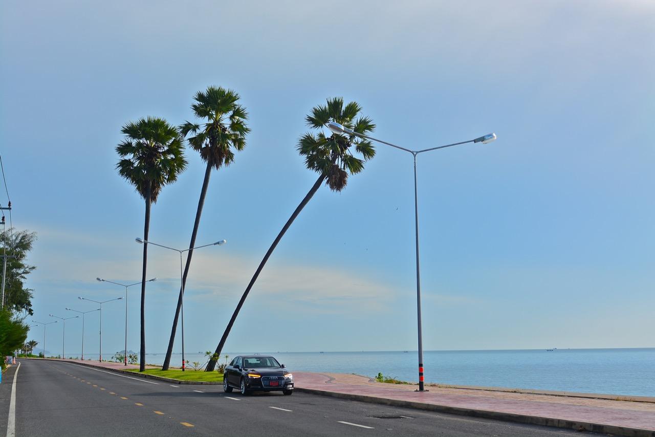 พวงมาลัยของมันถูกปรับให้คาอยู่ในโหมด Dynamic การกระทำแบบนั้นจะทำให้พวงมาลัยของ A4 หนักขึ้นเล็กน้อย แต่ก็มีความเหมาะสมกับการใช้ความเร็ว หากชอบพวงมาลัยที่เบาสบายข้อมือก็แค่เข้าไปปรับในโหมด Individual โดยคาไว้ที่ Comfort แค่นี้พวงมาลัยของมันก็จะเบาราวกับรถญี่ปุ่น การหักเลี้ยวไปตามโค้งยาวๆ แถบปากน้ำปราณนั้น พวงมาลัยอัตราทดแปรผันให้ความรู้สึกมั่นคงและเชื่องไม้เชื่องมือ หมุนไปเท่าไรก็เลี้ยวไปเท่านั้น ไม่มีขาดหรือเกิน การปรับตั้งพวงมาลัยให้เหมาะกับการขับไม่ว่าจะขับช้าหรือเร็วเป็นเรื่องที่ส่งผลต่อการควบคุม หากตั้งพวงมาลัยให้เบาแต่ดันขับเร็วจิ๊ดก็จะทำให้เกิดการขัดแย้งกันอยู่บ้างตามหลักกลศาสตร์ของการเคลื่อนที่ เมื่อต้องการไปเร็วๆ ขับแรงๆ พวงมาลัยที่ตึงข้อไม่ไวหรือเบามากจนเกินไปจะทำให้คุณควบคุมรถได้ดีขึ้น