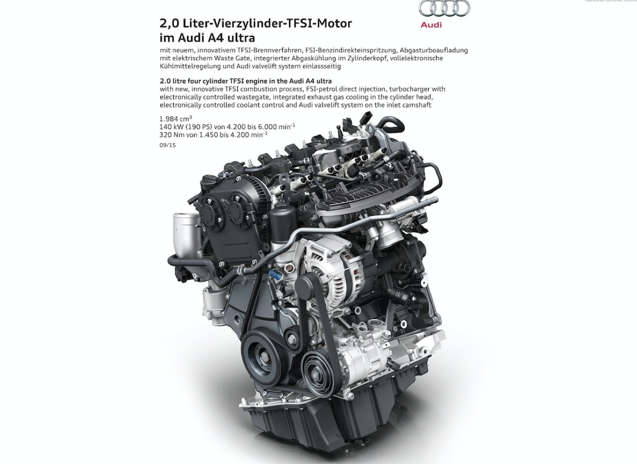 เทอร์โบแบบ Twin Scroll อัดอากาศด้วยแรงดัน 1.4 บาร์ แรงกว่าเทอร์โบของ A4 รุ่น 40 TFSI ที่มีแรงดัน 0.8 บาร์อยู่พอสมควร กลไกของระบบวาล์วแปรผัน Audi valvelift system คอยปรับเปลี่ยนองศาของการเปิดวาล์วได้มากถึง 60 องศา ส่วนวาล์วไอเสียแปรผันได้ 30 องศา ระบบเพลาราวลิ้นของเครื่องยนต์ตัวนี้จะคอยปรับเปลี่ยนองศาของวาล์วไอเสียให้มีความสัมพันธ์กับรอบเครื่องยนต์เป็นหลัก โดยปรับระยะของการเปิดวาล์วเพื่อระบายไอเสียออกจากห้องเผาไหม้ได้อย่างรวดเร็ว