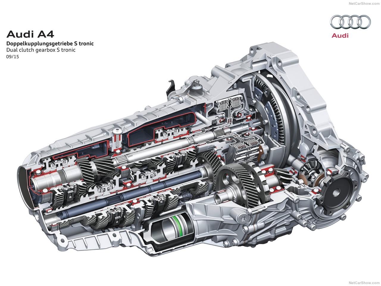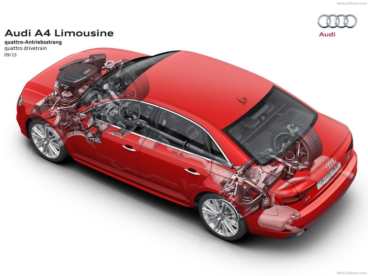 ระบบส่งกำลังหรือเกียร์ของ A4 45 TFSI เป็นเกียร์ออโต้คลัตช์คู่แบบ 7 สปีด S-Tronic ส่วนกลไกขับเคลื่อน 4 ล้อ Quattro อัพเกรดด้วยเฟืองแบบ Torsen ไปเป็นแบบ Crown-gear ที่มีขนาดเล็กลงและมีน้ำหนักเบาขึ้น 2 กิโลกรัม Quattro ใน A4 ทำงานแบบกึ่งกลไกส่งถ่ายแรงบิดทั้งหมดไปยังล้อหน้าและหลัง ในสภาพการณ์ปกติ A4 จะมีแรงบิดที่ล้อหน้า 40% และที่ล้อหลัง 60% แรงบิดจะแปรผันไปตามสภาพการณ์ ล้อหน้าสามารถทำงานด้วยแรงบิด 70% ขณะเดียวกันล้อหลังก็สามารถรับแรงบิดได้ถึง 85% การปรับเปลี่ยนส่งกำลังไปยังล้อหน้าและหลังช่วยแก้อาการที่เกิดขึ้นไม่ว่าจะเป็นอาการหน้าดื้อโค้งหรือท้ายปัด