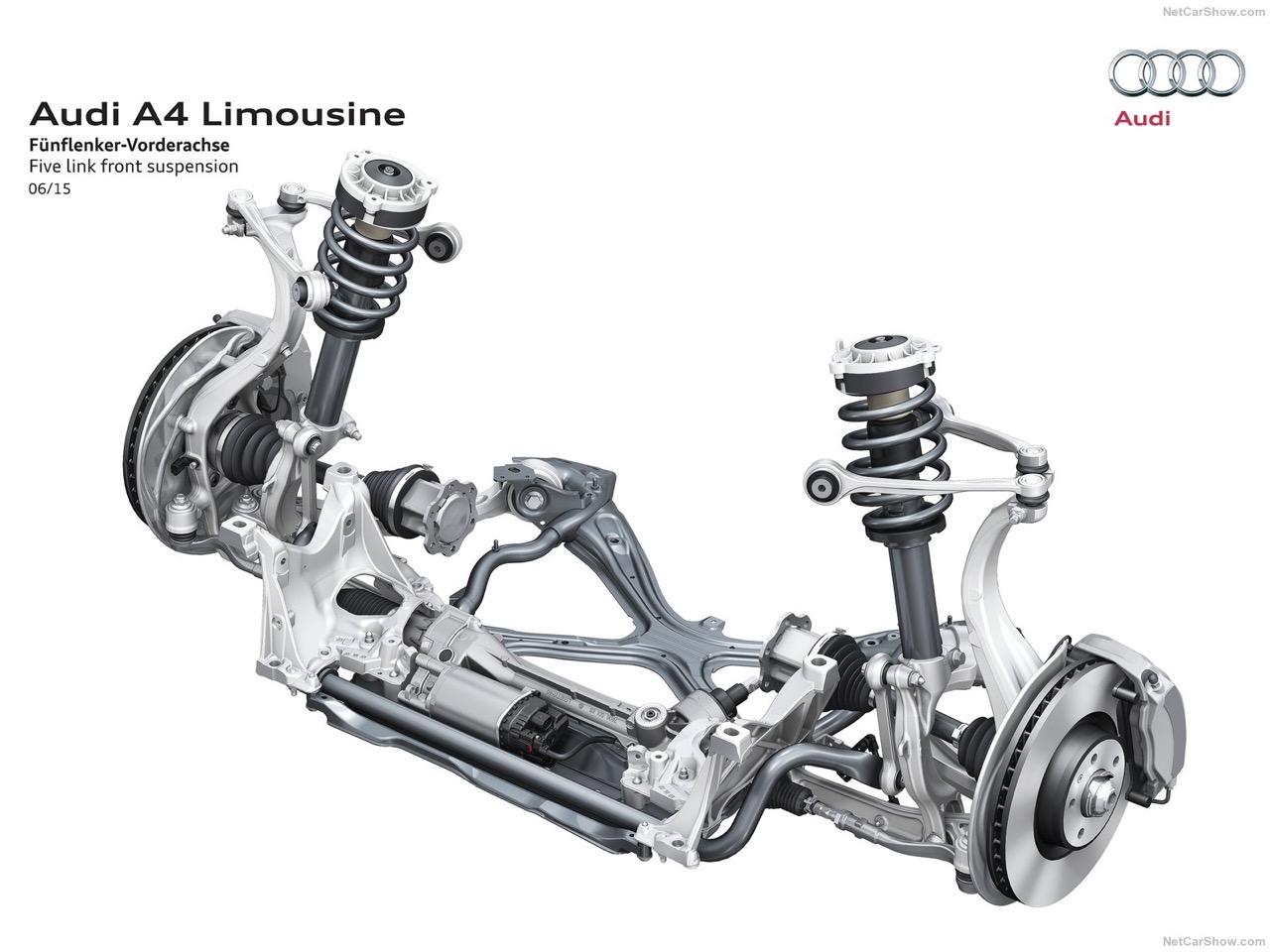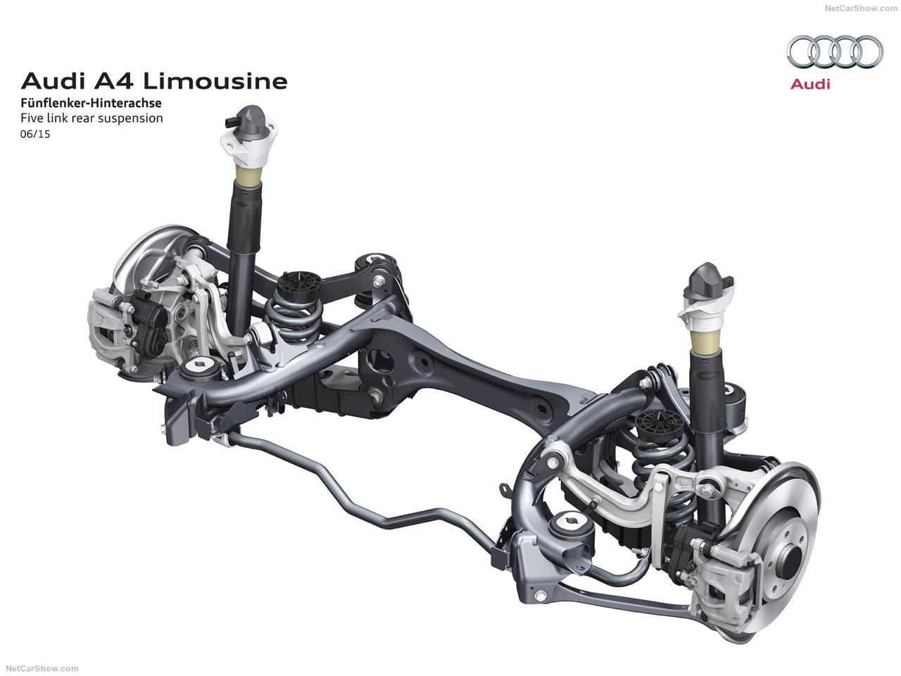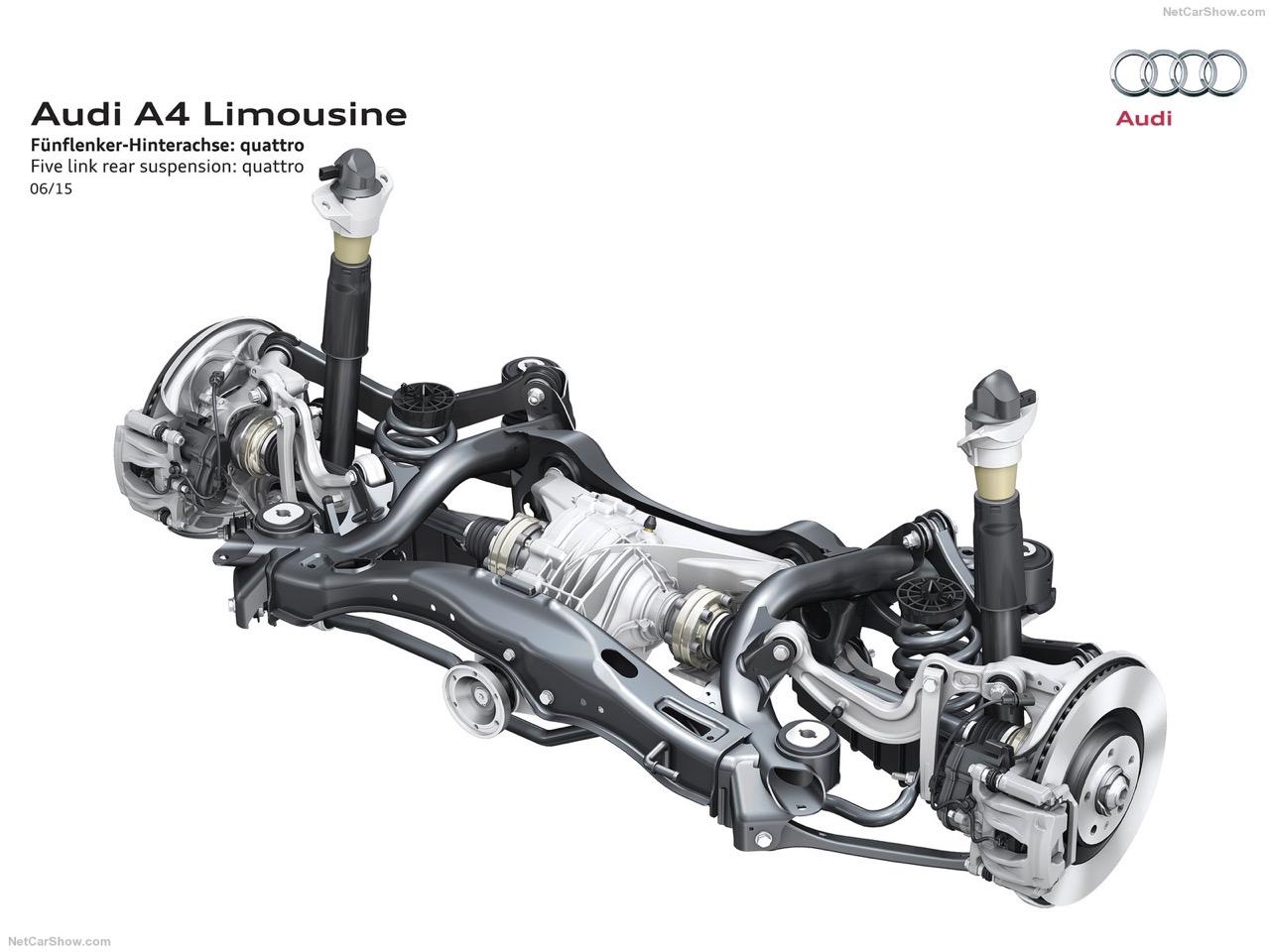 ระบบรองรับหรือช่วงล่างของ A4 45 TFSI Quattro S-Line ทั้งหน้าและหลังเป็นแบบ Five link การนำเอาชิ้นส่วนอัลลอยมาใช้ในช่วงล่างของรถคันนี้ทำให้น้ำหนักใต้สปริงหายไป 5 กิโลกรัม โช็คอัพแบบ MONO-tube ถูกปรับตั้งให้สอดคล้องกับรูปแบบของช่วงล่าง รวมถึงค่าสปริงที่มีการปรับให้ขับได้สบายมากยิ่งขึ้น ลดอาการกระด้างและทำให้เกิดความเสถียรเมื่อวิ่งผ่านผิวถนนที่ไม่เรียบ