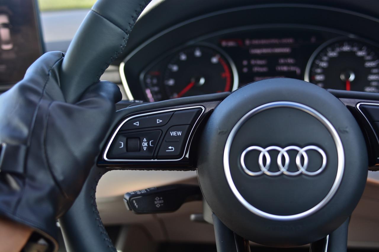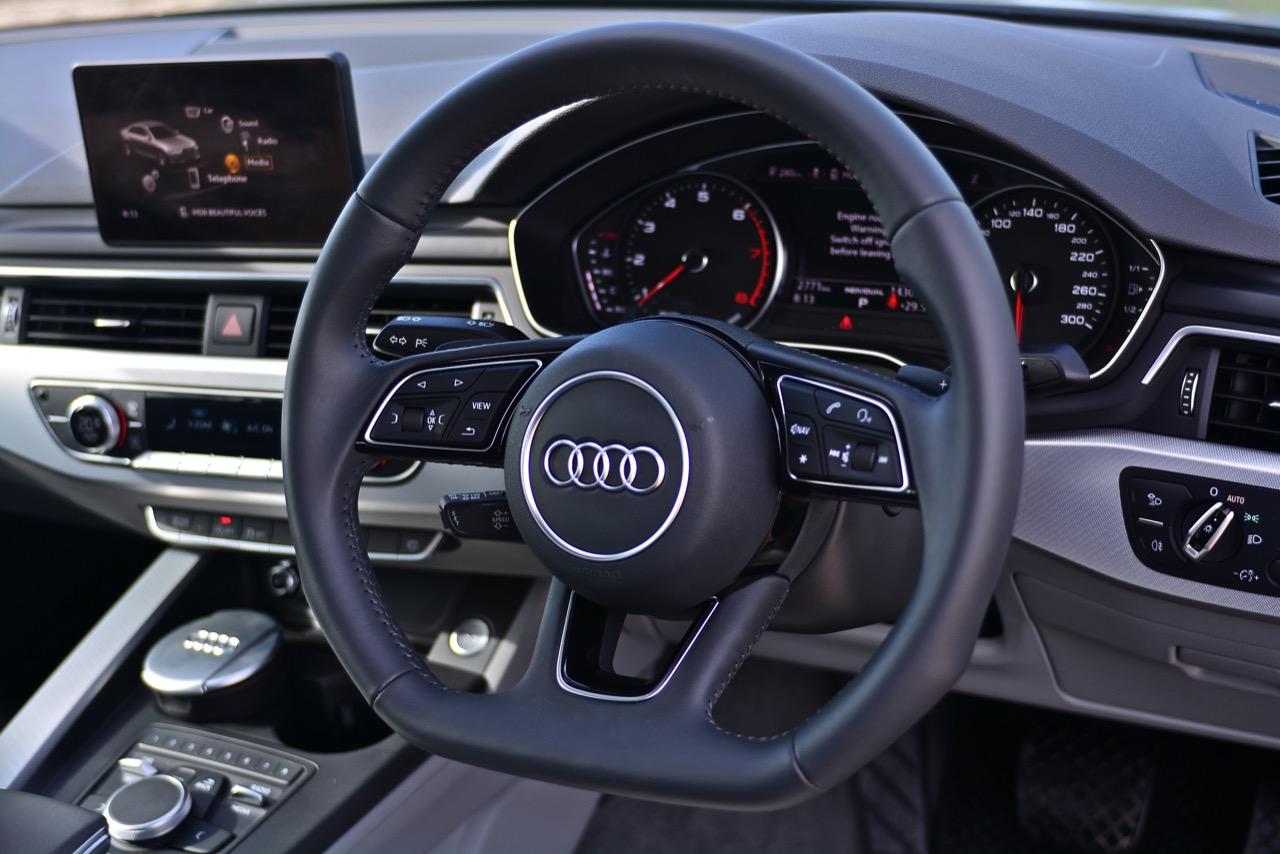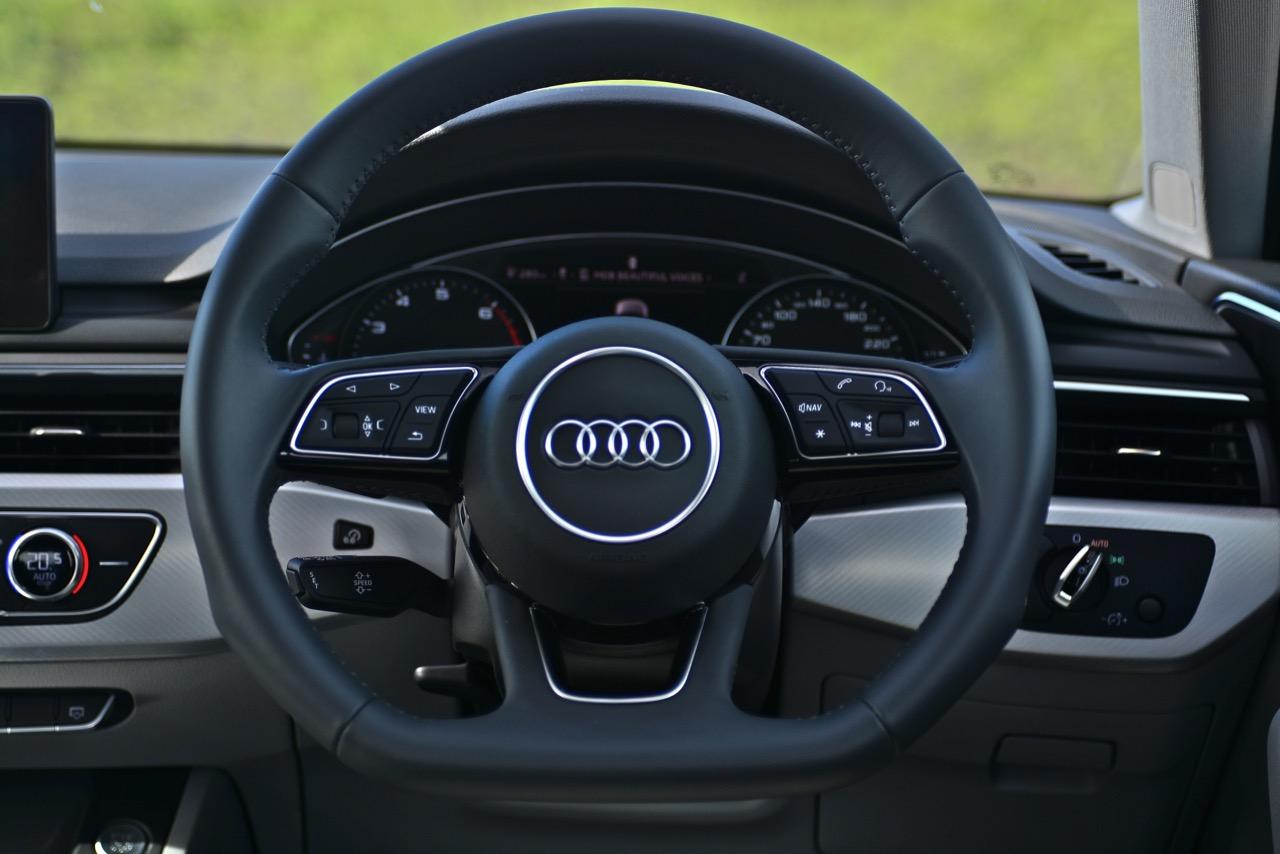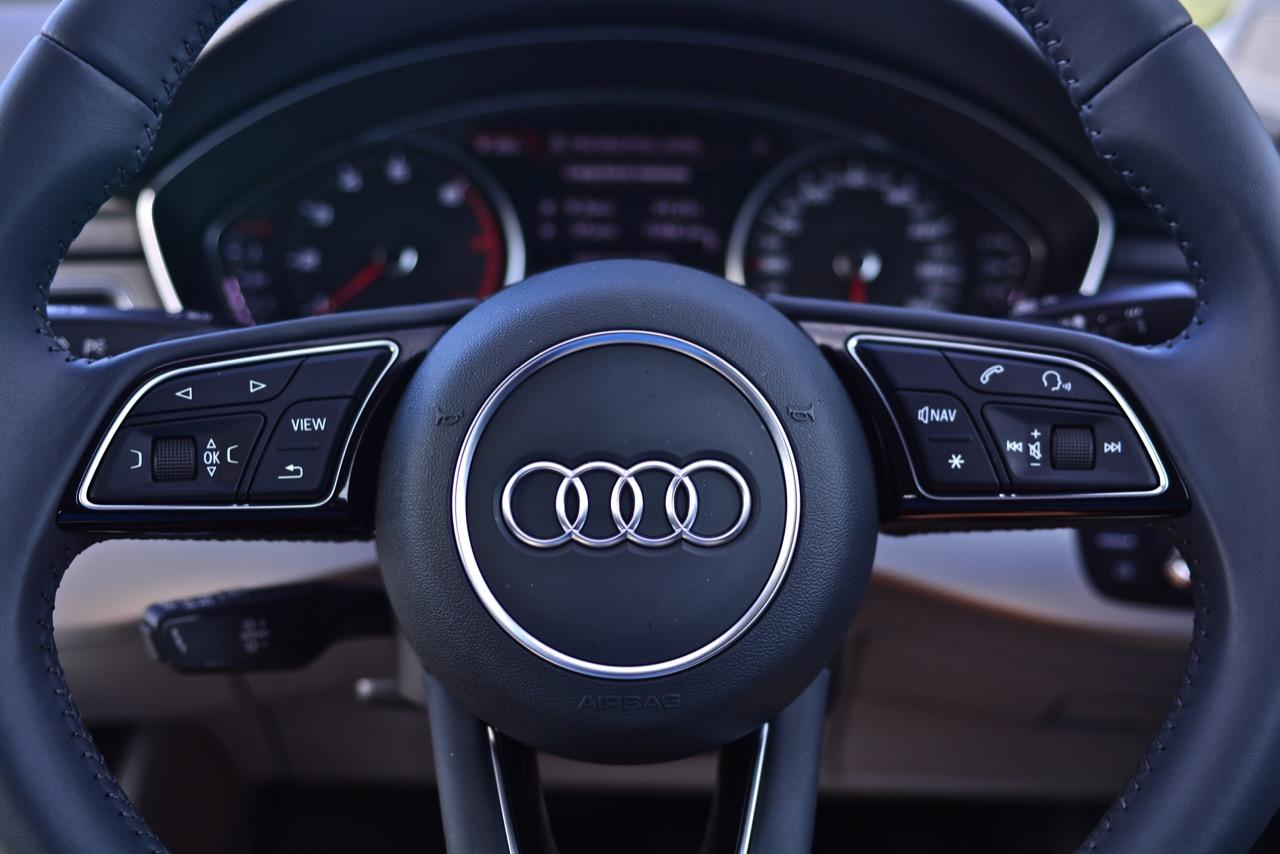 พวงมาลัยหุ้มหนังแท้ทรง 3 ก้านฐานตัดออกแนวสปอร์ต ก้านวงมีสวิตช์ปรับตั้งมัลติฟังก์ชั่นสำหรับการปรับเครื่องเสียง รับหรือวางสายโทรศัพท์ ก้านสวิตช์ปรับตั้งความเร็วอัตโนมัติ Cruise Control แป้นเปลี่ยนตำแหน่งเกียร์หลังพวงมาลัย Paddle Shift พวงมาลัยหนังแท้ของ A4 มีขนาดกำลังพอดีไม่ใหญ่หรือเล็กเกินไป ทำให้ยึดจับได้อย่างถนัดมือ พวงมาลัยของมันยังปรับได้ถึง 4 ทิศทาง แต่ใช้การปรับด้วยมือแทนที่จะเป็นการปรับด้วยไฟฟ้า