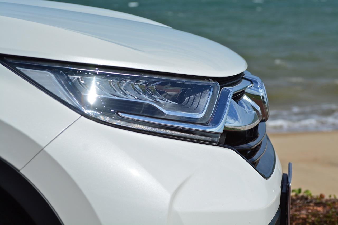 กระจังหน้าโครเมียมแบบใหม่ ไฟหน้า LED ใหม่หมด สปอยเลอร์ที่ยื่นออกจากส่วนหน้าของรถเล็กน้อยกับไฟตัดหมอก LED ชายล่างของสปอยเลอร์มีตะแกรงทรงรังผึ้งซึ่งเป็นช่องรับอากาศเพื่อระบายความร้อนให้กับเครื่องยนต์ ตัวถังถูกยืดขนาดให้ยาวขึ้นเล็กน้อยเพื่อยัดเบาะนั่งแถวที่สามซึ่งไม่ค่อยได้ใช้งานเท่าที่ควร เบาะนั่งแถวที่สามเมื่อพับลงราบกับพื้นก็จะกลายเป็นพื้นที่สำหรับขนสัมภาระ หน้าตาของ Honda ยุคใหม่เริ่มคล้ายกันเข้าไปทุกทีไม่ว่าจะเป็นงานดีไซน์กระจังหรือไฟหน้าที่ออกมาคล้ายๆ กัน ไฟหรี่กลางวัน LED Daytime Running Lights อุปกรณ์ที่ขาดไม่ได้สำหรับรถยนต์รุ่นใหม่ก็ติดตั้งมาให้โดยยัดรวมกันอยู่ในกรอบไฟหน้าอย่างสวยงาม