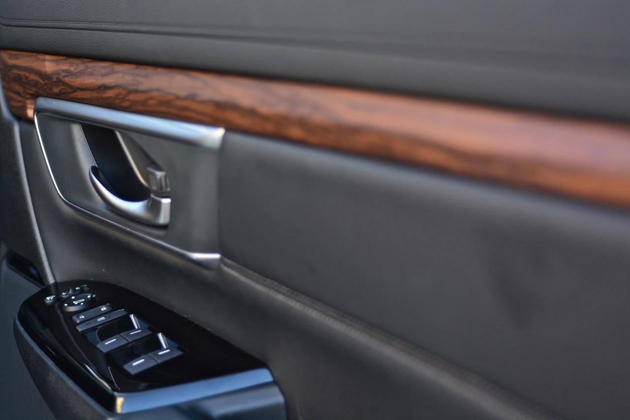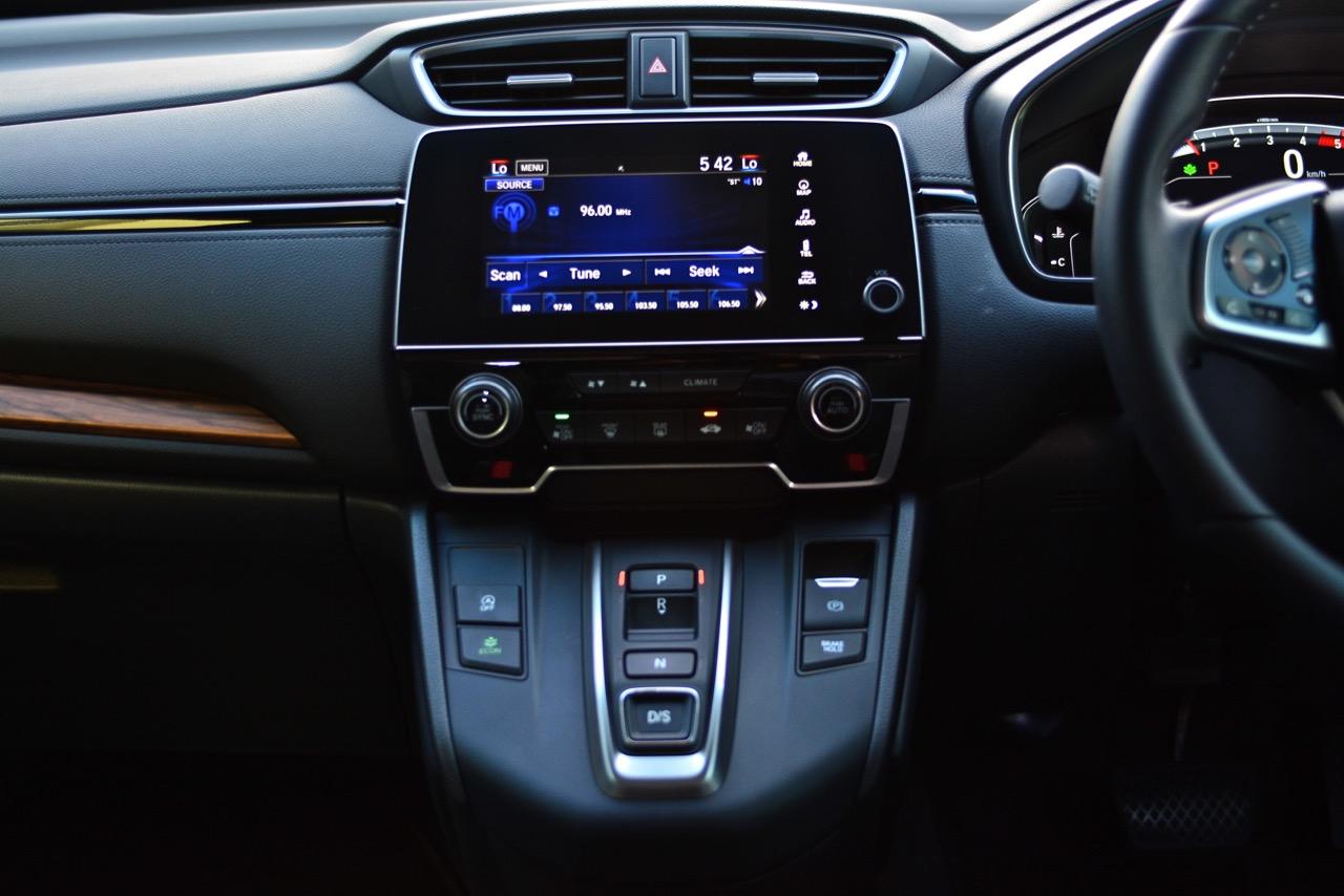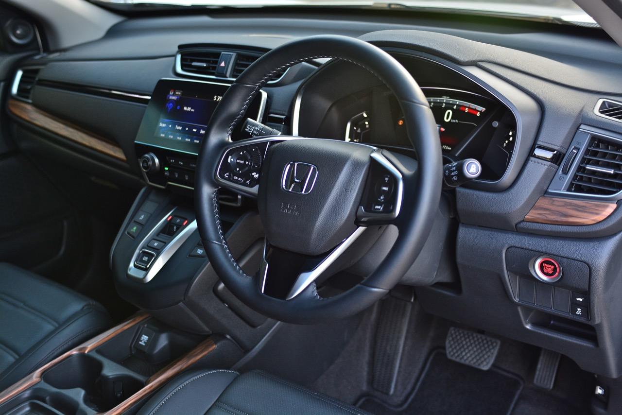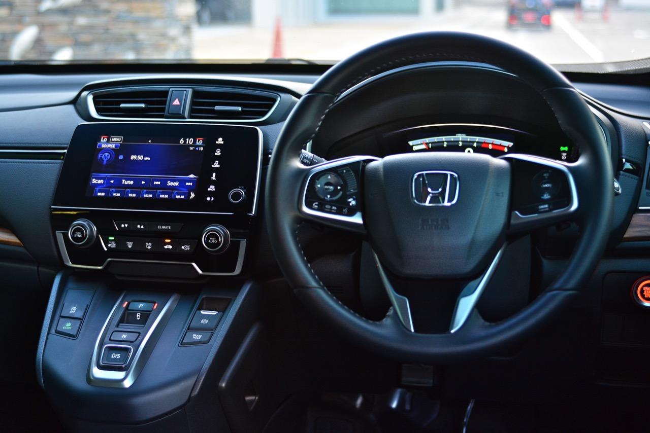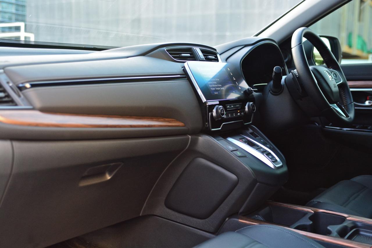 คอนโซลแดชบอร์ดสไตล์ยุโรปของ New CR-V ทำให้ภายในของมันหรูหราขึ้นมาก รูปแบบเดิมๆในรุ่นที่แล้วถูกปรับใหม่ทั้งหมดแม้แต่วัสดุพวกพลาสติกก็มีเกรดที่ดีขึ้น ลายไม้ที่กรุอยู่กลางแผงแดชบอร์ดกับแผงประตูช่วยทำให้ห้องโดยสารของ New CR-V มีความเป็นผู้ใหญ่มากยิ่งขึ้นพร้อมความหรูหราที่มากกว่าเดิม ช่องแอร์ทรงเหลี่ยมออกแบบได้ดีแถมยังดูหรูด้วยการกรุขอบช่องแอร์ด้วยชิ้นงานโครเมียมเติมรายละเอียดกันอย่างลึกซึ้ง วัสดุพวก Piano Black ประดับประดาอยู่ทั่วไปหมดทำให้เวลาใช้งานต้องคอยเช็ดถูทำความสะอาดเนื่องจากฝุ่นจับง่ายมาก