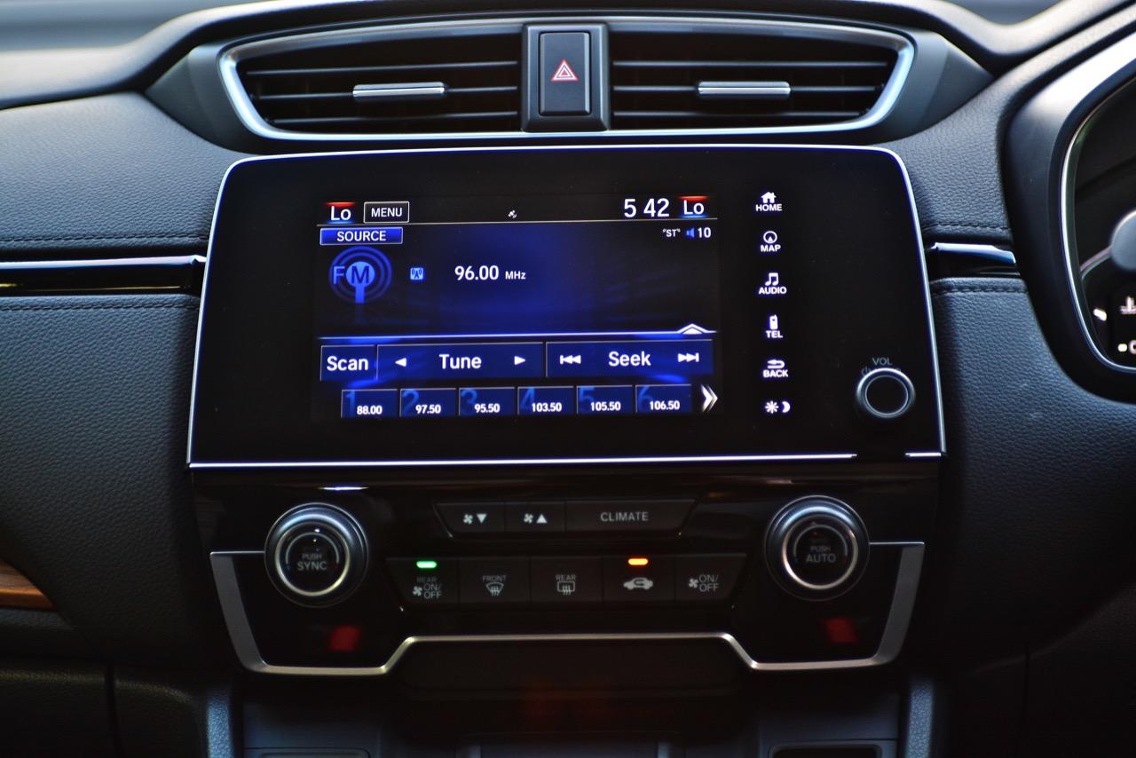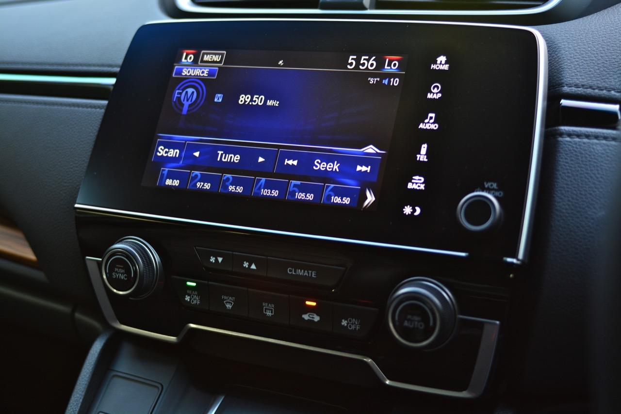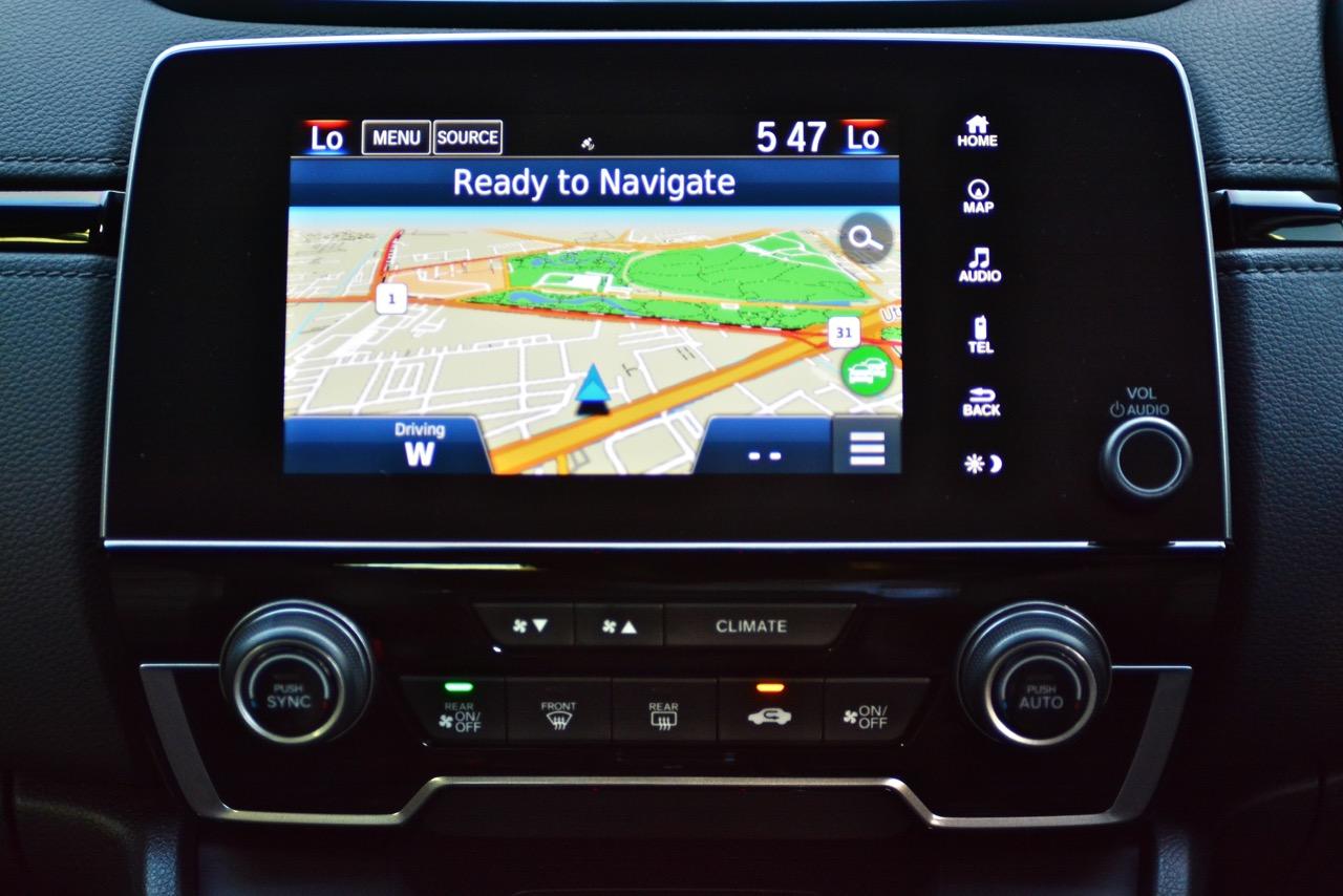 จอแสดงผลกลางขนาด 7 นิ้ว สั่งงานด้วยระบบสัมผัสลงไปที่หน้าจอมีเนวิเกเตอร์ติดมาให้ใช้บอกเส้นทางที่ไม่คุ้นเคย เป็นมอนิเตอร์ของกล้องมองหลัง ระบบเครื่องเสียงหน้าจอสัมผัสรองรับการเชื่อมต่อสารพัดสารพัน เช่น Apple Car Play แต่รองรับเฉพาะสมาร์ทโฟนบางรุ่นเท่านั้น ระบบเชื่อมต่อโทรศัพท์ไร้สายแบบบลูทูธ ลำโพงของระบบเครื่องเสียงจำนวน 8 ตัว ให้เสียงที่ไม่ได้โดดเด่นแต่ก็ไม่ได้แย่แค่พอฟังได้จะเอาดีเอาดังกว่านี้คงต้องไปติดตั้งเพิ่มเติมเอาเอง ด้านหน้าในห้องโดยสารติดลำโพงมาให้ 4 ตัว โดยลำโพง 2 ตัวจะอยู่ที่เสาหน้า (ทวิตเตอร์) อีก 2 ตัวติดตั้งที่ประตูหลัง ทวิตเตอร์อีก 2 ตัว อยู่ที่ประตูหลังเช่นเดียวกัน การใช้งานหน้าจอมอนิเตอร์แบบสัมผัสก็ไม่มีอะไรยุ่งยากเนื่องจาก Honda ยัดโปรแกรมภาษาไทยมาให้ใช้งานเหมือนเดิม