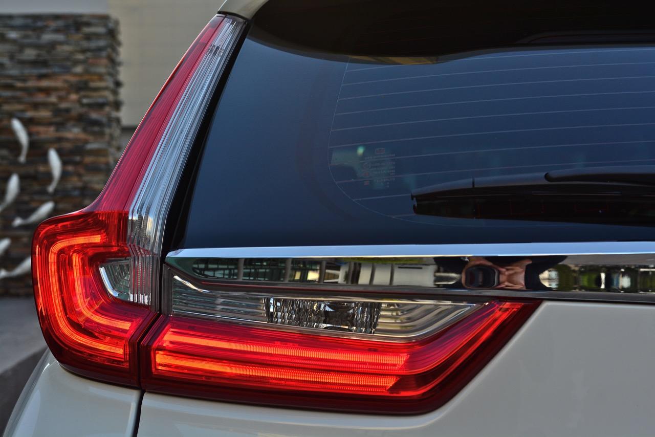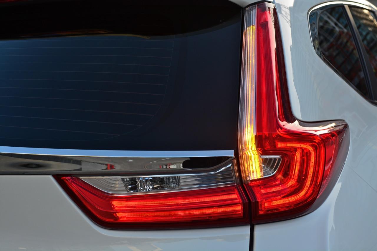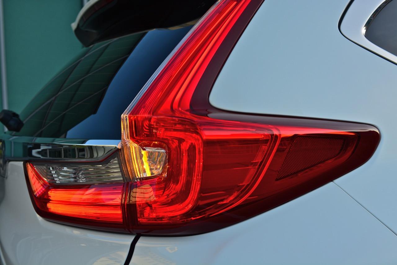 ด้านข้างตัวถังดูลงตัวมากกว่าเดิมจากเส้นสายที่ไหลลื่นโดยเฉพาะความลาดเอียงของเสาหน้า ชายล่างของบานประตูทั้ง 4 ติดตั้งกาบโครเมียมสีเงินเพื่อยกระดับความหรูหราแต่ไม่ยักกะมีแร็คหลังคาติดมาให้! ซุ้มล้อทั้ง 4 ข้างหุ้มด้วยพลาสติกกันกระแทกสีดำ ล้ออัลลอยลายกงจักรขนาด 18.7.5J ยัดยางเนื้อนิ่ม Toyo รุ่น Proxes R45 ไซส์ 235/60R18 แถมยางอะไหล่ขนาดเดียวกันกับล้อปกติ เสาท้ายเฉียบคมจากการออกแบบไฟท้ายแนวใหม่ หลังคาที่ค่อยๆ ลดระดับความลาดเอียงลงไปยังส่วนท้าย ไฟท้ายใหม่หลอด LED เปล่งประกายความสดใสออกมาเมื่อถูกคาดด้วยชิ้นงานพลาสติกโครเมียม ฝาท้ายของ New CR-V รุ่น DT EL 4WD เปิด-ปิดด้วยไฟฟ้าเพิ่มความสะดวกสบายจนติดเป็นนิสัยไม่ต้องมายืนยกขึ้นกดลงอีกต่อไปเมื่อต้องการจะเปิดฝาท้ายก็แค่กดสวิตช์ ฝาท้ายก็จะเปิดออกเองโดยไม่ต้องออกแรงกันให้เมื่อยแขน