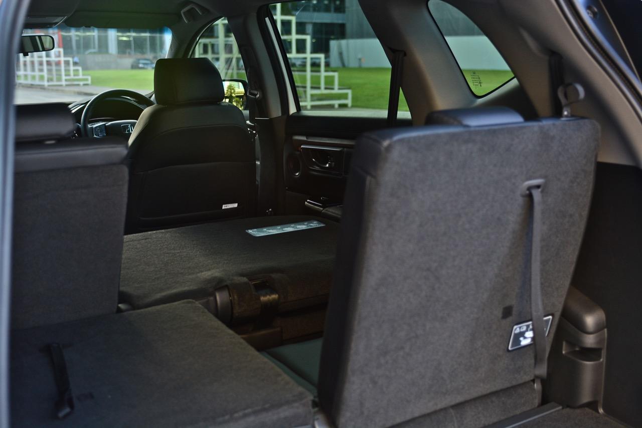ห้องโดยสารโอ่โถงมีพื้นที่เหลือๆ สำหรับผู้โดยสารและคนขับรวม 7 ที่นั่ง เบาะแถวที่ 3 ที่เพิ่มเข้ามาเหมาะกับเด็กตัวเล็กมากกว่าจะให้ผู้ใหญ่ตัวสูงนั่งโดยสาร หากไม่ขนกันไปทั้งตระกูล เบาะแถวที่ 3 มักจะถูกพับลงกับพื้นเพื่อเปิดพื้นที่สำหรับการใส่สัมภาระ ส่วนเบาะแถวที่ 2 ก็สามารถพับเพื่อเปิดพื้นที่กว้างๆ สำหรับการยัดรถจักรยานได้เหมือนกันโดยสามารถยัดเสือหมอบไซส์ 54 แบบไม่ต้องถอดล้อกันเลยทีเดียวแต่ก็จะเสียพื้นที่โดยสารด้านหลังไปทั้งหมด เบาะคู่หน้าปรับไฟฟ้า เบาะคนขับปรับไฟฟ้า 8 ทิศทาง ส่วนเบาะผู้โดยสารตอนหน้าก็ยังปรับไฟฟ้า 4 ทิศทางเบาะหุ้มหนังนั่งสบายขึ้นเยอะในจุดนี้ถือว่าทำออกมาได้ดี โดยเฉพาะพนักพิงศีรษะที่ออกแบบได้ดีมาก เอนหัวพิงลงไปก็พบกับความนุ่มของฟองน้ำที่ใช้รองไม่ดันจนหัวชะโงกไปข้างหน้าเหมือนรถบางรุ่น!