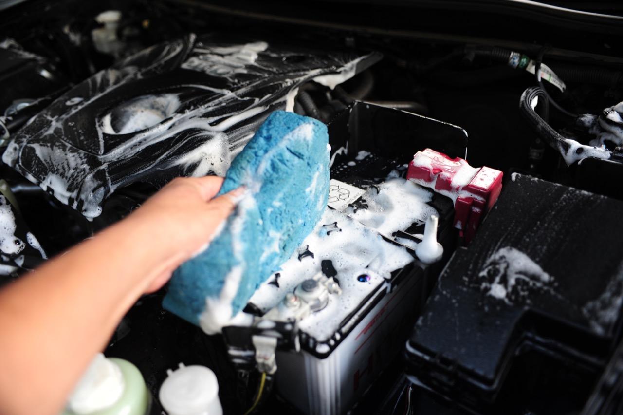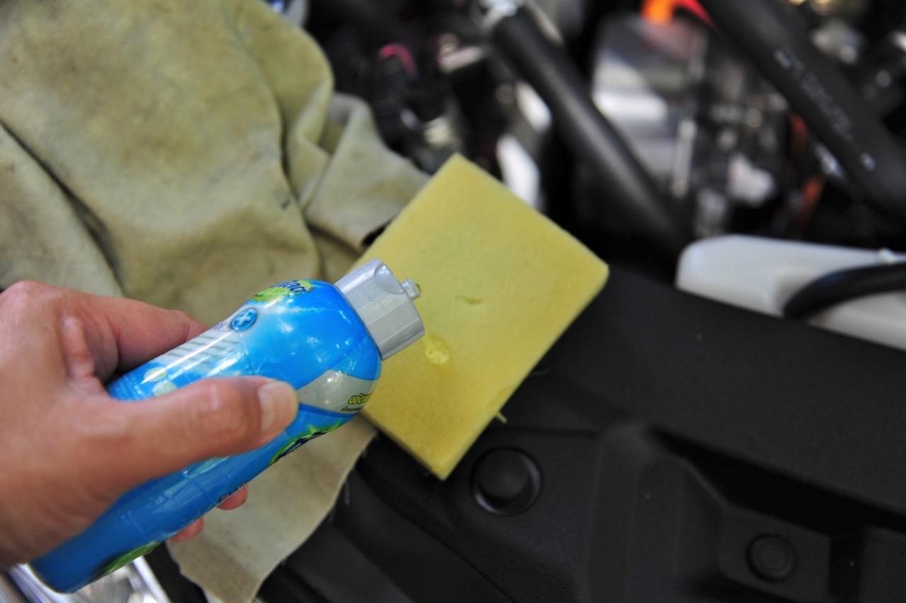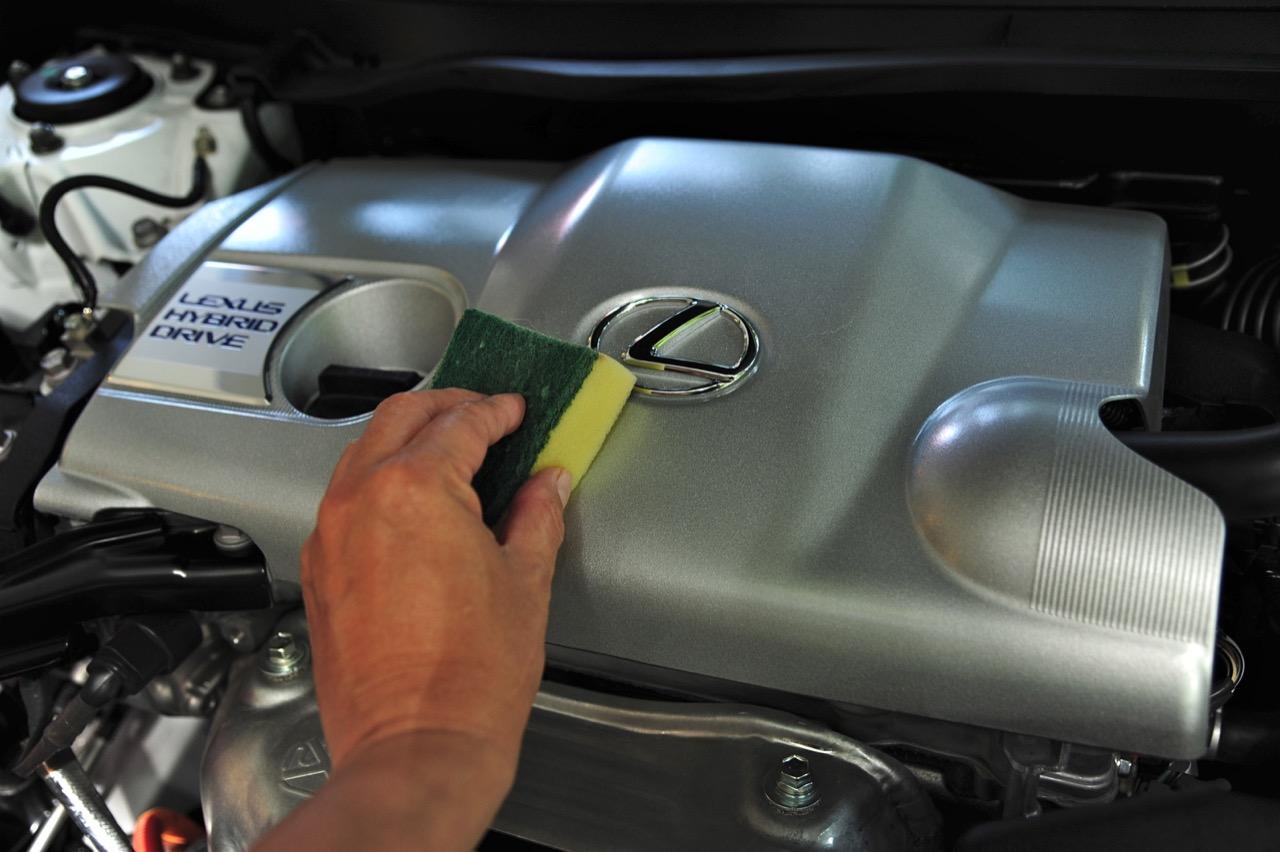 สำหรับเครื่องยนต์ หากมีคราบน้ำมันเครื่องดำๆ เกาะอยู่เยอะต้องพ่นสเปย์ทำความสะอาดเครื่องยนต์ปล่อยไว้สักพักจนคราบน้ำมันเครื่องดำๆ เริ่มละลายให้ใช้ฟองน้ำชุบซันไลน์จัดการเช็ดถูโดยห้ามเอาน้ำราดลงไปบนเครื่องเพื่อป้องกันความชื้นแทรกซึมเข้าไปในชิ้นส่วนที่มีกระแสไฟฟ้าเดินอยู่ เช็ดหลายๆ ครั้ง พร้อมกับทำความสะอาดฟองน้ำที่ใช้เช็ดไปด้วย เดี๋ยวเดียว เครื่องยนต์ที่เคยเน่าในก็จะกลับมาใหม่อีกครั้ง