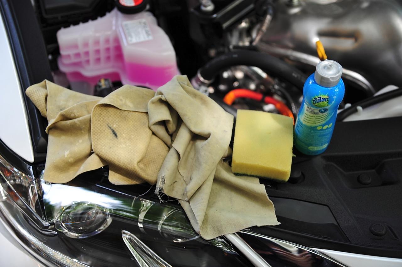อุปกรณ์ก็ไม่มีอะไรมาก น้ำยาล้างจาน ฟองน้ำเก่าที่ไม่ใช้ล้างจานแล้ว หรือฟองน้ำสำหรับล้างรถ สายยางต่อจากก๊อกน้ำ หากสกปรกมากไม่ได้ล้างมานานแสนนาน สเปย์ล้องห้องเครื่องยนต์ Sonax จะช่วยขจัดคราบน้ำมันตามขอบประเก็นของเครื่องยนต์หรือบริเวณกระปุกน้ำมันพวงมาลัยเพาเวอร์ที่คราบน้ำมันชอบไปเกาะยึดอยู่ทำให้ดำเป็นคราบที่ไม่ค่อยจะน่าดู อย่าลืมเตรียมผ้าเช็ดรถเอาไว้ด้วยพร้อมเครื่องดื่มเย็นๆ เนื่องจากช่วงนี้อากาศร้อนเกินบรรยาย