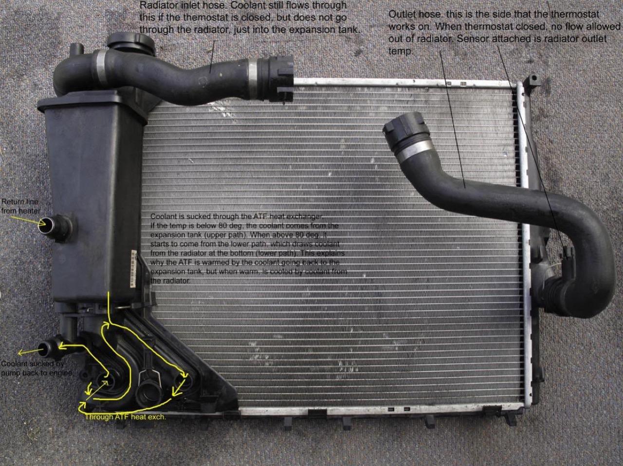 เมื่อติดเครื่องยนต์ น้ำหล่อเย็นยังคงไหลเวียนอยู่ในโพรงผนังรอบเครื่องยนต์ เนื่องจากวาล์วน้ำยังไม่ทำงาน (วาว์ลน้ำจะทำงานด้วยการเปิดวาว์ลก็ต่อเมื่ออุณหภูมิสูงถึงจุดที่เหมาะสม เมื่อเครื่องยนต์เริ่มร้อนขึ้นเรื่อยๆ ขณะขับขี่ อุณหภูมิของน้ำที่ไหลเวียนอยู่รอบเสื้อสูบก็เพิ่มขึ้น จนถึงจุดที่ทำให้วาล์วน้ำทำงาน เมื่อวาล์วน้ำได้รับความร้อนถึงจุดหนึ่งก็จะเปิดให้น้ำที่หมุนเวียนอยู่รอบเสื้อสูบ ถ่ายเทออกไปนอกเครื่องยนต์ผ่านไปตามท่อยางหม้อน้ำ เพื่อไปเข้าสู่ทางเข้าหม้อน้ำด้านบน น้ำที่มีอุณหภูมิสูงก็จะไหลจากด้านบนลงล่าง ผ่านครีบระบายความร้อนหม้อน้ำ (หรือที่เรียกกันว่ารังผึ้ง)