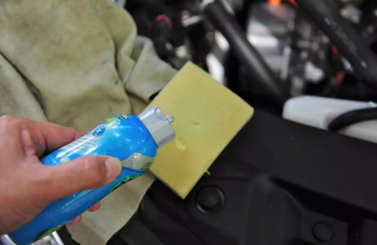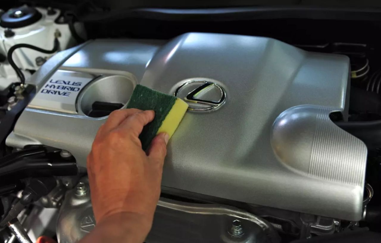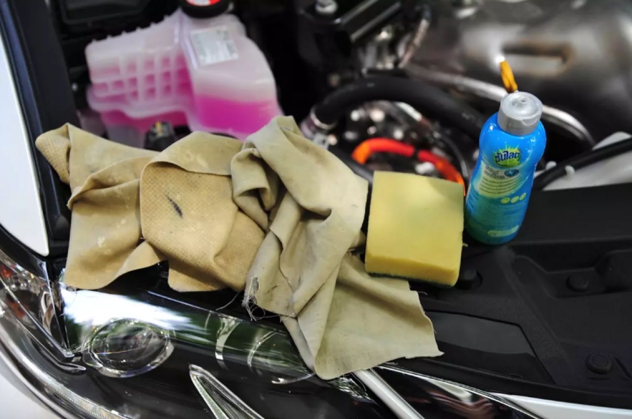 หากมีคราบน้ำมันเครื่องดำๆ เกาะอยู่เยอะ ต้องพ่นสเปรย์ทำความสะอาดเครื่องยนต์ ปล่อยไว้สักพักจนคราบน้ำมันเครื่องดำๆ เริ่มละลาย ให้ใช้ฟองน้ำชุบน้ำยาล้างจาน จัดการเช็ดถูโดยห้ามเอาน้ำราดลงไปบนเครื่อง เพื่อป้องกันความชื้นแทรกซึมเข้าไปในชิ้นส่วนที่มีกระแสไฟฟ้าเดินอยู่ เช็ดหลายๆ ครั้ง พร้อมกับทำความสะอาดฟองน้ำที่ใช้เช็ดไปด้วย เดี๋ยวเดียวเครื่องยนต์ที่เคยเน่าในก็จะกลับมาใหม่อีกครั้ง