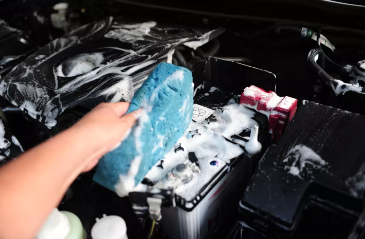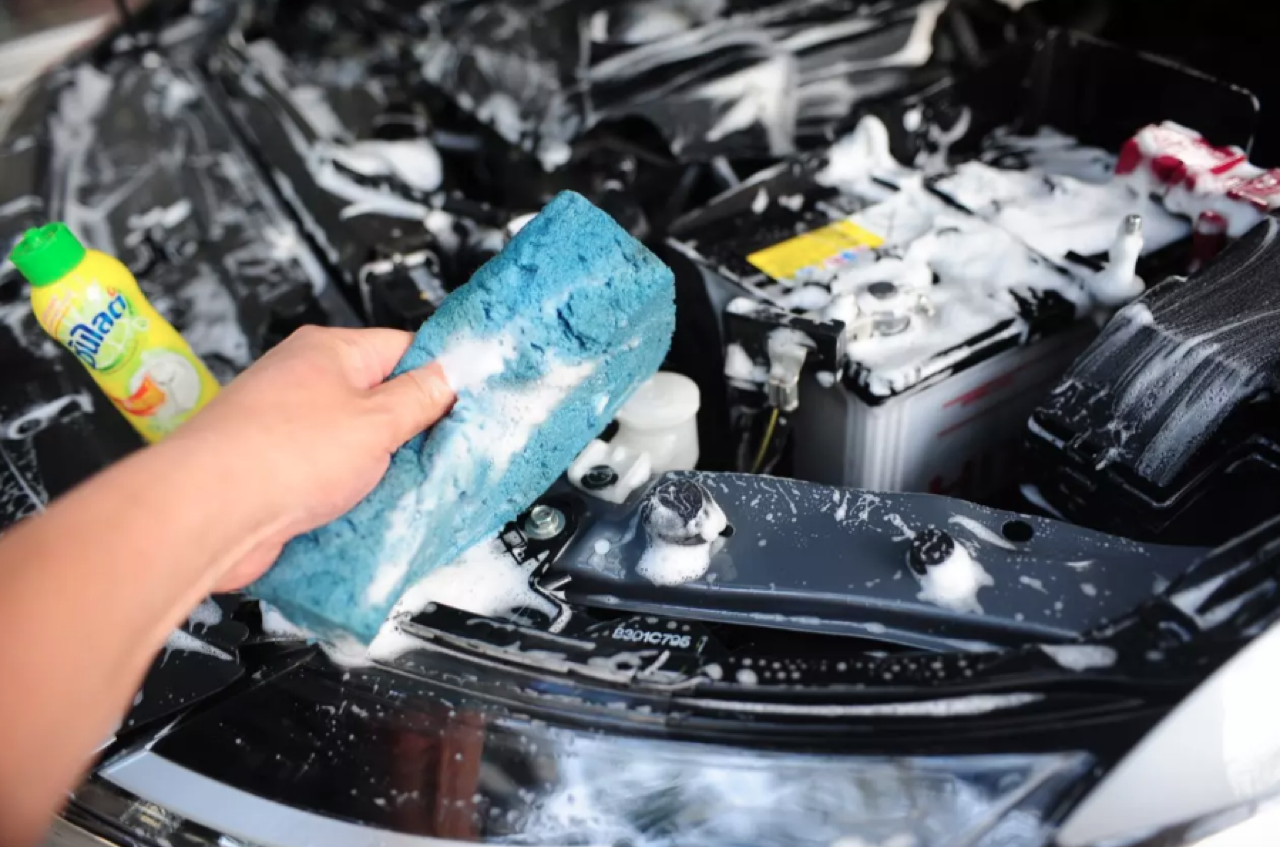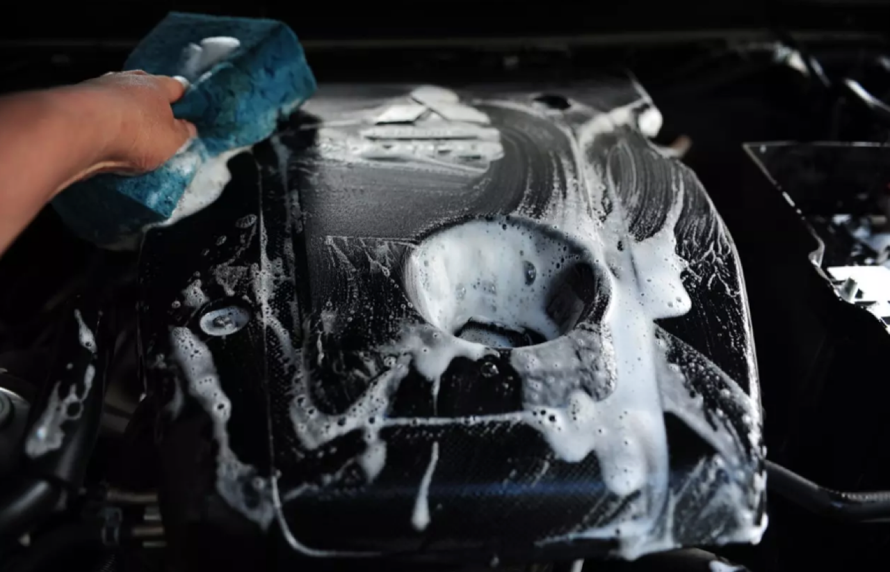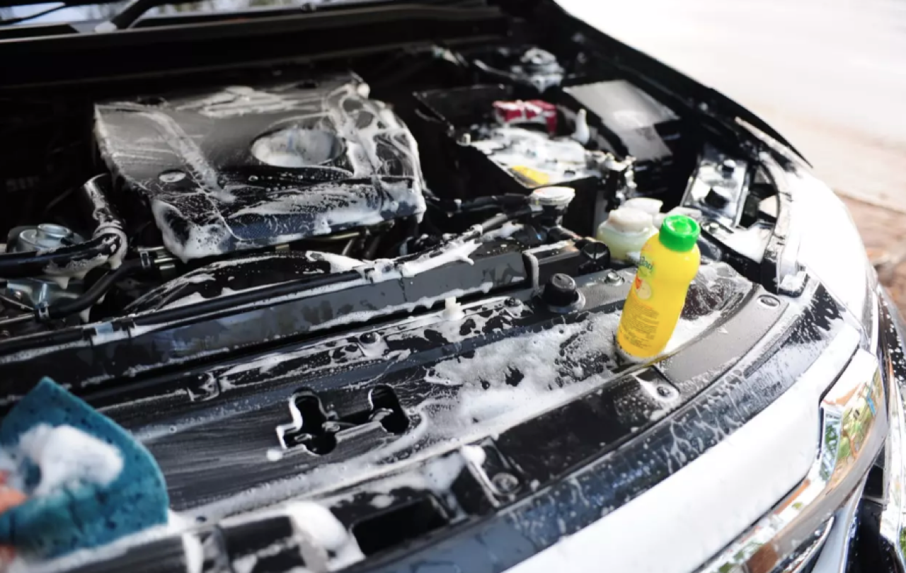 หากมีคราบน้ำมันเครื่องดำๆ เกาะอยู่เยอะ ต้องพ่นสเปรย์ทำความสะอาดเครื่องยนต์ ปล่อยไว้สักพักจนคราบน้ำมันเครื่องดำๆ เริ่มละลาย ให้ใช้ฟองน้ำชุบน้ำยาล้างจาน จัดการเช็ดถูโดยห้ามเอาน้ำราดลงไปบนเครื่อง เพื่อป้องกันความชื้นแทรกซึมเข้าไปในชิ้นส่วนที่มีกระแสไฟฟ้าเดินอยู่ เช็ดหลายๆ ครั้ง พร้อมกับทำความสะอาดฟองน้ำที่ใช้เช็ดไปด้วย เดี๋ยวเดียวเครื่องยนต์ที่เคยเน่าในก็จะกลับมาใหม่อีกครั้ง
