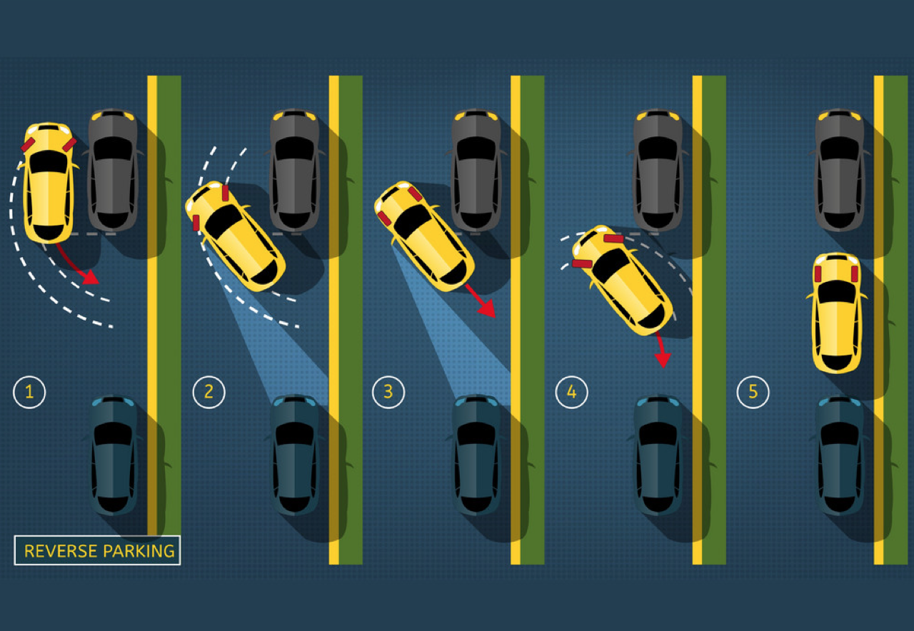 2. เข้าเกียร์ถอย แล้วคลายเท้าออกจากแป้นเบรกช้าๆ ในขณะเดียวกันก็หมุนพวงมาลัยไปทางซ้าย รถจะตีวงเลี้ยว จนกว่ารถของคุณจะทำมุมกับขอบถนนประมาณ 45 องศา หรือกะให้ท้ายรถของคุณแทงตรงไปยังจุดกึ่งกลางของที่ว่างที่จะถอยจอด เมื่อกระจกมองข้างด้านซ้ายตรงกับตำแหน่งของกันชนหลังของรถคันหน้าที่จอดอยู่แล้ว ให้ทำการคืนพวงมาลัยให้ล้อหน้าตรง แล้วถอยหลังต่อไปช้าๆ