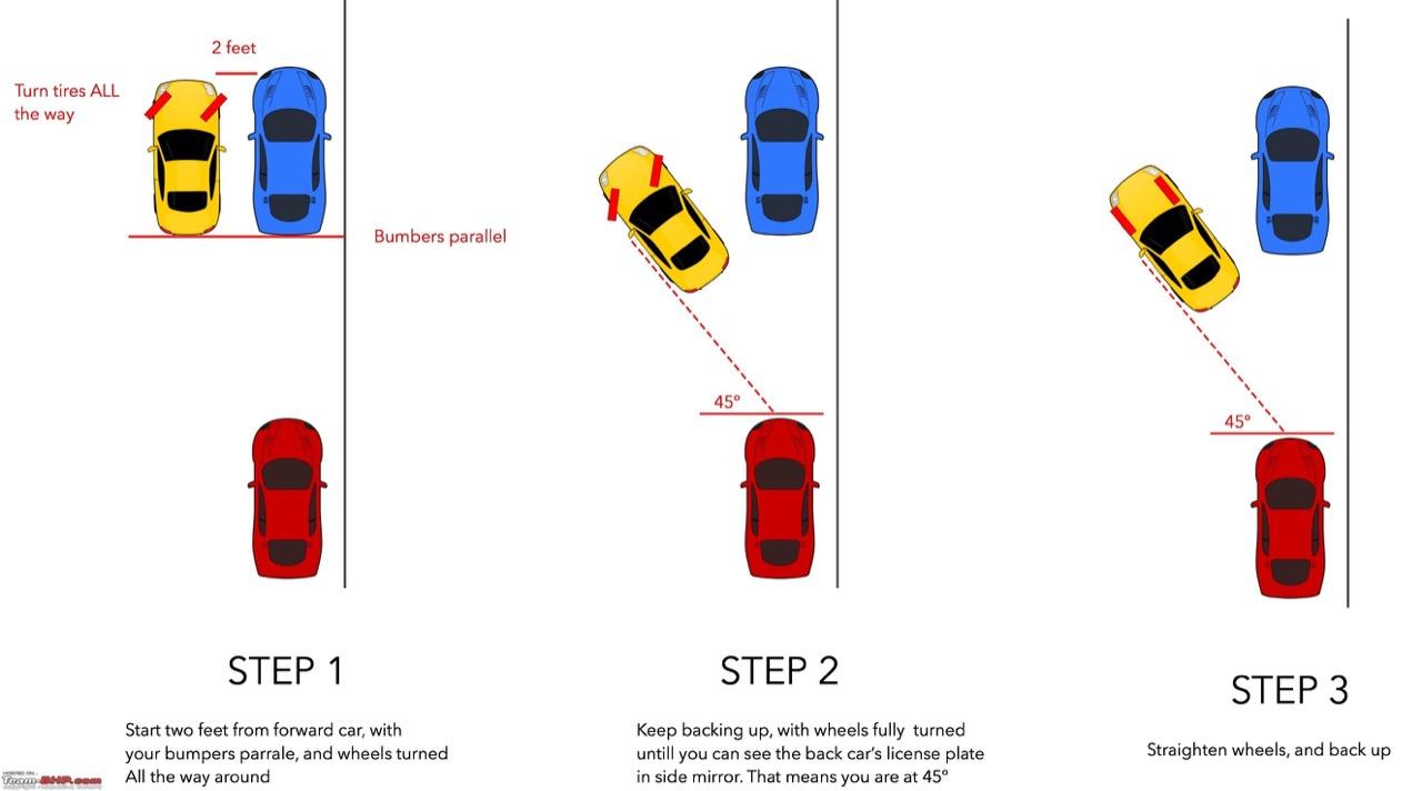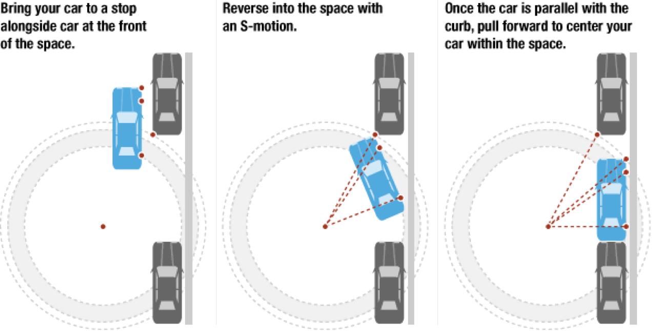 3. ถอยต่อไปเรื่อยๆ ช้าเข้าไว้ ไม่จำเป็นต้องเติมคันเร่ง จนกระทั่งกันชนหน้าของคุณมาอยู่ในระดับเสมอกันกับกันชนหลังของรถคันหน้า ให้หมุนพวงมาลัยไปทางขวาเร็วๆ แต่ยังคงใช้ความเร็วต่ำมากในการถอย จนล้อหลังซ้ายเกือบชิดกับขอบฟุตปาท ในจุดนี้สำหรับท่านที่ใส่ล้อวงโตยางแก้มเตี้ยต้องระวังให้ดีๆ แม็กซ์วงสวยอาจเกิดริ้วรอย หรือแม้แต่ถอยเบียดจนแก้มยางแหก! เมื่อล้อหลังใกล้กับขอบฟุตปาท ก่อนที่จะหยุดรถ ให้หมุนพวงมาลัยกลับมาทางซ้ายให้มากที่สุดจนเกือบจะถึงจุดล็อก เพื่อความสะดวกในการปรับแนวตรงเมื่อขับเดินหน้า