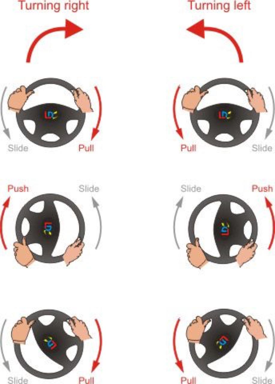 เมื่อจะเลี้ยวยูเทิร์น นักขับส่วนใหญ่ ชอบเอามือสอดเข้าไปด้านในวงพวงมาลัย แล้วเริ่มต้นการหมุน เมื่อจับแบบล้วง หรือควักพวงมาลัย โดยใช้มือจับด้านในของวง จะทำให้คุณเลี้ยวได้ไม่คล่องแคล่ว เท่ากับการรูดมือผ่านวงพวงมาลัยโดยยังคงใช้การจับอยู่ด้านนอก นักแข่งรถส่วนใหญ่จะล็อกการจับพวงมาลัย ในตำแหน่ง 3-9 นาฬิกา เอาไว้ราวกับใช้คีมล็อก เพื่อการบังคับทิศทางที่รวดเร็ว แม้ขณะเข้าโค้งยูเทิร์นด้วยความเร็วสูง ตำแหน่งของการจับก็ไม่มีการเปลี่ยนแปลงแต่อย่างใดทั้งสิ้น