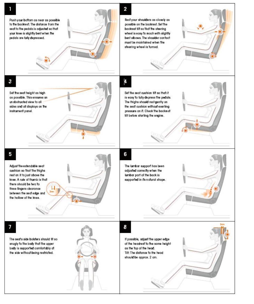 ท่านั่งขับรถที่ถูกวิธีนั้น เริ่มจากการระยะห่างของพวงมาลัย ซึ่งระยะห่างจากพวงมาลัยที่จะทำให้นั่งสบายนั้นควรห่างจากพวงมาลัย 1 ช่วงแขนพอดี โดยที่แขนของคนขับจะต้องไม่หย่อนหรือตึงจนเกินไป ซึ่งระยะแบบนี้จะทำให้มีประสิทธิภาพในการควบคุมทิศทางผ่านพวงมาลัยได้ดีที่สุด อย่าปรับร่นเบาะจนนั่งชิดกับพวงมาลัยมากจนเกินไป (คล้ายคนสูงอายุหรือสุภาพสตรีบางท่านที่ชอบนั่งจนชิดติดกับพวงมาลัย) เพราะการนั่งท่านี้จะทำให้แขนไม่สามารถหมุนพวงมาลัยได้อย่างรวดเร็วหากมีอะไรตัดหน้ารถ การปรับเบาะเอนเบาะแบบนอนขับคล้ายรถสปอร์ตก็ไม่ใช่ท่านั่งที่ถูกต้องเพราะจะทำให้ควบคุมรถได้ยากหากเกิดเหตุฉุกเฉิน แขนที่ตึงมากจนเกินไปจะทำให้ไหล่ของคุณหลุดจากเบาะเมื่อต้องหักพวงมาลัยเร็วๆ เพื่อหักหลบหรือเปลี่ยนทิศทางเพื่อหลบหลีกอุบัติเหตุ