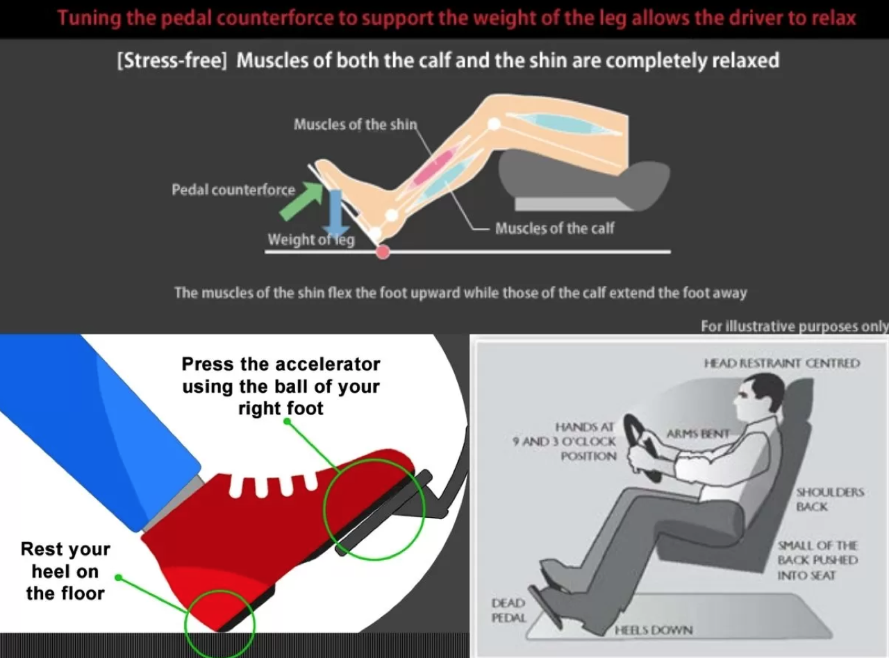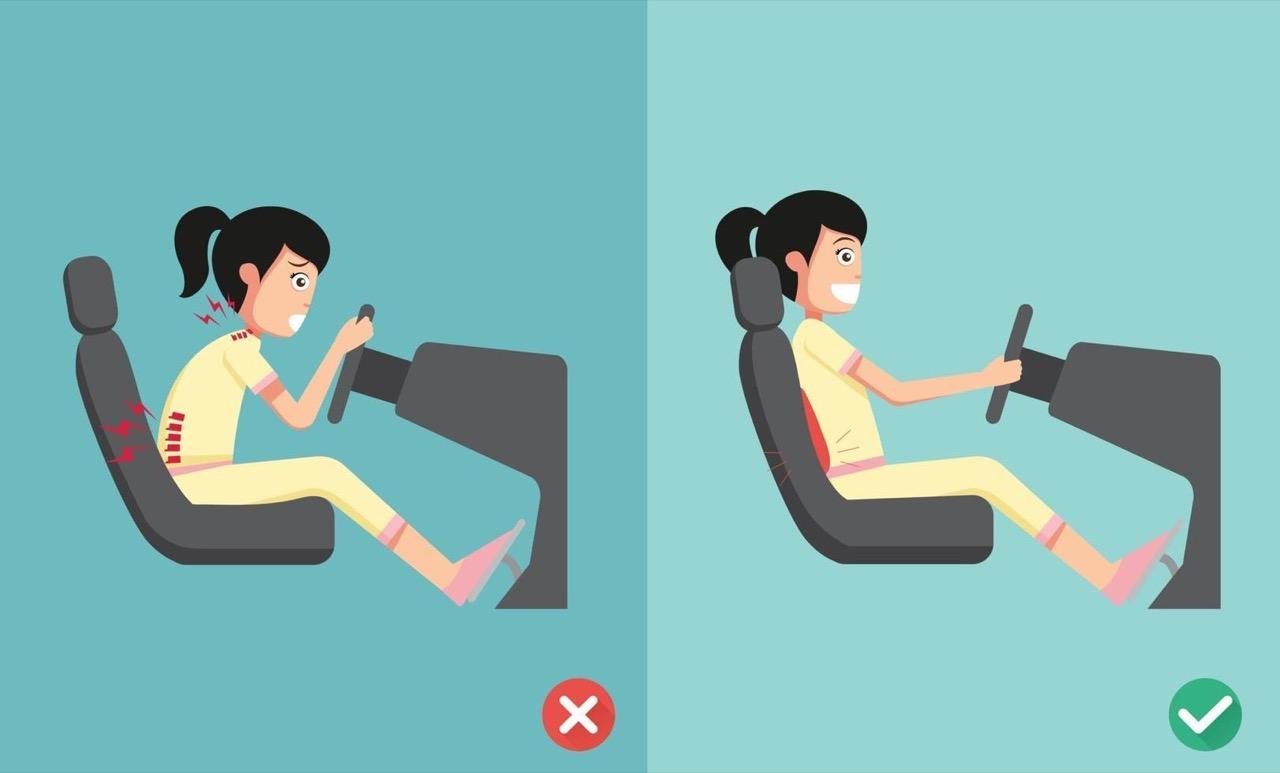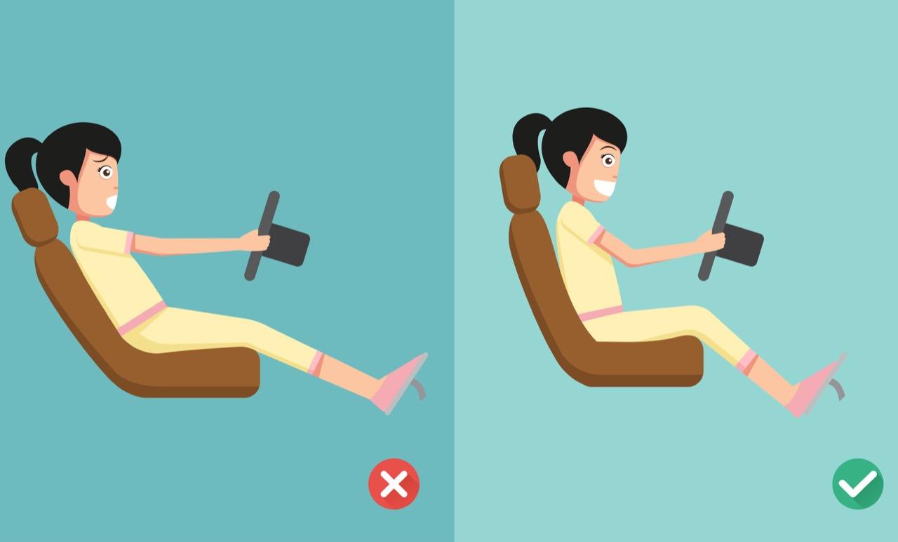 การปรับเบาะให้มีระยะของแขนและขาถูกต้องเหมาะสมกับการควบคุมรถยนต์ ไม่ว่าจะเป็นการเปลี่ยนทิศทางหรือเบรก ปรับเบาะให้ลง นั่งขับทางไกลไม่ปวดหลังปวดเอว ไม่เครียด ควบคุมทั้งพวงมาลัยและแป้นเบรกได้อย่างรวดเร็วทันอกทันใจ เมื่อนั่งขับแบบแขนสั้นขายาวที่ลอกเลียนแบบมาจากท่านั่งในรถแข่ง จะทำให้กระดูกสันหลังยืดเหยียดมากจนเกินไป ทำให้เกิดอาการปวดหลังเมื่อขับไปนานๆ