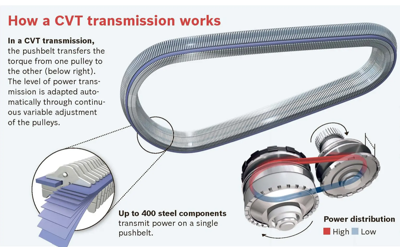 บางคนชอบเรียกว่าเกียร์หนังสติ๊ก เพราะข้างในเกียร์ CVT นั้นจะมีลูกถ้วยที่หมุนๆ ไปตามเครื่องหนึ่งลูก และอีกลูกต่อส่งไปทางเพลาขับ แทนที่จะปรับอัตราทดระหว่างฝั่งเครื่องกับฝั่งเพลาด้วยชุดเฟือง เขาก็ใช้สายพาน CVT (CVT Belt) ซึ่งจริงๆทำมาจากเหล็ก ไม่ใช่ยาง แค่เวลาทำงานมันดูเหมือนยืดหดได้ โดยที่สามารถขยับไปมาบนลูกถ้วยที่มีลักษณะโคนใหญ่แต่ปลายเล็ก การเคลื่อนที่ไปมาของสายพาน CVT สร้างอัตราทดที่แตกต่างระหว่างฝั่งเครื่องยนต์กับฝั่งเพลาขับ (ที่ต่อกับล้อรถ) สิ่งที่ดีของการใช้รูปแบบนี้แทนเฟืองก็คือ มันสามารถเปลี่ยนอัตราทดสูงต่ำได้โดยไม่มีอาการกระตุกให้รู้สึก