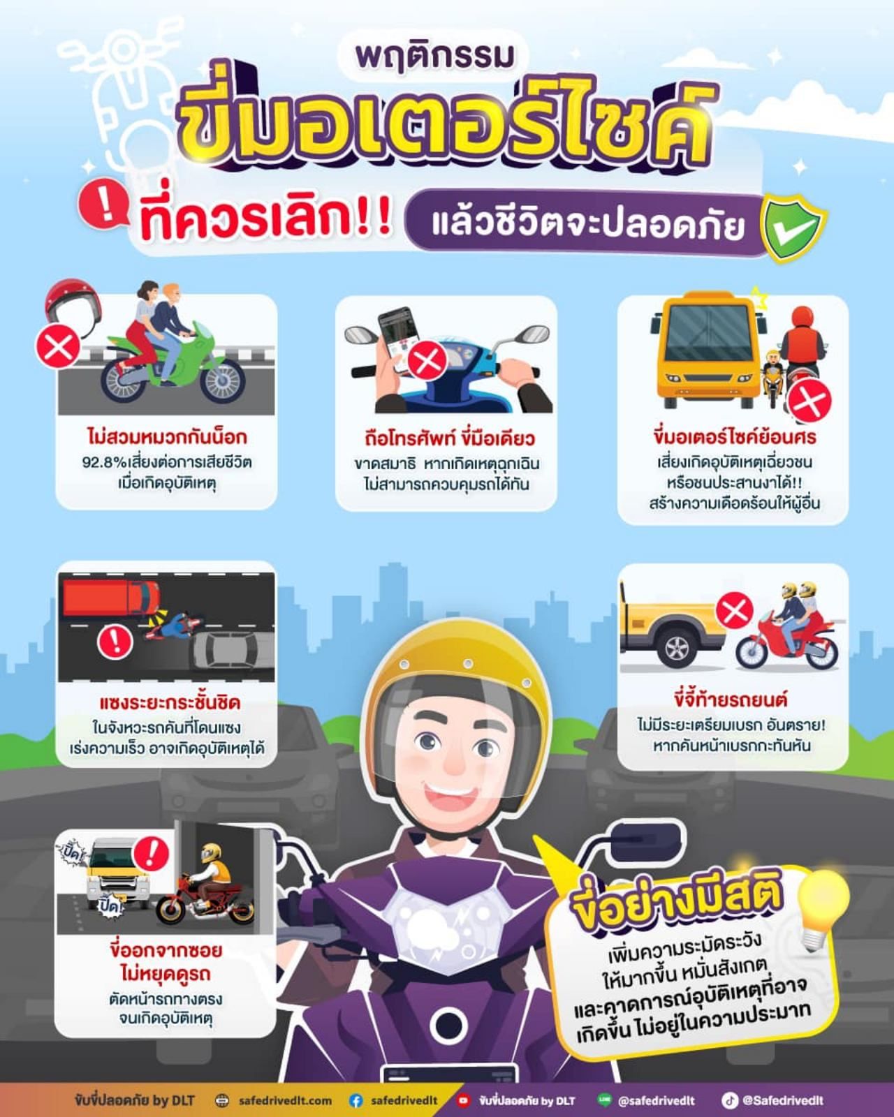 ผู้สื่อข่าวรายงานว่า แฟนเพจเฟซบุ๊ก ขับขี่ปลอดภัย by DLT ภายใต้การดูแลของ สำนักสวัสดิภาพการขนส่งทางบก ได้เผยแพร่พฤติกรรมการขับขี่มอเตอร์ไซค์ที่ควรเลิกแล้วชีวิตจะปลอดภัย โดยมีรายละเอียดังนี้