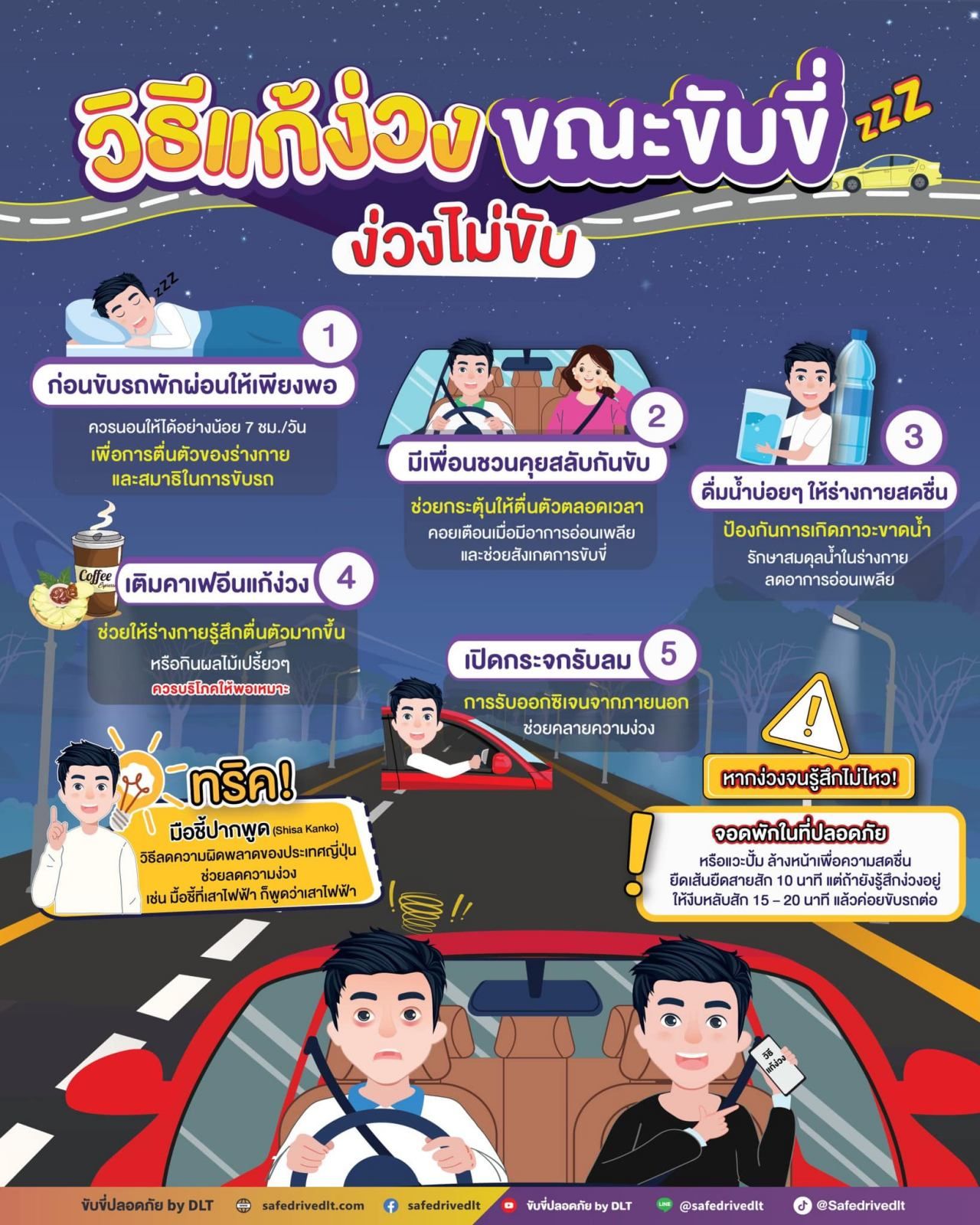 แฟนเพจเฟซบุ๊ก ขับขี่ปลอดภัย by DLT ภายใต้การดูแลของ สำนักสวัสดิภาพการขนส่งทางบกได้บอกเทคนิคแก้ง่วงตอนขับรถเดินทางไกล โดยมีรายละเอียดดังนี้